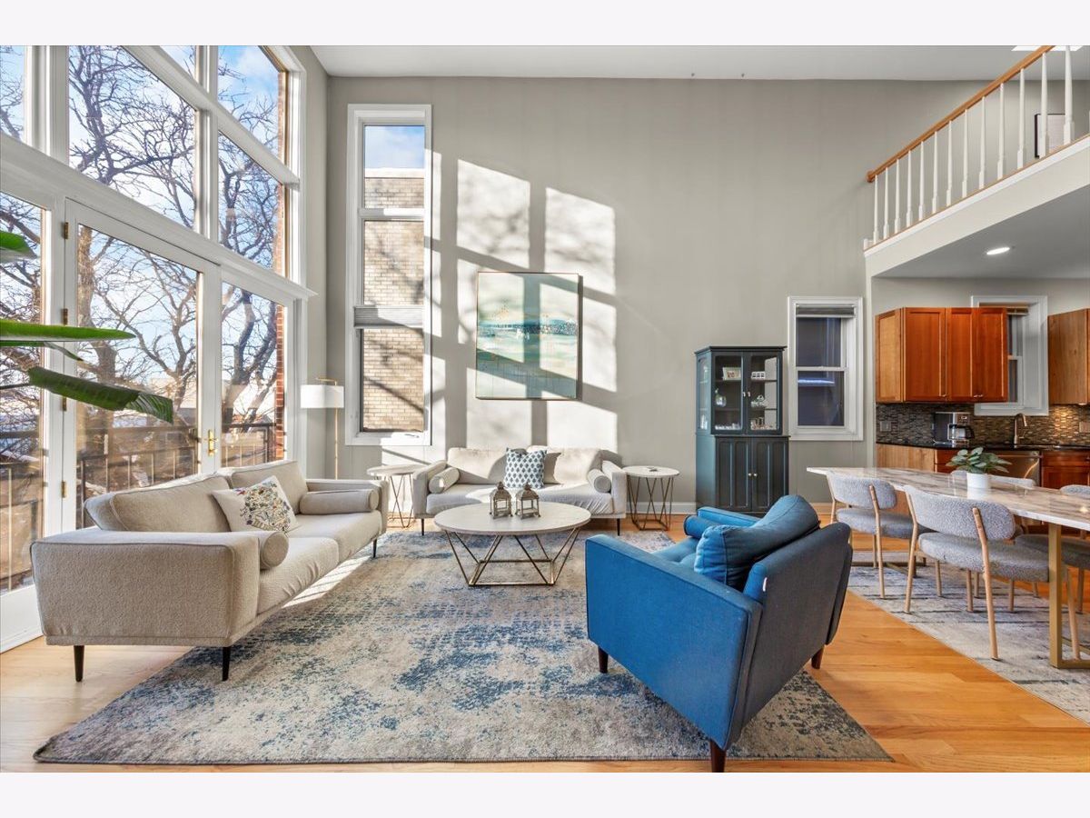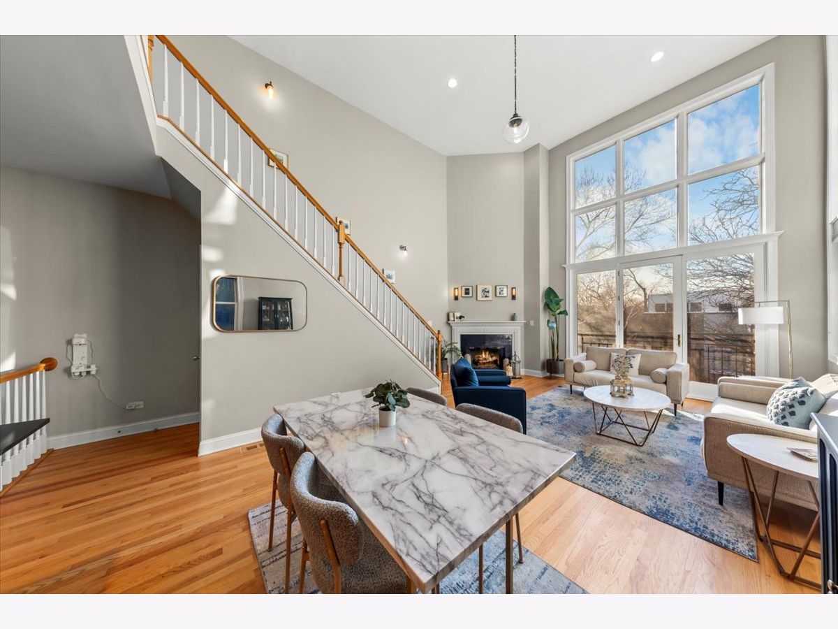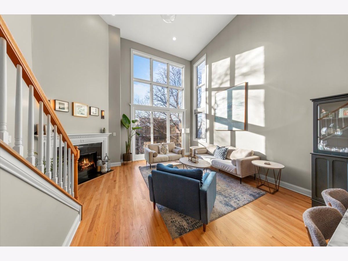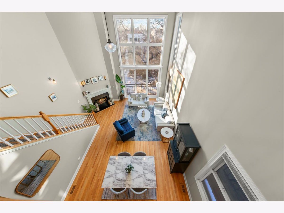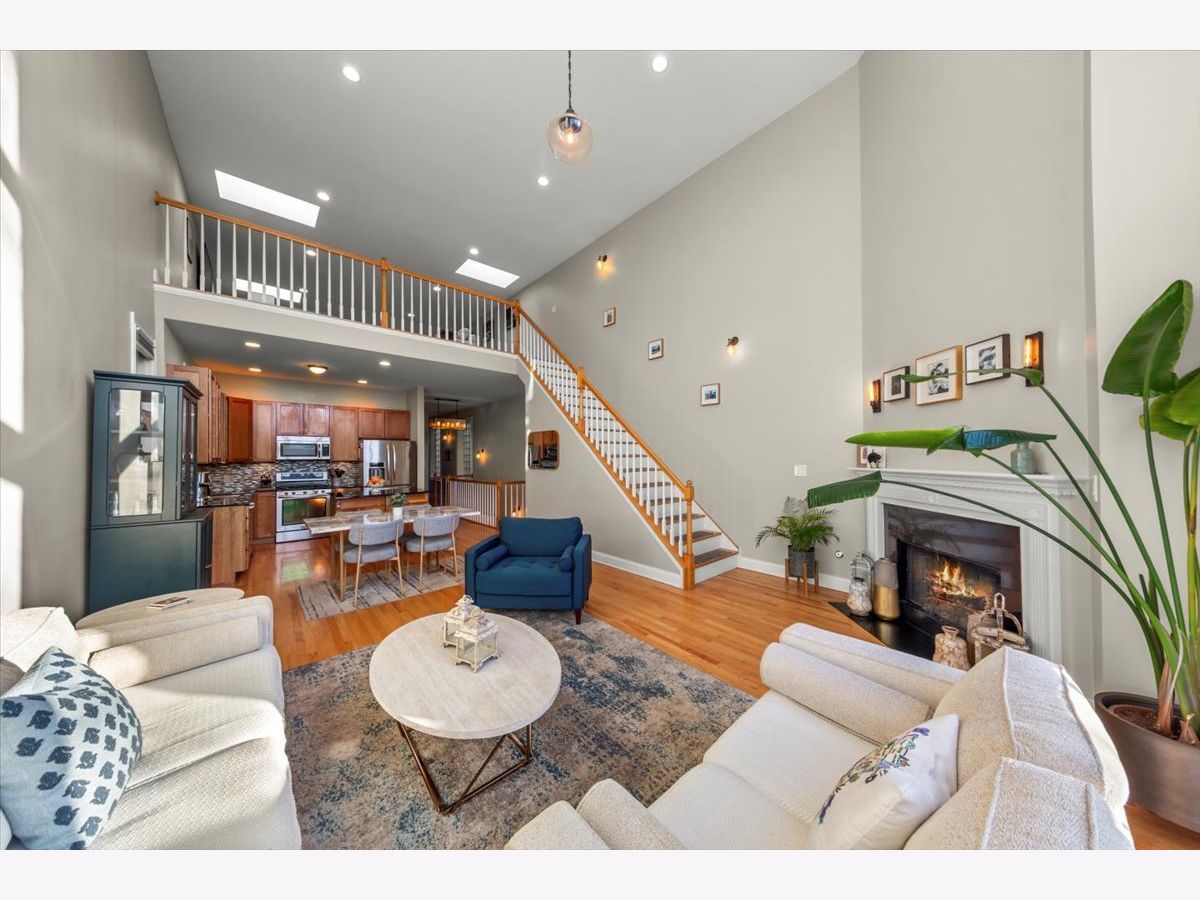 Gorgeous penthouse duplex up in highly desirable Bucktown. Soaring 20 ft. floor to ceiling windows flood the space with incredible natural light. Two living spaces! Kitchen features stainless appliances, shaker cabinets, stone countertops and island seating and is ideally open to the oversized living/dining space. Plenty of room for a dining table and separate seating area. Don't miss the lovely fireplace and hardwood floors. Huge upstairs family room with skylights and modern half bath that leads directly to large deck with city views! Primary bedroom and en suite bath; dual vanity sinks, separate tub and shower. Nicely sized second bedroom and updated hall bath. Garage parking and storage included. Washer/Dryer 2024, Furnace 2025 and New roof (2024) and tuckpointing (2023). Walk to wonderful Bucktown shops, Holstein Park, restaurants and transportation.
