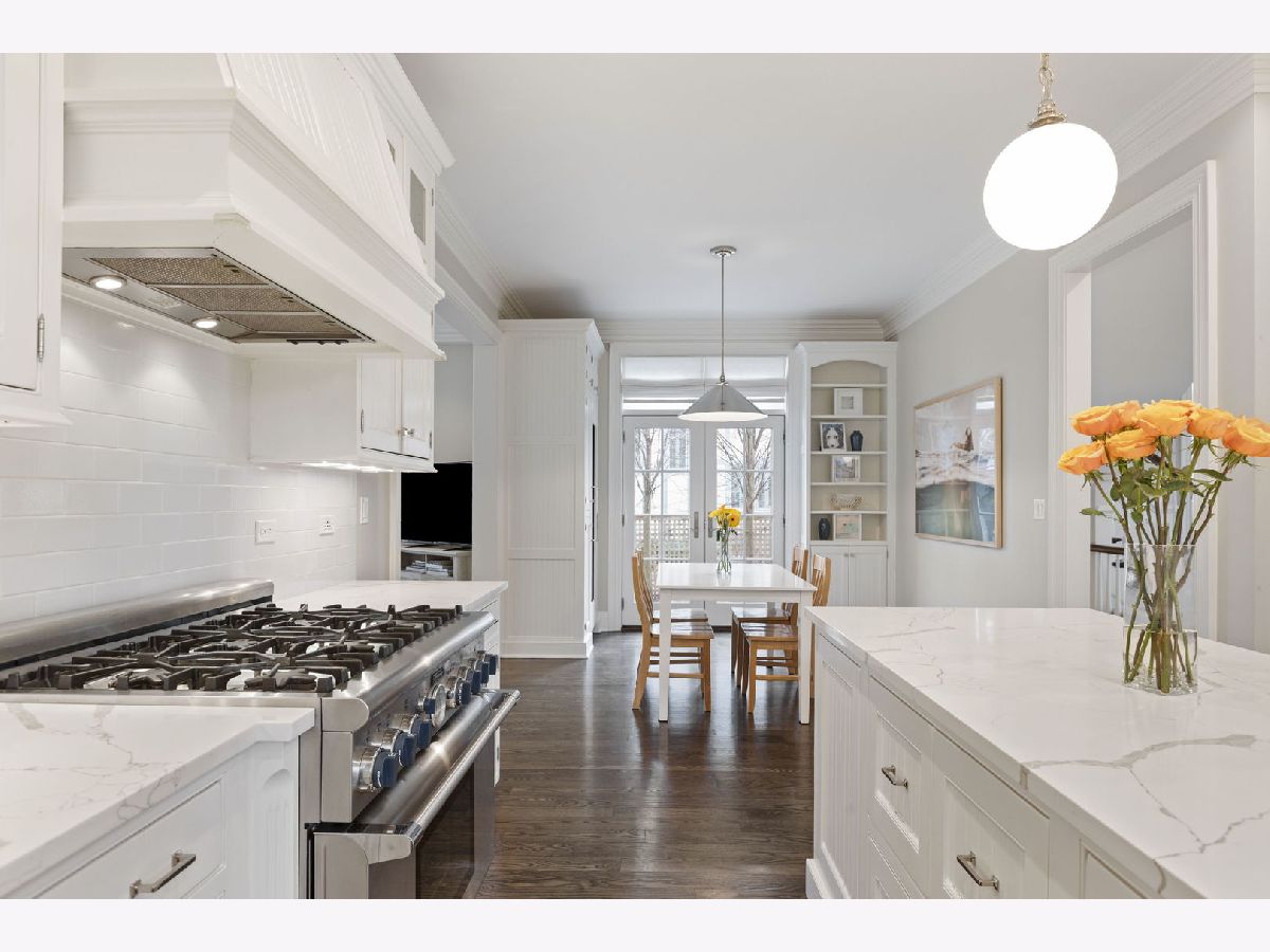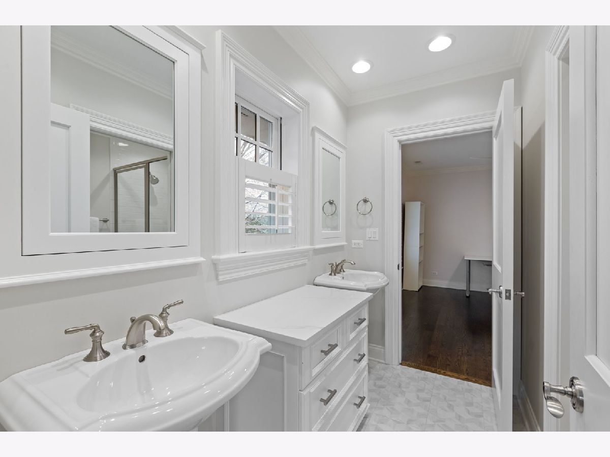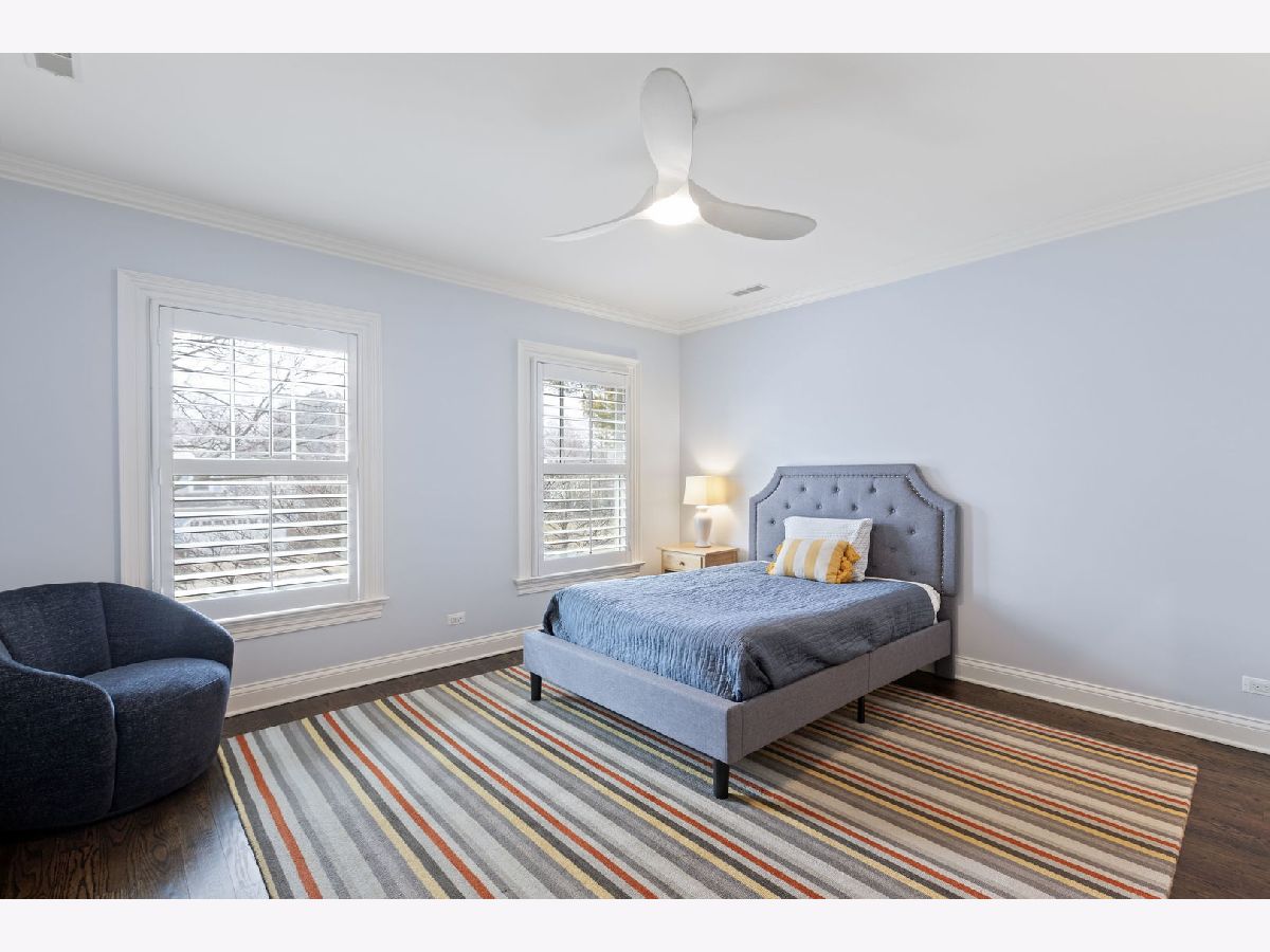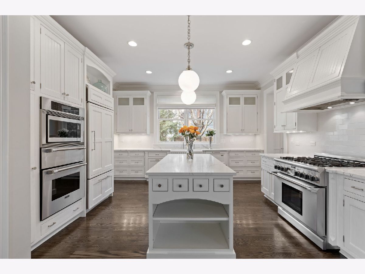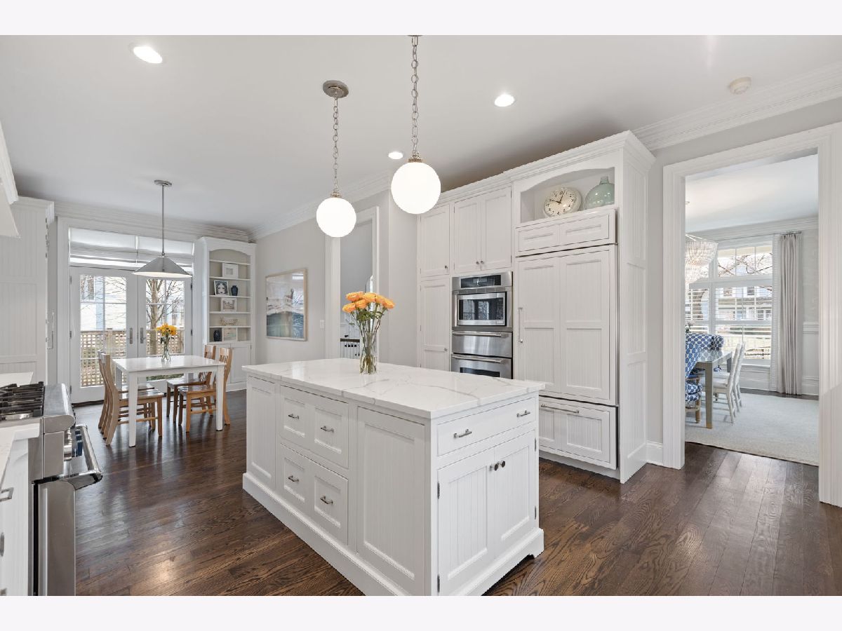 Crafted in 2006 by the Goebeler Company and designed by Lake Forest Landmark Development, this New England shingle-style home carries the character of a historic property with modern amenities. Inside, timeless architectural details anchor the interiors including 10-ft. ceilings, wainscoting, crown molding, tray ceilings, intricate woodwork, hardwood floors, and built-ins. A welcoming front porch introduces you to a spacious formal entry with European closets. To the right, an octagon-shaped living room features a gas fireplace and built in cabinet for games or a dry bar. To the left, a large dining room with Cole & Sons wallpaper and beaded chandelier set the scene. Pass through to the gourmet all white kitchen with Subzero and Thermador appliances, farmhouse sink, quartz countertops, a large kitchen island, and space for a breakfast table. The kitchen leads to a sunny family room, and both rooms feature French doors to the patio with gas Weber grill. A mudroom with beadboard, slate tile and floor to ceiling cabinetry includes convenient access to the driveway and side yard, a powder bath, and laundry room. The upstairs primary suite doubles as a sanctuary with a fireplace, large walk-in closet, and a spa-inspired bath with heated floors, walk-in shower, dual vanities, and soaking tub, all meant to evoke calm. Three additional bedrooms and two baths are upstairs. The finished basement adds 1,602 square feet and includes a large rec space, flexible office or den with a fireplace, exercise room, plus a private fifth bedroom with full bath and steam shower-perfect for guests, in-laws, or au pair. Modern systems include a standby generator, two-system HVAC, insulated 2-car detached garage. A picture-perfect setting in East Lake Bluff, only a few blocks from downtown, the Metra, and Lake Michigan. Move-in ready and enjoy it from day one.