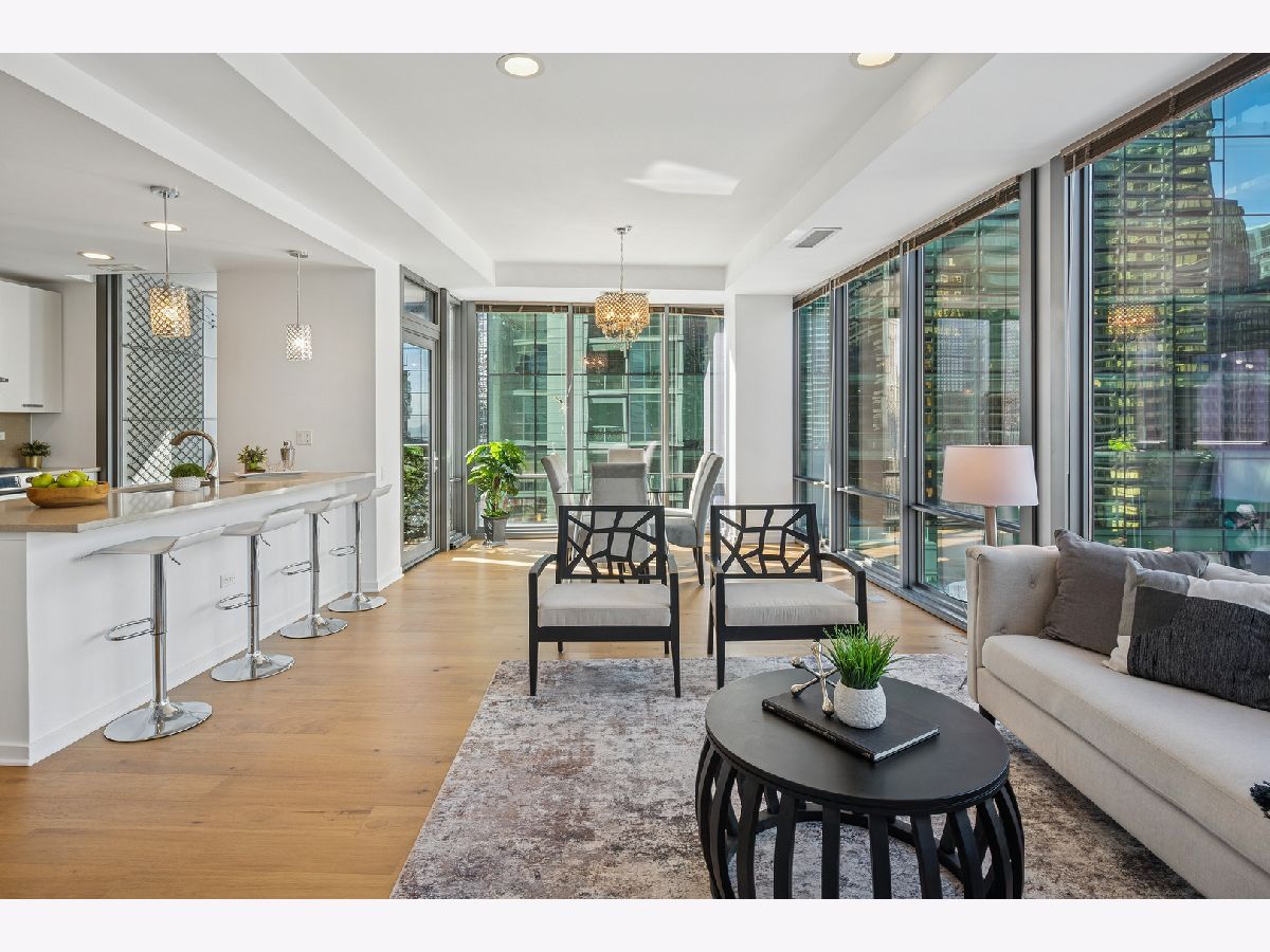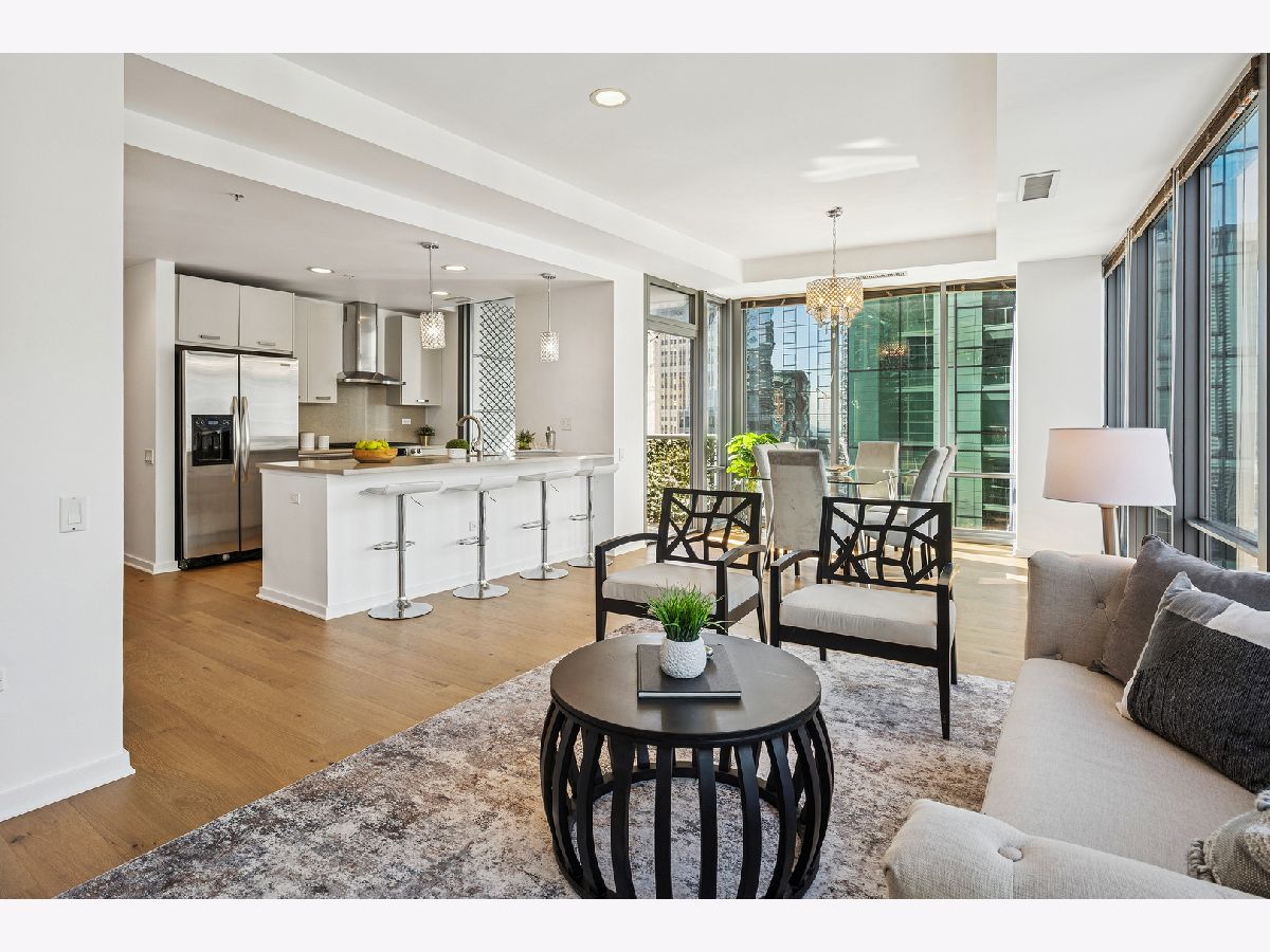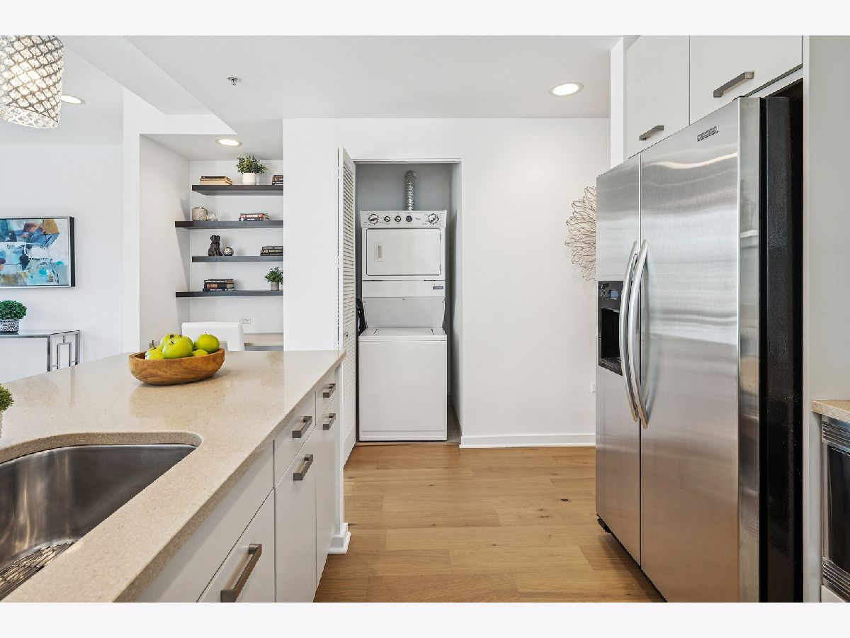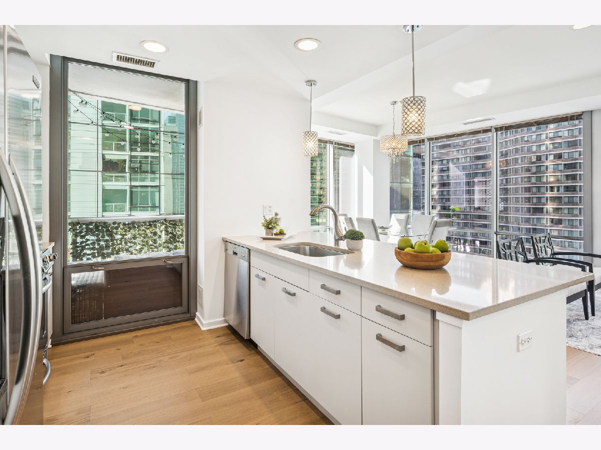 An exceptional CORNER Streeterville residence offering style, light, and an unbeatable downtown location. This thoughtfully designed one-bedroom, one-and-a-half bath home spans approximately 1,025SF and is flooded with natural light from striking floor-to-ceiling NORTH-facing windows. Brand-new sleek wide-plank engineered hardwood flooring flows seamlessly throughout the open living spaces, creating a warm, refined aesthetic. The sleek, modern kitchen is both beautiful and functional, featuring quartz countertops, a full-height backsplash, oversized undermount sink, gas range with hood, and newly refreshed CREAM cabinetry-perfect for everyday living and entertaining. The spacious bedroom serves as a true retreat with a large walk-in closet, while a dedicated work-from-home niche with built-in shelving and data connectivity adds flexibility and convenience to the main living space. Additional highlights include in-unit washer/dryer and a well-appointed powder room ideal for guests and rare in a one bed. Step outside to your private west-facing balcony and take in iconic city views-an ideal backdrop for sunset cityscapes. Located in a full-amenity building with deeded parking available for an extra $30k. This home delivers elevated urban living in one of Chicago's most desirable and highly walkable neighborhoods. Building amenities include a 24-hour doorman, state-of-the-art fitness center, outdoor pool and terrace, party room, movie theater, dog run, on-site management, and more. Storage locker included. Just steps from Navy Pier, Lake Michigan, the Riverwalk, boat slips, coffee shops, Michigan Avenue shopping, transit and world-class dining - this condo offers the very best of Chicago living. Now showing.