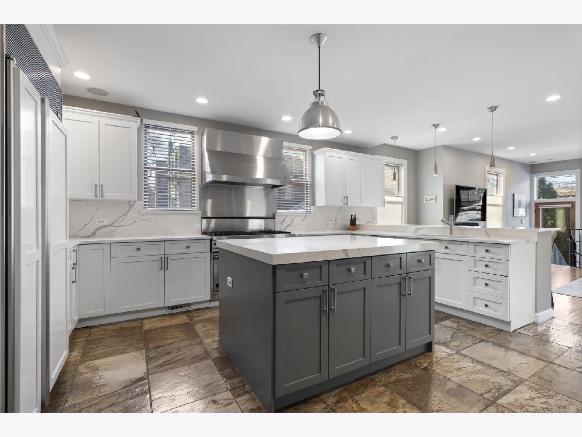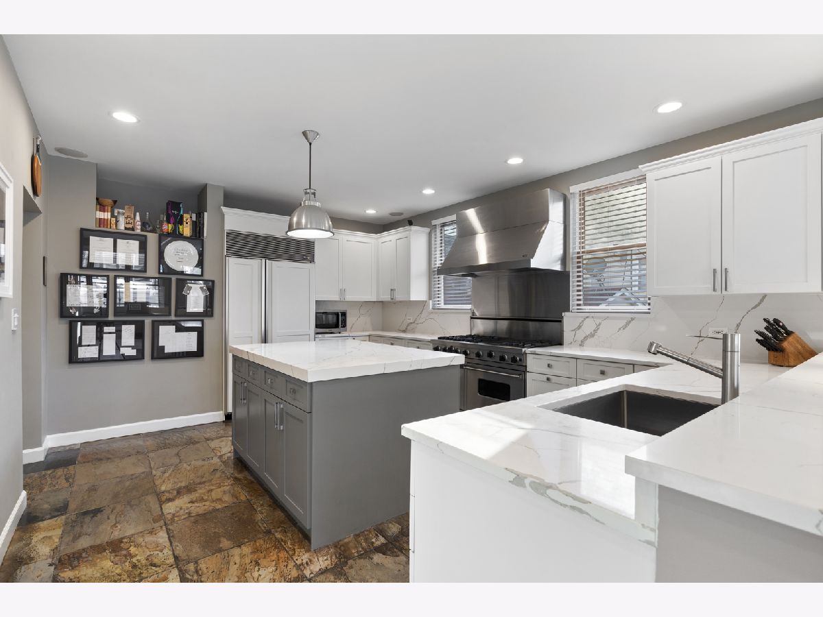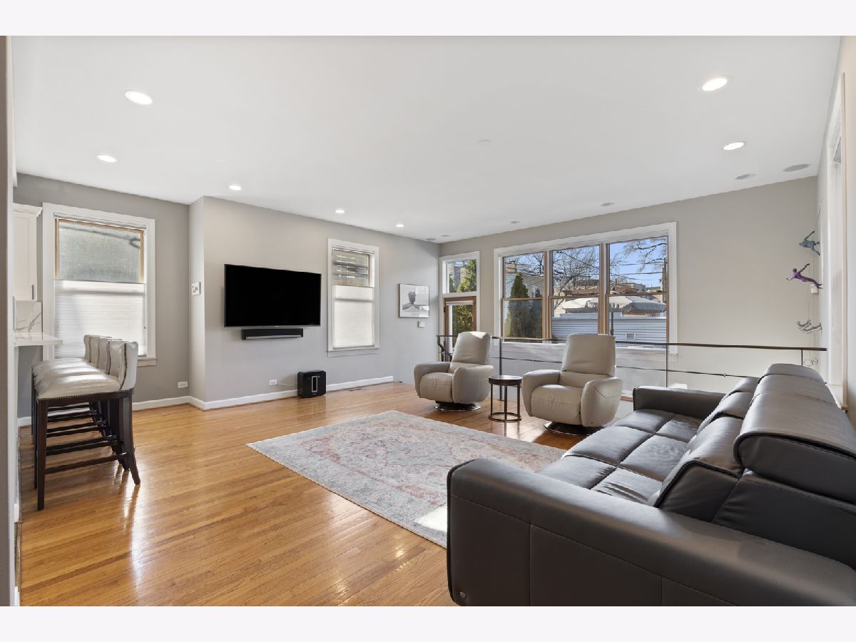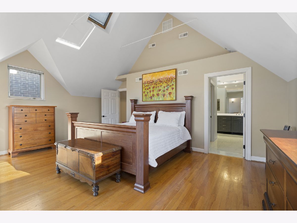 Tremendous home situated on a 32-foot-wide lot with remarkable curb appeal and an inviting front porch. This well-appointed 4-bedroom, 3.1-bath residence offers unparalleled natural light from the south and west exposures. A functional layout, quality updates, and meticulous maintenance make this home truly turnkey. A unique side entrance leads into a dramatic two-story atrium featuring an open staircase and skylights. The oversized, updated white kitchen is equipped with professional-grade appliances, a spacious island, and breakfast bar, and opens to an extra-wide great room with three walls of windows. A separate formal dining room with fireplace provides exceptional entertaining space, enhanced by large French doors that open to the covered front porch. The second level includes three well-appointed bedrooms, two full baths, and convenient laundry. The spacious primary suite features vaulted ceilings, skylights, and an updated, oversized bathroom with double vanity, separate shower and tub, and a large walk-in closet. The lower level offers a generous family room with radiant heated floors, fireplace, and wet bar, along with an additional bedroom and full bath-ideal for guests. Outdoor living is equally impressive with a newer synthetic deck and patio, perfect for entertaining. Complete with a three-car garage.