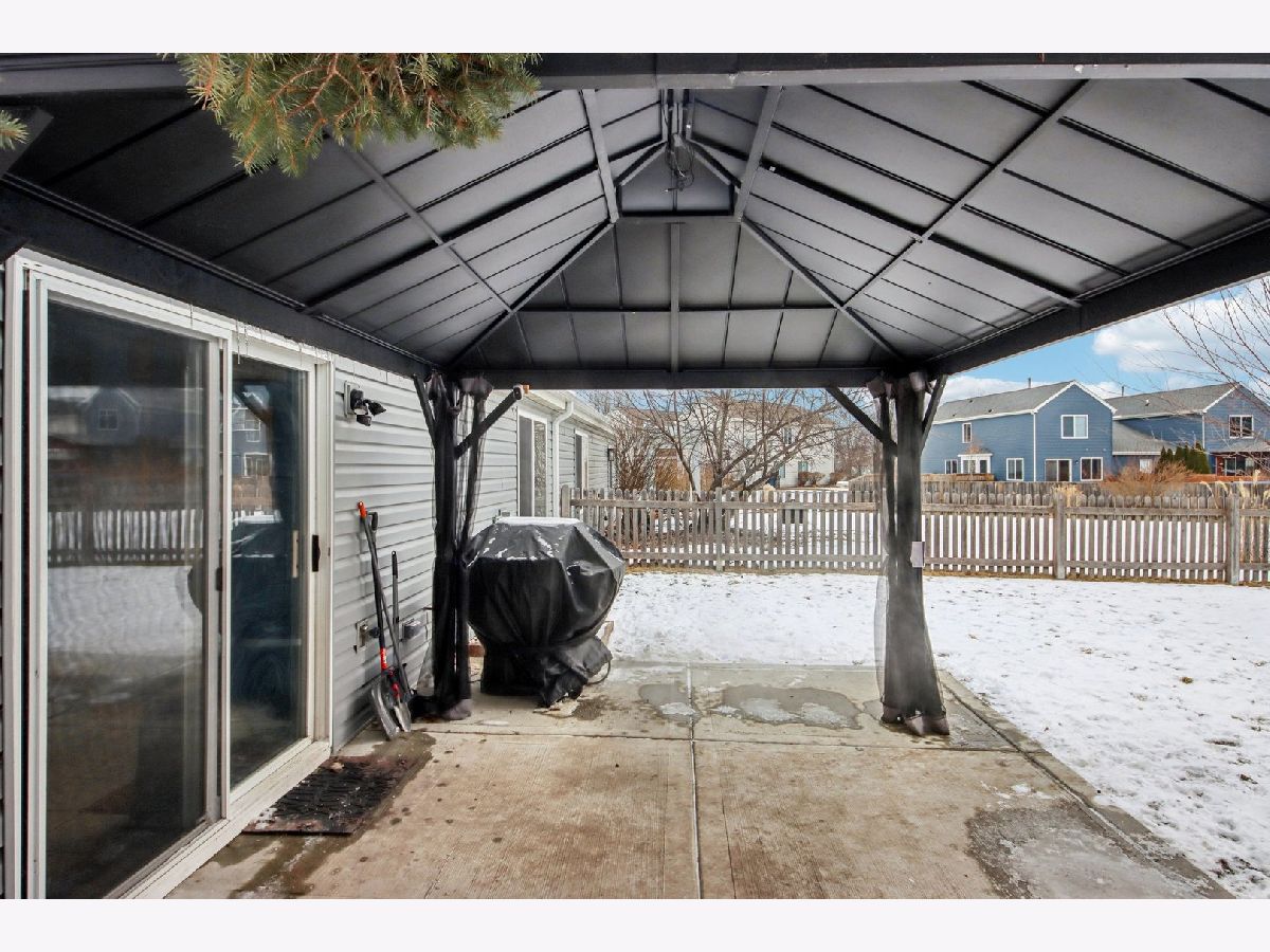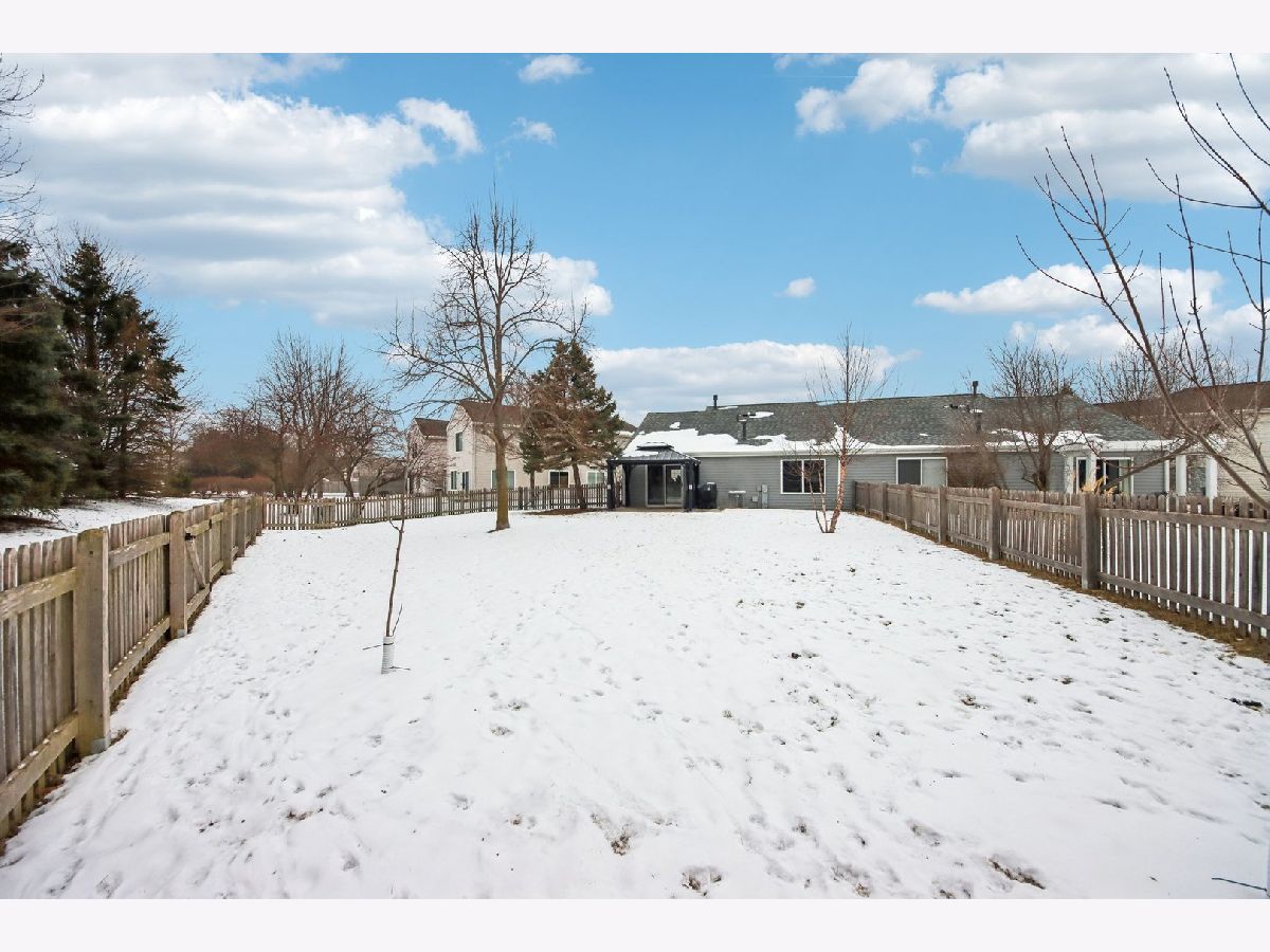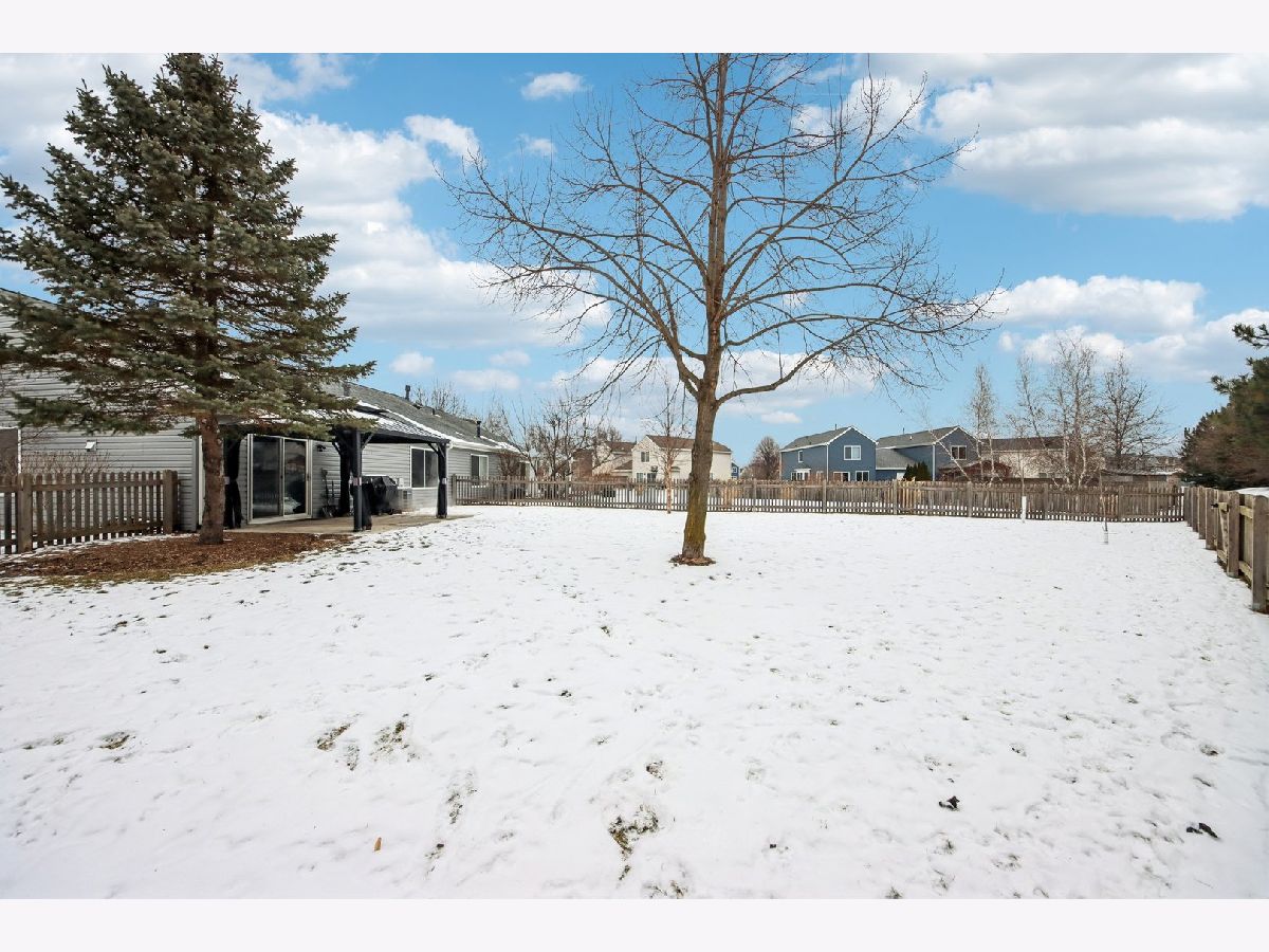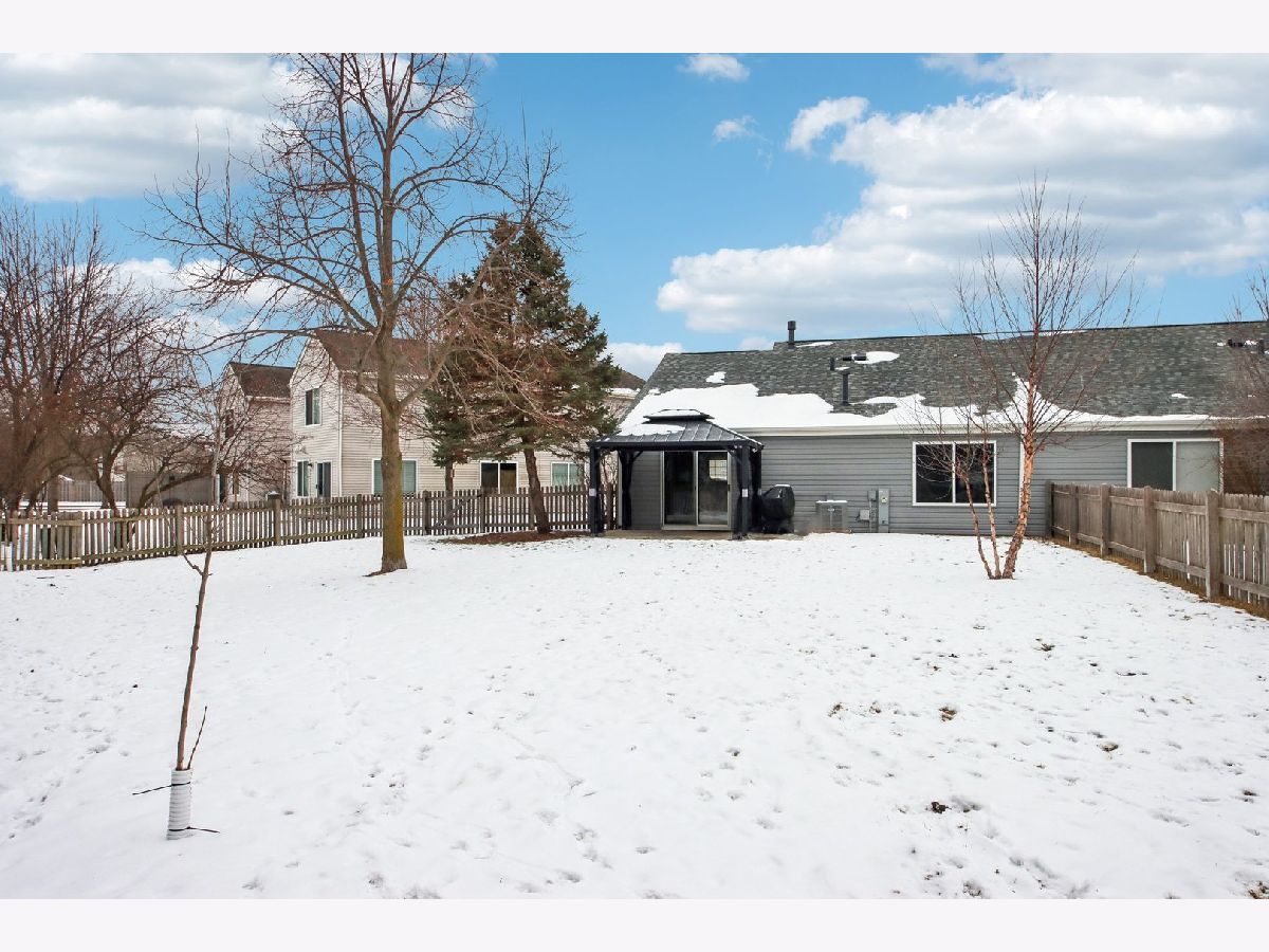 This inviting one-story half-duplex in Montgomery Crossings offers easy living with thoughtful features inside and out. Set on a fenced and landscaped lot with paver landscape edging from the front to back of house, a covered front porch, a spacious patio, and a peaceful backyard that backs to open space, making it easy to enjoy daily walks, nearby parks, and the network of bike and walking paths. Additional outdoor features include a berm with mature trees and no neighbors behind, as well as young trees recently planted, ensuring optimal future shade. Inside, modern neutral decor pairs beautifully with a vaulted living room that flows into the dining area, creating a bright and open feel. The eat-in kitchen features 42-inch custom cabinetry and a sliding door that leads right out to the patio, perfect for everyday meals or entertaining. The primary bedroom includes a walk-in closet and private bath with a walk-in shower, while the second bedroom sits just steps from a full hall bathroom with a tub/shower combo, a standout feature for this community. A two-car tandem garage offers pull-down stairs to a floored attic and built-in custom cabinetry for additional storage, and with no HOA fees, this home delivers flexibility and value. Enjoy summer evenings watching the Fourth of July fireworks from your own patio, with pricing that reflects the age of the roof for added opportunity. Brick fireplace wall and new mantle - 2020, TV closet created - 2020, new roof & siding (another standout feature within the community), and gutter - 2023, new furnace heat exchanger - 2024, new humidifier installed - 2024, water softener - 2023, fence - 2021, patio - 2022, gazebo - 2023, attic ladder - 2023. New roof and siding, patio with gazebo, large fenced-in yard (one of the largest in the neighborhood), custom stone fireplace wall with mantle and gas fireplace, new water softener, new humidifier, cul-de-sac location, near trails and forest preserve, walking distance from park and basketball court.