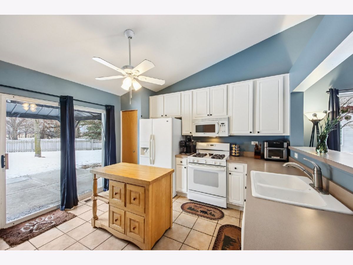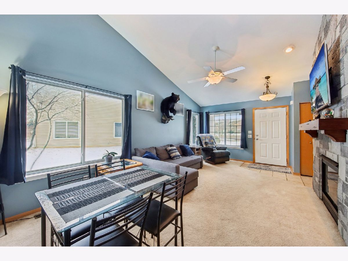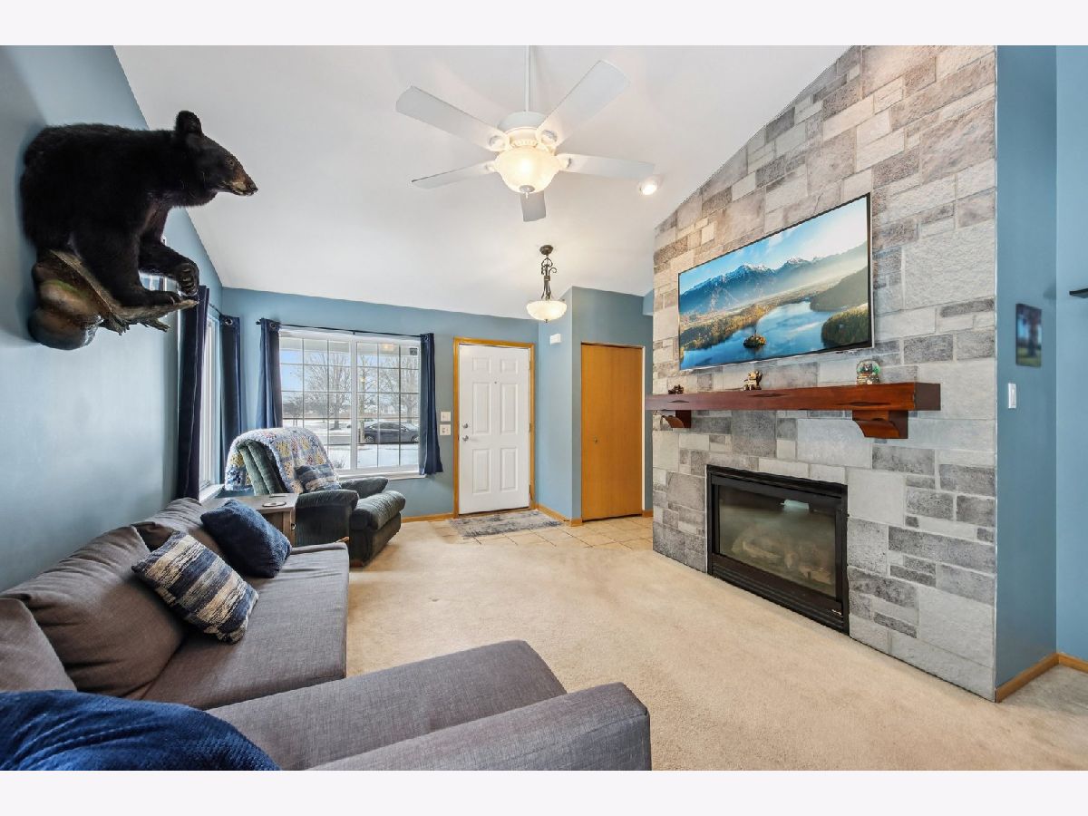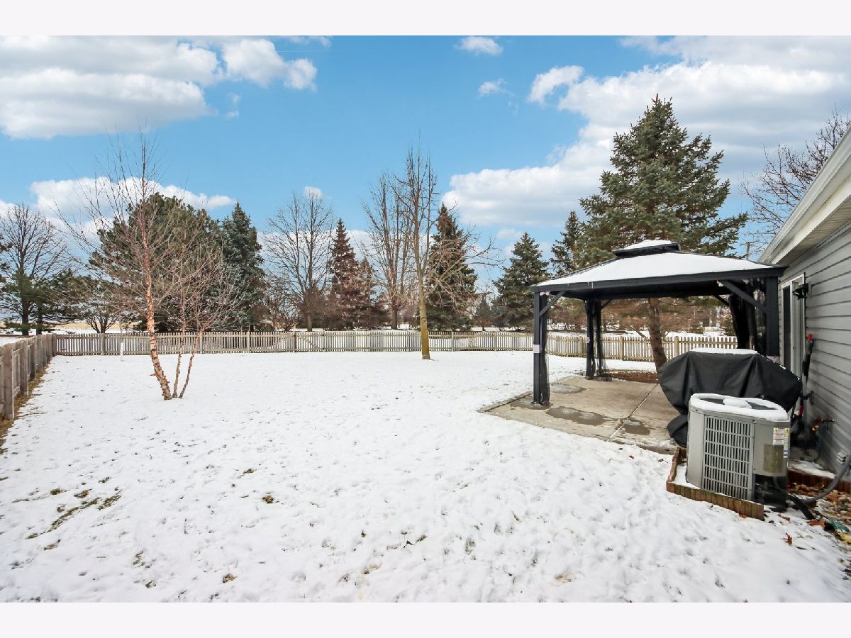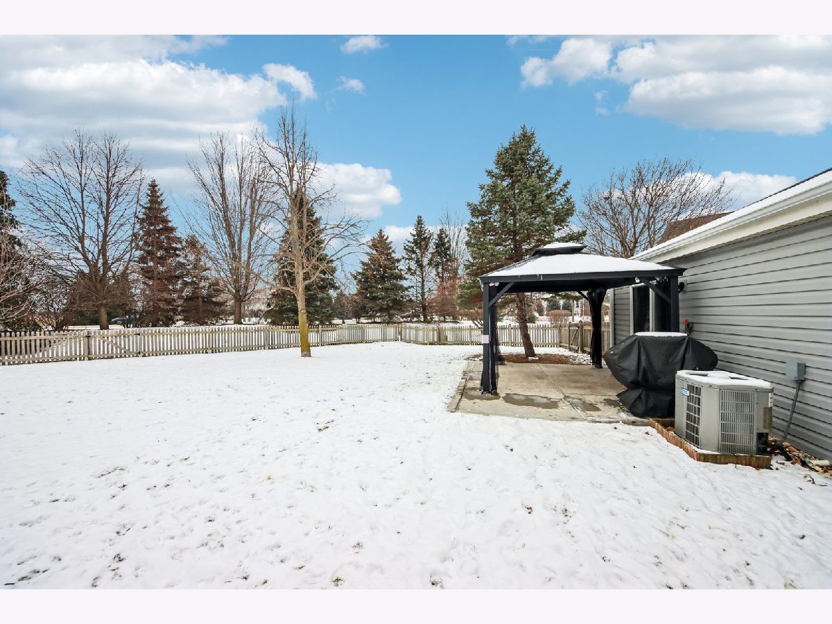 This inviting one-story half-duplex in Montgomery Crossings offers easy living with thoughtful features inside and out. Set on a fenced and landscaped lot with paver landscape edging from the front to back of house, a covered front porch, a spacious patio, and a peaceful backyard that backs to open space, making it easy to enjoy daily walks, nearby parks, and the network of bike and walking paths. Additional outdoor features include a berm with mature trees and no neighbors behind, as well as young trees recently planted, ensuring optimal future shade. Inside, modern neutral decor pairs beautifully with a vaulted living room that flows into the dining area, creating a bright and open feel. The eat-in kitchen features 42-inch custom cabinetry and a sliding door that leads right out to the patio, perfect for everyday meals or entertaining. The primary bedroom includes a walk-in closet and private bath with a walk-in shower, while the second bedroom sits just steps from a full hall bathroom with a tub/shower combo, a standout feature for this community. A two-car tandem garage offers pull-down stairs to a floored attic and built-in custom cabinetry for additional storage, and with no HOA fees, this home delivers flexibility and value. Enjoy summer evenings watching the Fourth of July fireworks from your own patio, with pricing that reflects the age of the roof for added opportunity. Brick fireplace wall and new mantle - 2020, TV closet created - 2020, new roof & siding (another standout feature within the community), and gutter - 2023, new furnace heat exchanger - 2024, new humidifier installed - 2024, water softener - 2023, fence - 2021, patio - 2022, gazebo - 2023, attic ladder - 2023. New roof and siding, patio with gazebo, large fenced-in yard (one of the largest in the neighborhood), custom stone fireplace wall with mantle and gas fireplace, new water softener, new humidifier, cul-de-sac location, near trails and forest preserve, walking distance from park and basketball court.