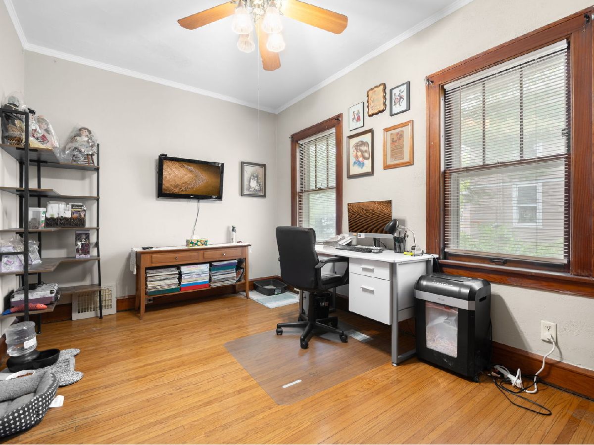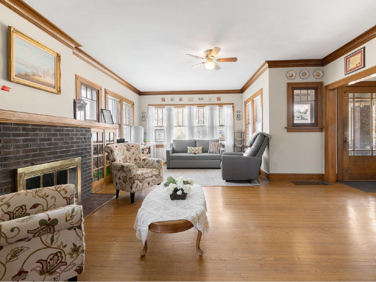 Charming vintage brick bungalow just minutes from downtown Elgin! This beautifully maintained home features original hardwood floors and rich natural woodwork throughout, blending timeless character with modern updates. The spacious living room showcases a classic wood-burning brick fireplace, flanked by mission-style built-in bookcases, while elegant oak crown molding flows seamlessly into the formal dining room. The main level is filled with natural light and has been freshly painted, creating a warm and inviting atmosphere. You'll find two generously sized bedrooms and a full bath on the main floor. The kitchen offers charming vintage built-ins along with brand-new stainless steel appliances. An interior staircase leads to a large, floored attic perfect for future expansion or additional living space. The finished basement provides even more room to enjoy, featuring a spacious recreation area with a gas log fireplace, a third bedroom with a large walk-in closet, plus a utility room with workspace and an additional flex room. The fully finished basement also offers its own private entrance, making it ideal for potential in-law living. Relax outdoors on the welcoming front porch or unwind on the patio overlooking a peaceful yard, perfect for enjoying a delicious, juicy peach from your very own tree or picking fresh mint growing in the yard for all your favorite recipes. The property also includes a storage shed and a driveway with space for multiple vehicles (no garage). Ideally located near schools, downtown Elgin, the Metra station, and Wing Park. Home is being sold AS IS. Showings during the week are anytime after 2 and anytime on the weekend. Schedule your showing today.