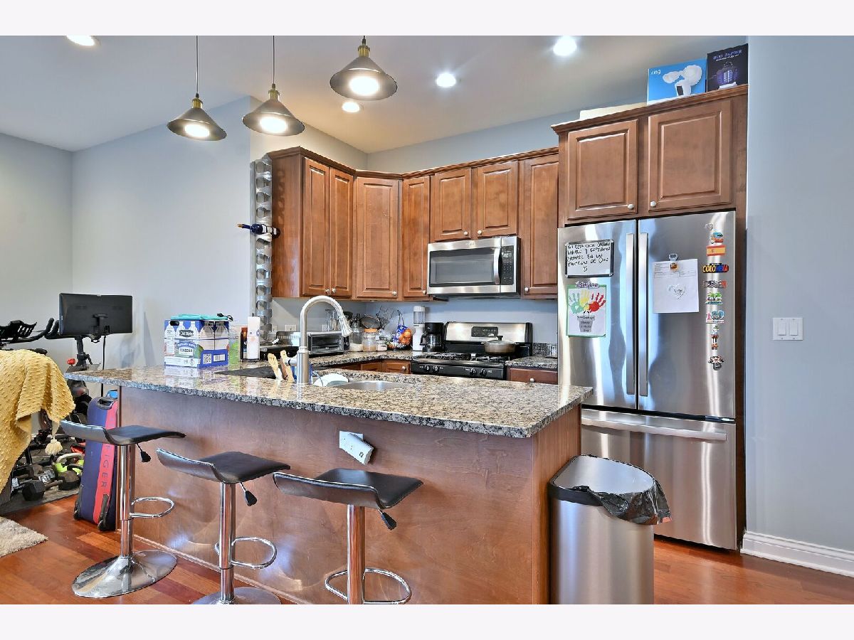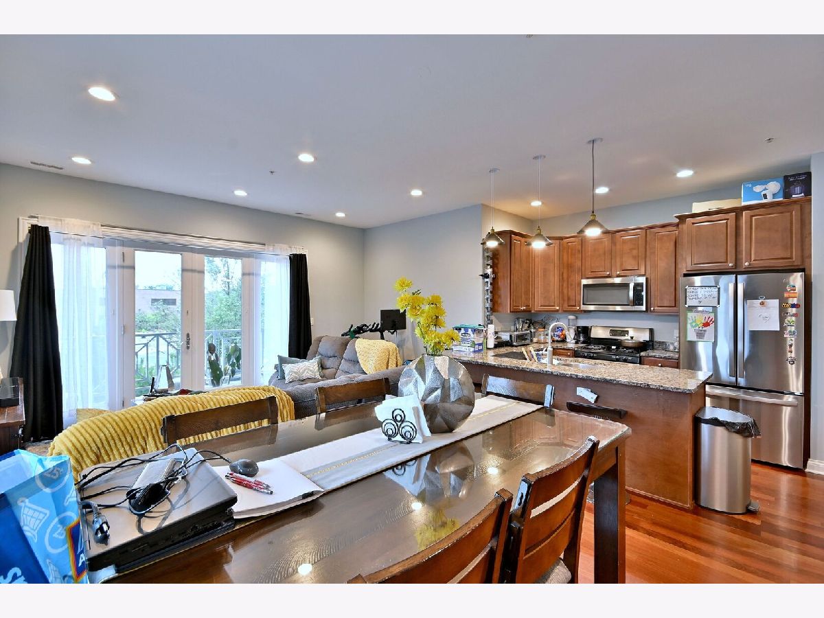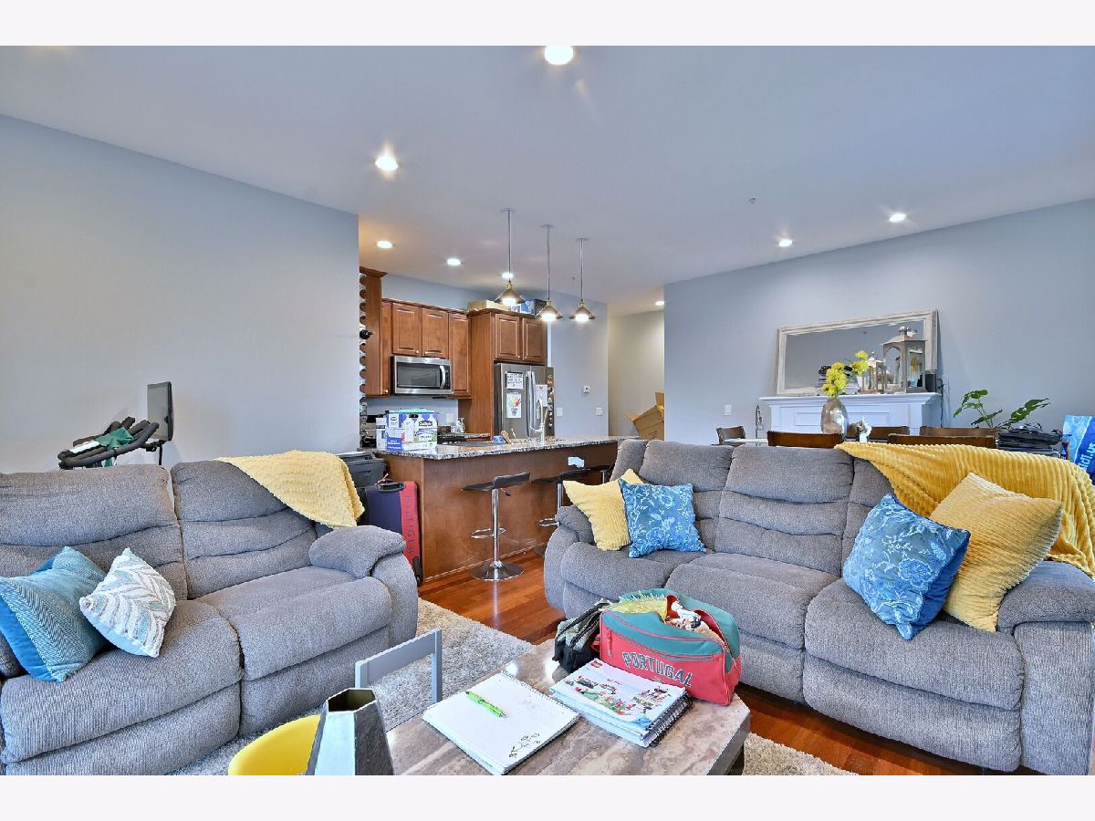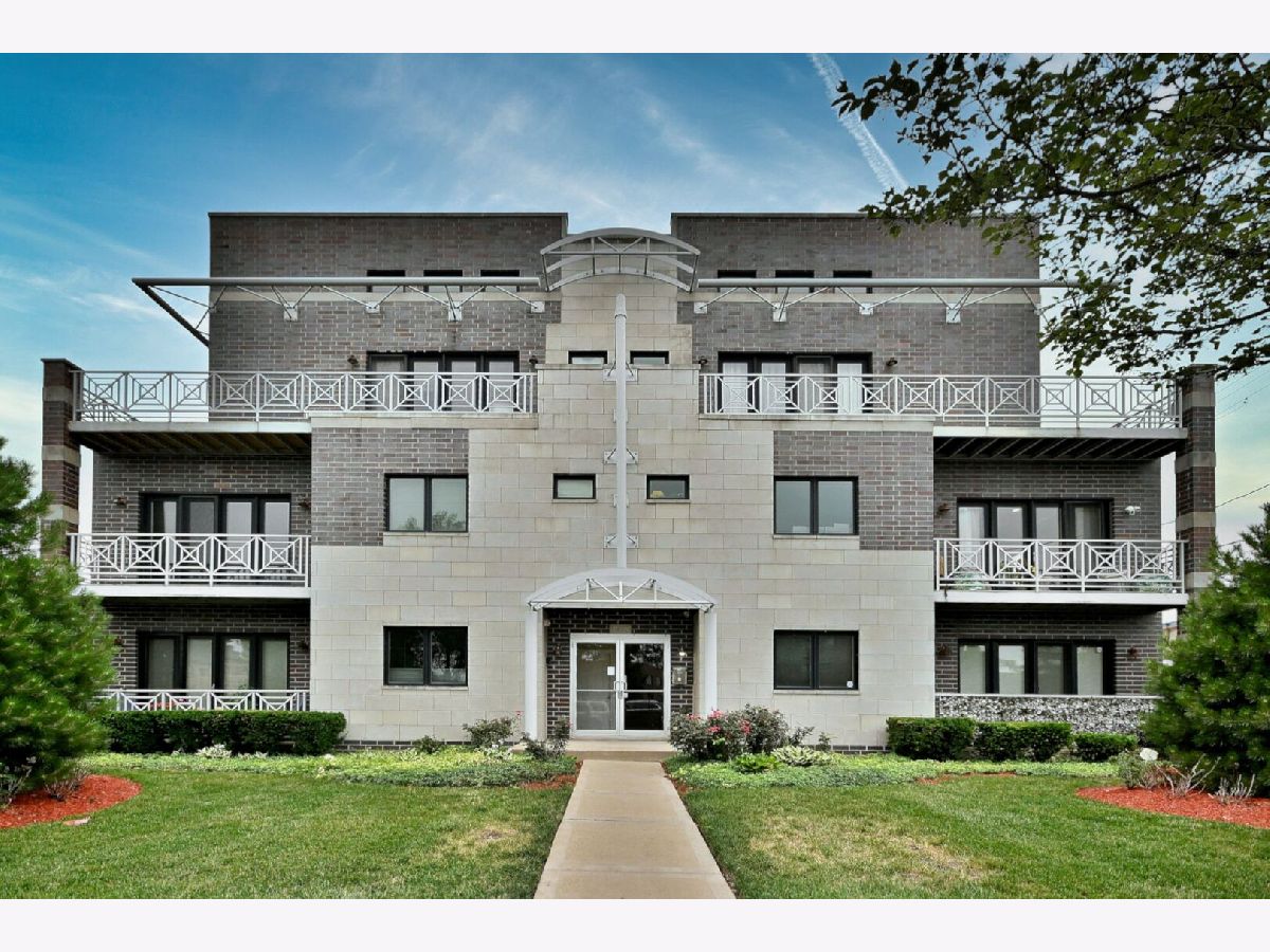 Welcome to this beautiful 2-bedroom, 2-bathroom apartment located in the heart of Elmwood Park, just a few steps from the Metra station with direct access to Downtown Chicago! Situated in a newer building (built in 2007). This spacious apartment features hardwood floors throughout, a bright and open layout, and is in excellent, move-in-ready condition. The combined living, dining, and kitchen area offers an expansive space perfect for family gatherings and entertaining, flooded with natural light from large windows throughout. Enjoy cozy evenings by the fireplace in the living room, and take advantage of in-unit laundry and ample closet space. Step outside to your large private balcony, ideal for relaxing or grilling on warm evenings. The modern kitchen includes granite countertops, a comfortable breakfast bar, stainless steel appliances, and elegant cabinetry. Features include - low HOA fees (covering water, insurance, and more. Assigned a parking space behind the building. Condo situated close to restaurants, shops, parks, and schools. This home perfectly combines - practical living, spacious design, and a prime location! Schedule your showing today-this one won't last long!