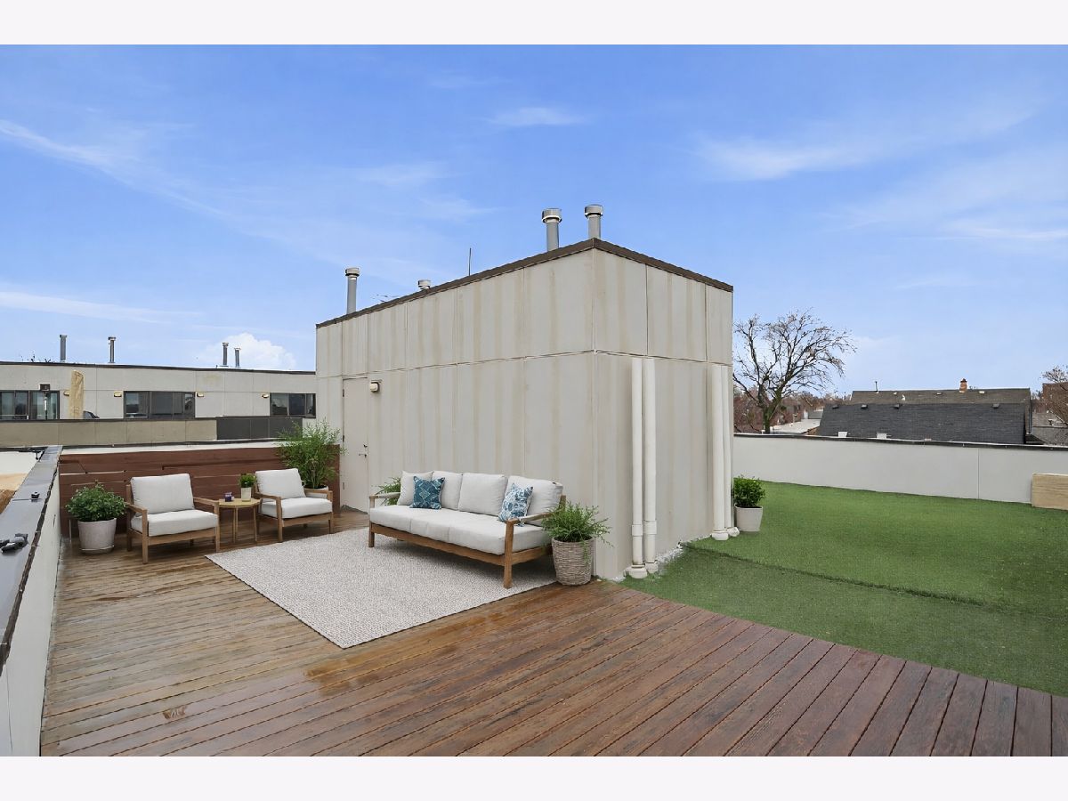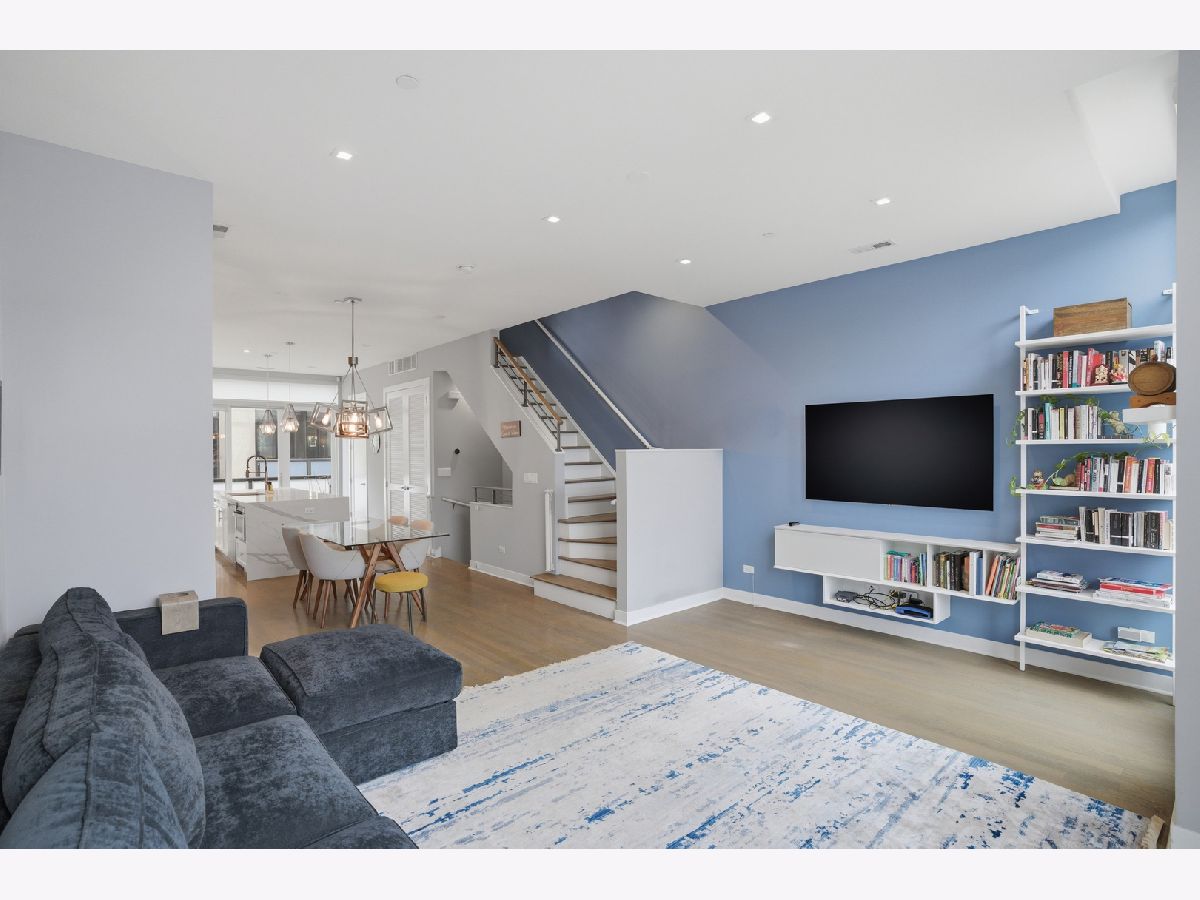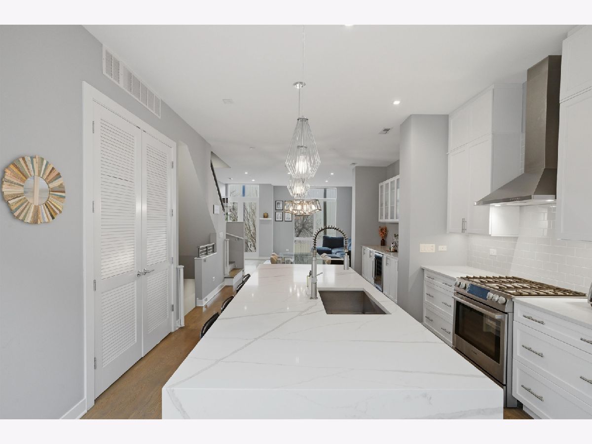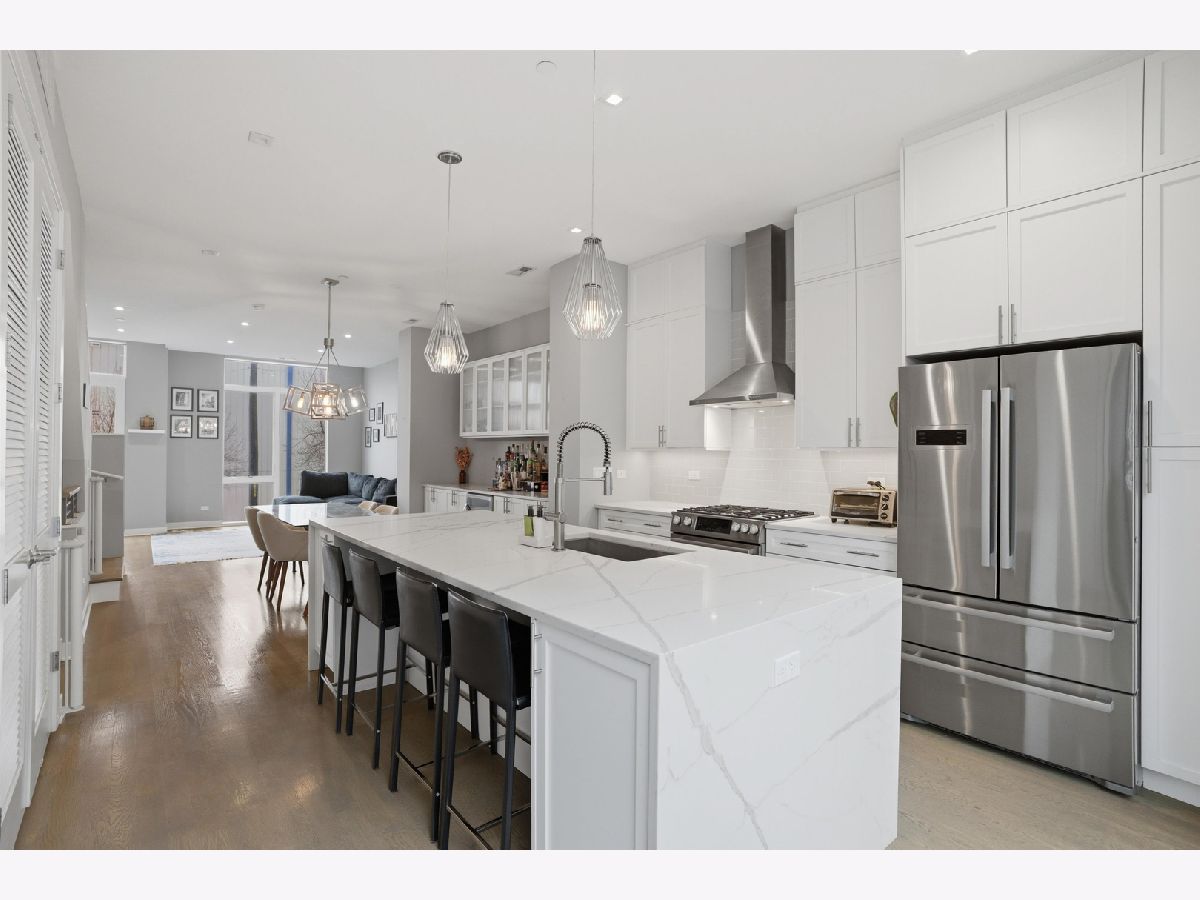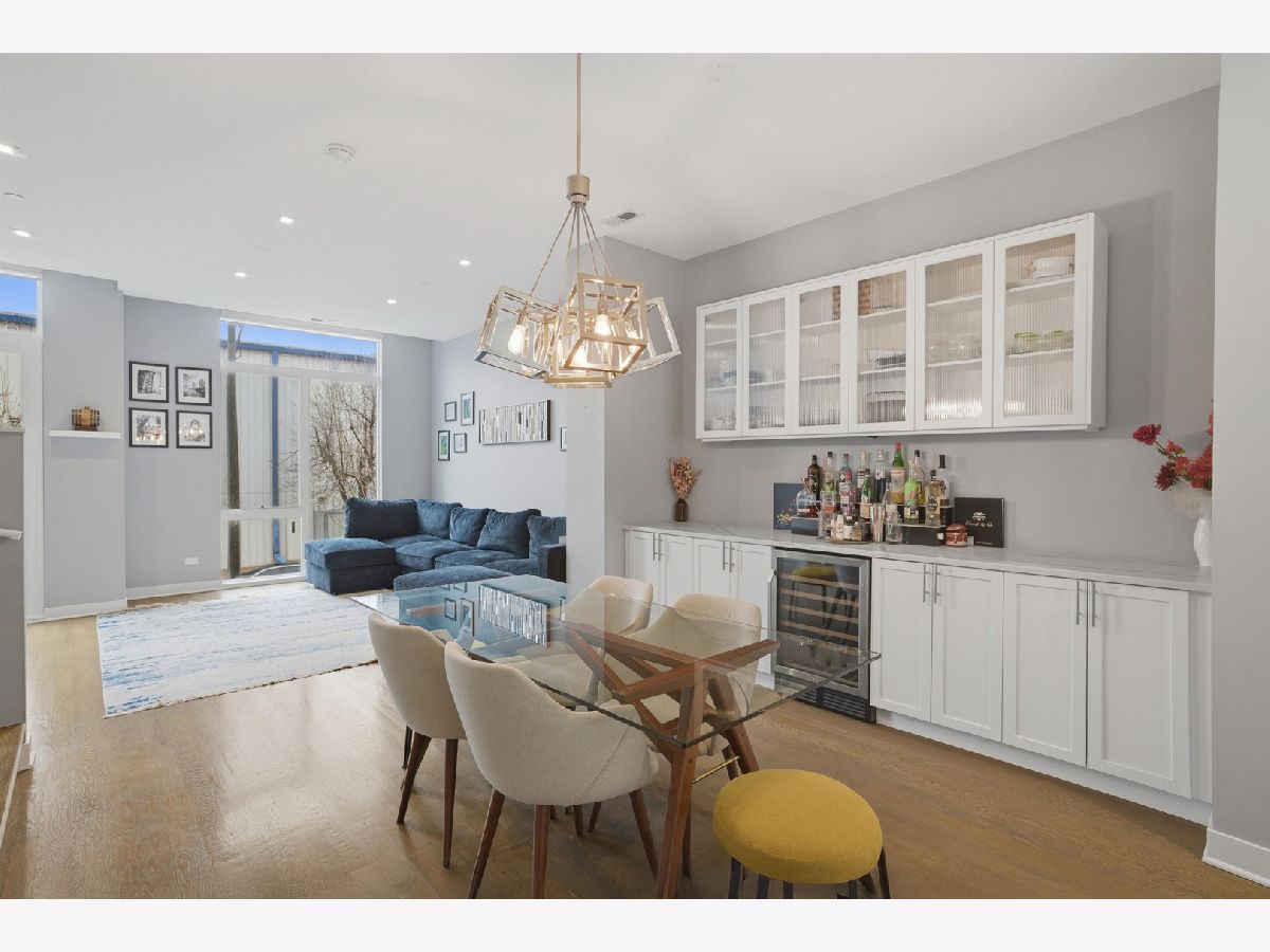 This exceptional extra-wide Bucktown townhome offers 3 bedrooms, 3.1 bathrooms, an attached two-car garage, and a stunning private rooftop deck that stretches the length of the home. Thoughtfully designed with high-end finishes and a functional layout, this residence lives like a single-family home while offering the convenience of modern city living. Enter through a landscaped, fenced front yard into a welcoming foyer featuring a smart lock entry, stylish lighting, and a coat closet. The first level includes a spacious bedroom with tile flooring and a private ensuite bathroom complete with a sleek vanity and glass walk-in shower, ideal for guests, a home office, or additional living space. The main level is bright and open, designed for both everyday living and entertaining. The chef's kitchen showcases Bosch appliances, including a five-burner gas range with vented hood, quartz countertops, double-stacked European cabinetry, a stylish subway tile backsplash, and a large waterfall island with seating, integrated microwave, and abundant storage. Just off the kitchen is a private balcony, perfect for grilling or enjoying your morning coffee. The dining area sits centrally between the kitchen and living space and features a custom built-in bar with wine refrigerator, illuminated cabinetry, and statement lighting. The expansive living room overlooks a charming tree-lined street and is filled with natural light from oversized windows. A powder room completes this level. Upstairs, two generously sized bedrooms include a spacious primary suite with floor-to-ceiling windows, a professionally organized walk-in closet, and a spa-inspired marble bathroom with a double vanity, large walk-in shower, and separate water closet. The second bedroom also features floor-to-ceiling windows and its own ensuite bath with a tub/shower combination. A convenient hallway laundry area includes a full-size LG front-loading washer and dryer. At the top of the home, the fully built-out private rooftop deck provides the perfect outdoor retreat. Designed with durable decking and turf, the space easily accommodates lounge seating, outdoor dining, and entertaining while offering sweeping neighborhood views. Additional features include oak flooring on the main and upper levels, custom window treatments, dual-zone HVAC with Nest thermostats, and an ADT security system. Ideally located in the heart of Bucktown near Logan Square, this home is just moments from the CTA Blue Line, the 606 Trail, and the vibrant dining, shopping, and nightlife along Armitage and Milwaukee Avenues. Explore the property in 3D by clicking the virtual tour to walk through every detail of this exceptional home.