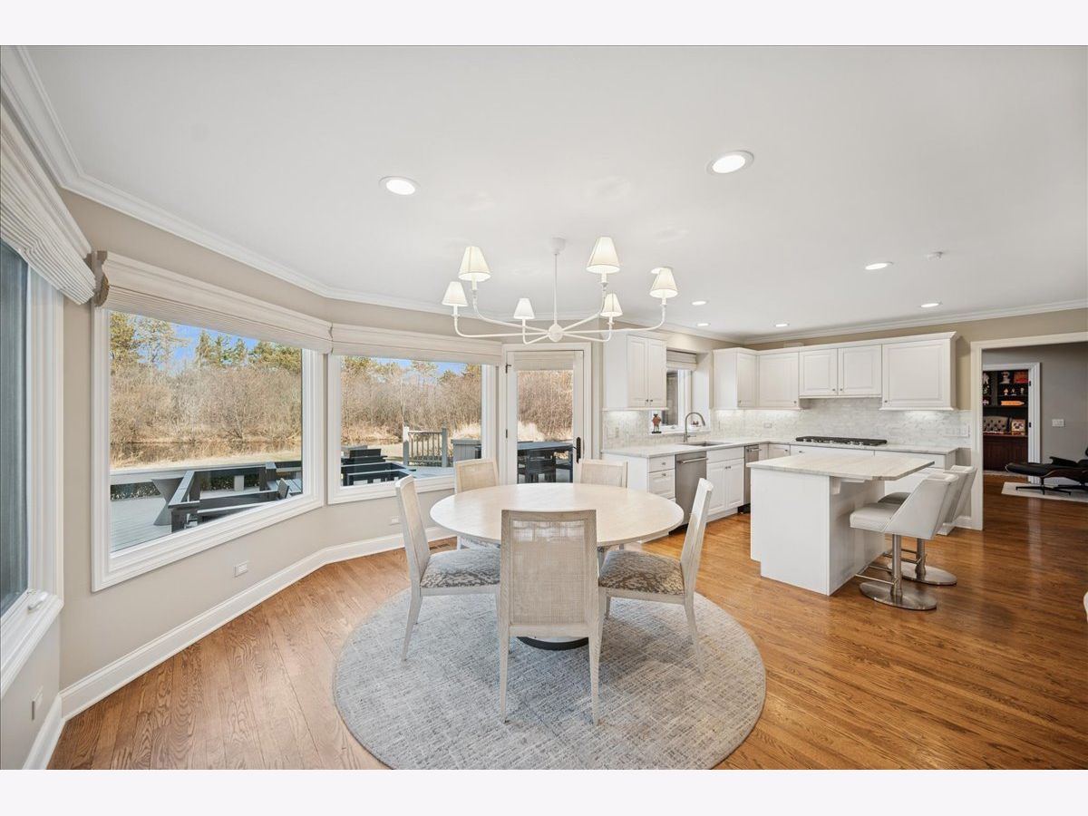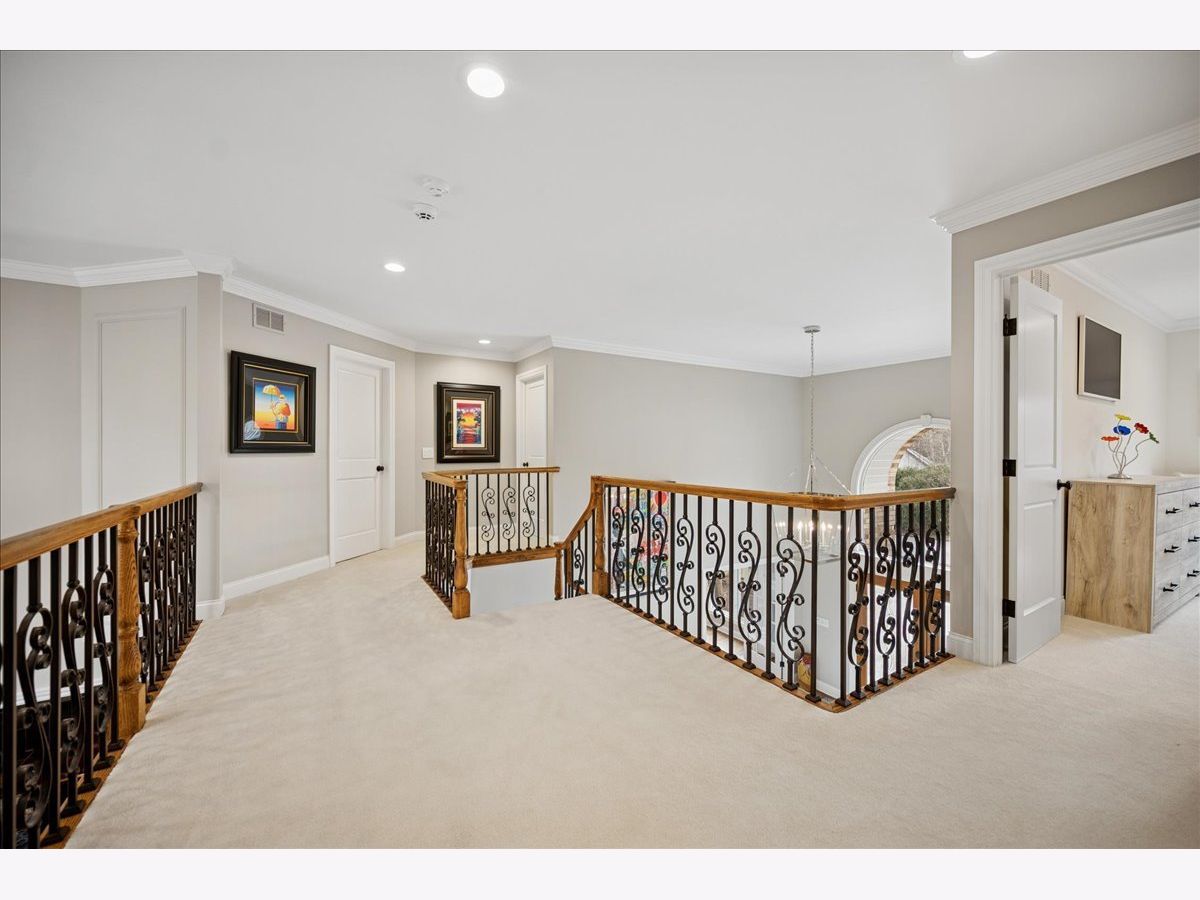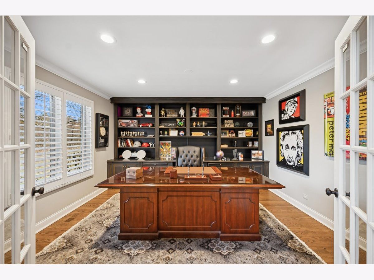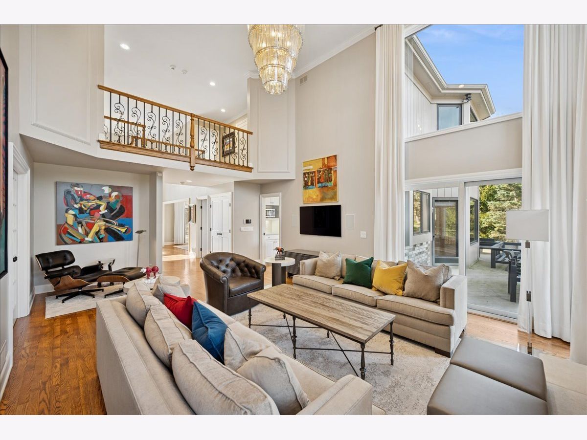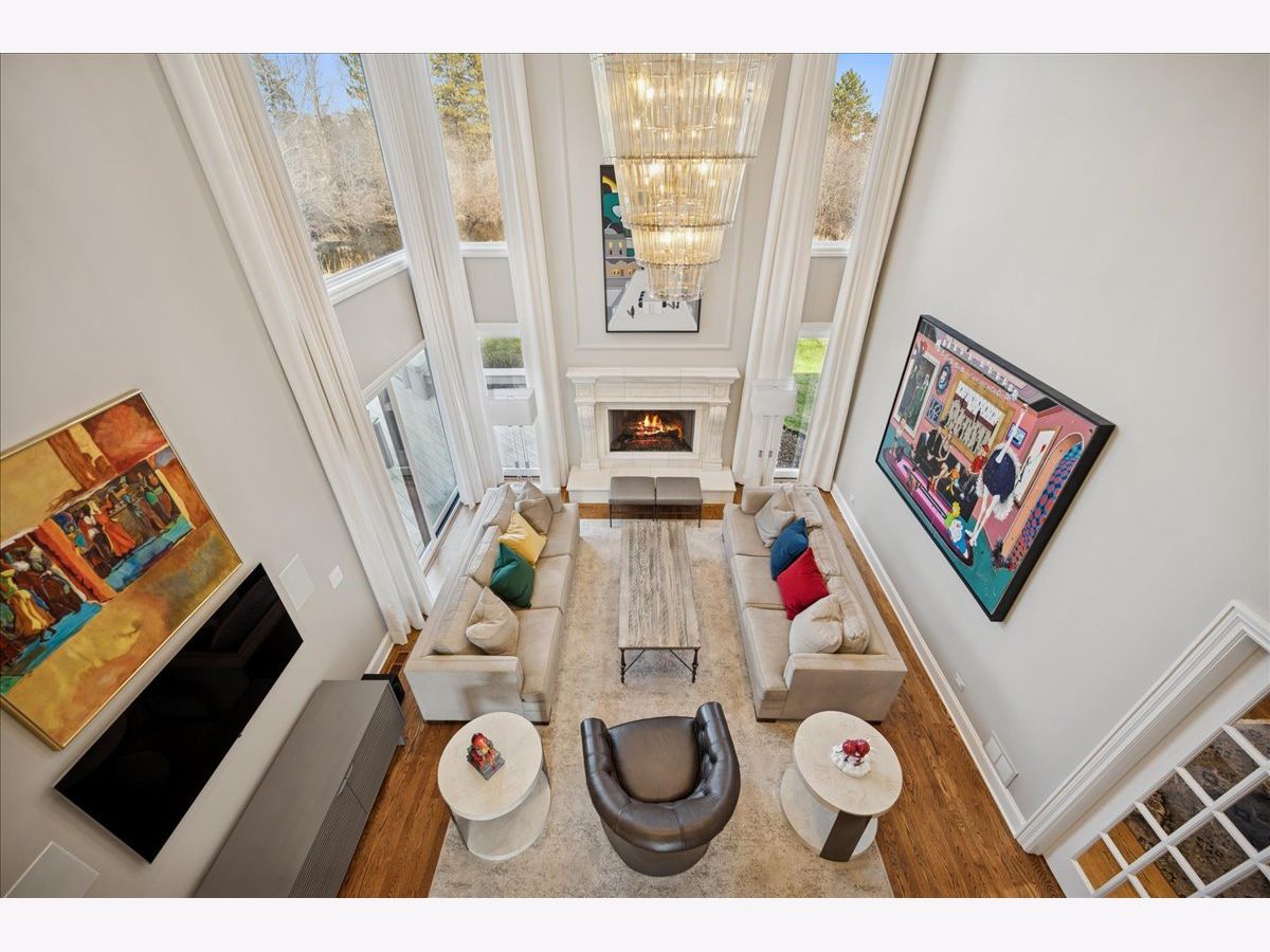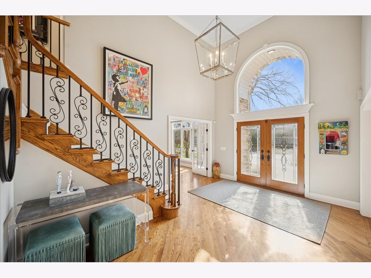 Stunning, extensively renovated 5-bedroom, 4.1-bath home in the coveted Hybernia community of Highland Park, offering serene pond views and maintenance-free living. A dramatic two-story foyer welcomes you into light-filled interiors featuring soaring ceilings, rich hardwood floors, crown molding, and a limestone fireplace in the breathtaking living room with floor-to-ceiling windows. The gourmet eat-in kitchen showcases custom cabinetry, quartzite countertops, walk-in and butler's pantries, and high-end appliances including a 48" Sub-Zero refrigerator, double ovens, and 5-burner cooktop. Gather in the breakfast area overlooking the water, host holidays in the formal dining room, or unwind in the adjacent living room with 17 foot ceilings - the flow is seamless and inviting. Flexible floor plan includes a first-floor bedroom with full bath offering ideal flexibility for guests or multigenerational living. The main floor also features a private office with custom built-ins for an inspiring work-from-home retreat, a cozy family room (or den) for watching TV, elegant dining room, updated laundry room, and a powder room. The luxurious primary suite offers a sitting area with water views and a spa-inspired bath with quartzite counters and heated travertine floors. Two bedrooms share a Jack-and-Jill bath, while the fourth upstairs bedroom features an en-suite bathroom. Extensive upgrades include newer roof, R-49 attic insulation, renovated baths, LED lighting, new lighting fixtures and window treatments, dual-zoned HVAC, new electronic shades in kitchen, living room and primary bedroom, and a whole-house generator. Enjoy outdoor living on the composite deck with built-in seating and speakers, brick paver patio, and oversized circular driveway. 3-car attached garage. HOA provides white-glove landscaping and snow removal allowing for truly maintenance-free luxury living. Ideally located near top-rated schools with the option of Highland Park High School or Deerfield High School. Impeccably maintained, turnkey, and move-in ready private retreat.