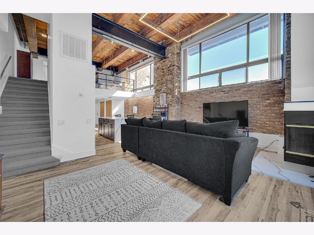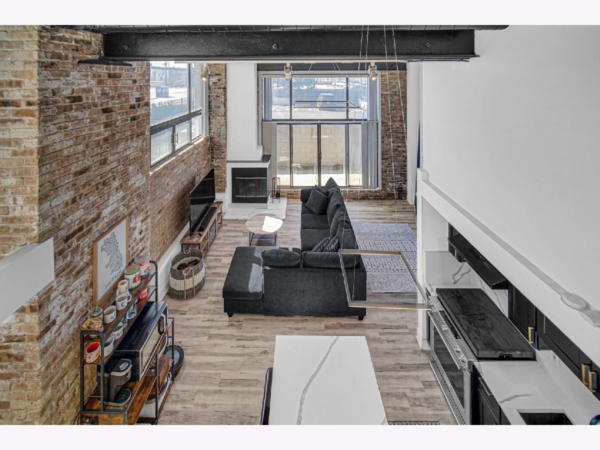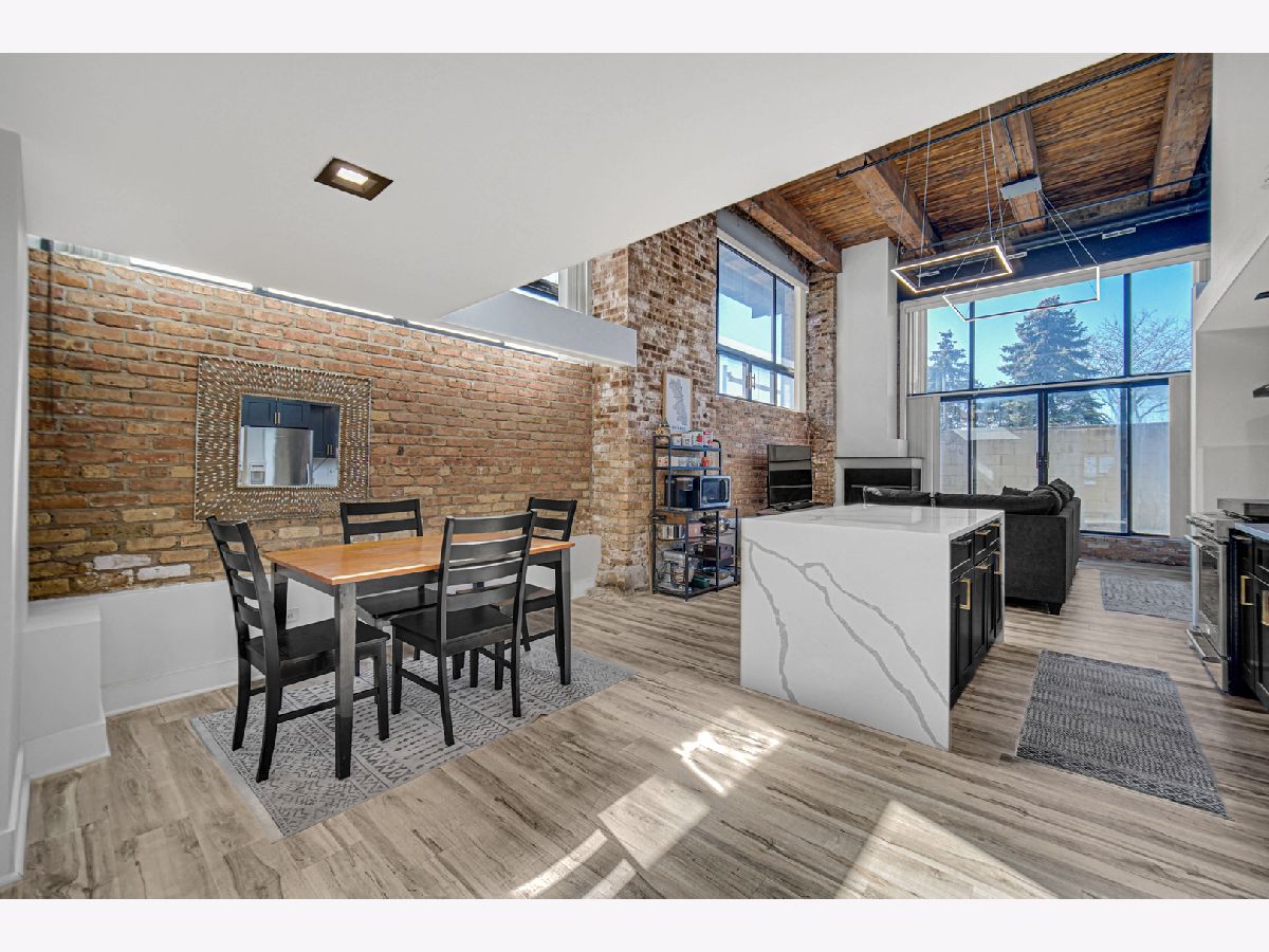 Welcome home to this beautiful 1 bed/1.5 bath loft with a potential second bedroom!! This corner unit boasts 18 foot ceilings, exposed brick, tons of natural light, an open floor plan, new luxury vinyl flooring (2023), with a newly updated kitchen (2023). The kitchen features quartz countertops (2023), matte black shaker cabinets (2023), stainless steel appliances, and large waterfall kitchen island (2023). This home is equipped with a dining area, a separate den space perfect for an office or potential second bedroom, in-unit laundry, and a large living room complete with a wood-burning fireplace. The living room opens up into a large private patio. Upstairs you'll find the primary lofted bedroom with brand new carpet, an ensuite bathroom and large walk-in closet. This unit comes with one gated parking space, new A/C (2024), new furnace (2024), and is perfectly situated near tons of shopping, grocery stores, and is conveniently located near the highway. Come make this loft your home!