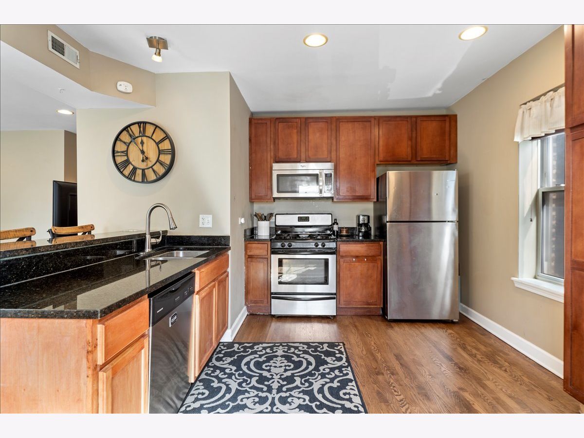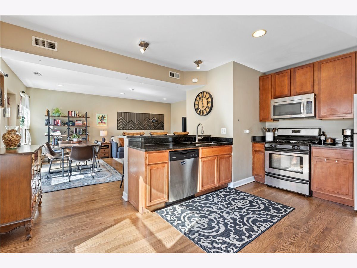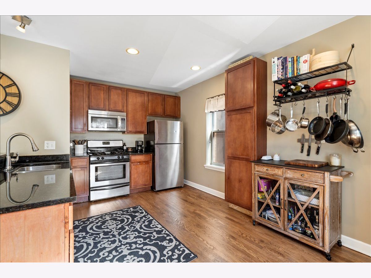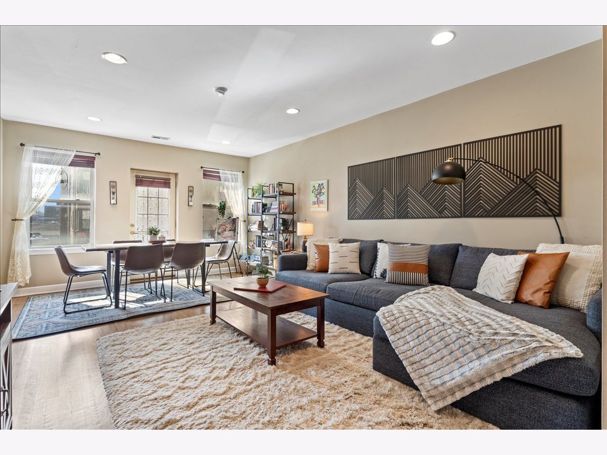 Great opportunity in West Ridge! This spacious & sunny 2 bed 2 bath condo features an open floorplan w/ hardwood flooring, recessed lighting, and a modern updated kitchen! Step into a large living room which is combined with dining room and Juliet balcony adding to the natural light. This flows right into the open kitchen which features a breakfast bar, granite countertops, cherry cabinets and SS appliances. Large primary bedroom w/ en suite bathroom and features both a walk in closet and a reach in closet. Second bedroom is also sizable and hall bath is right outside the bedroom. Unit features in unit washer/dryer, new HVAC, storage in the basement and private deck in the back. All decks were just re-done and are brand new! Conveniently located near Warren Park, the riverfront trail, public transportation, shopping, restaurants, grocery stores and more. Permit parking on Rosemont.