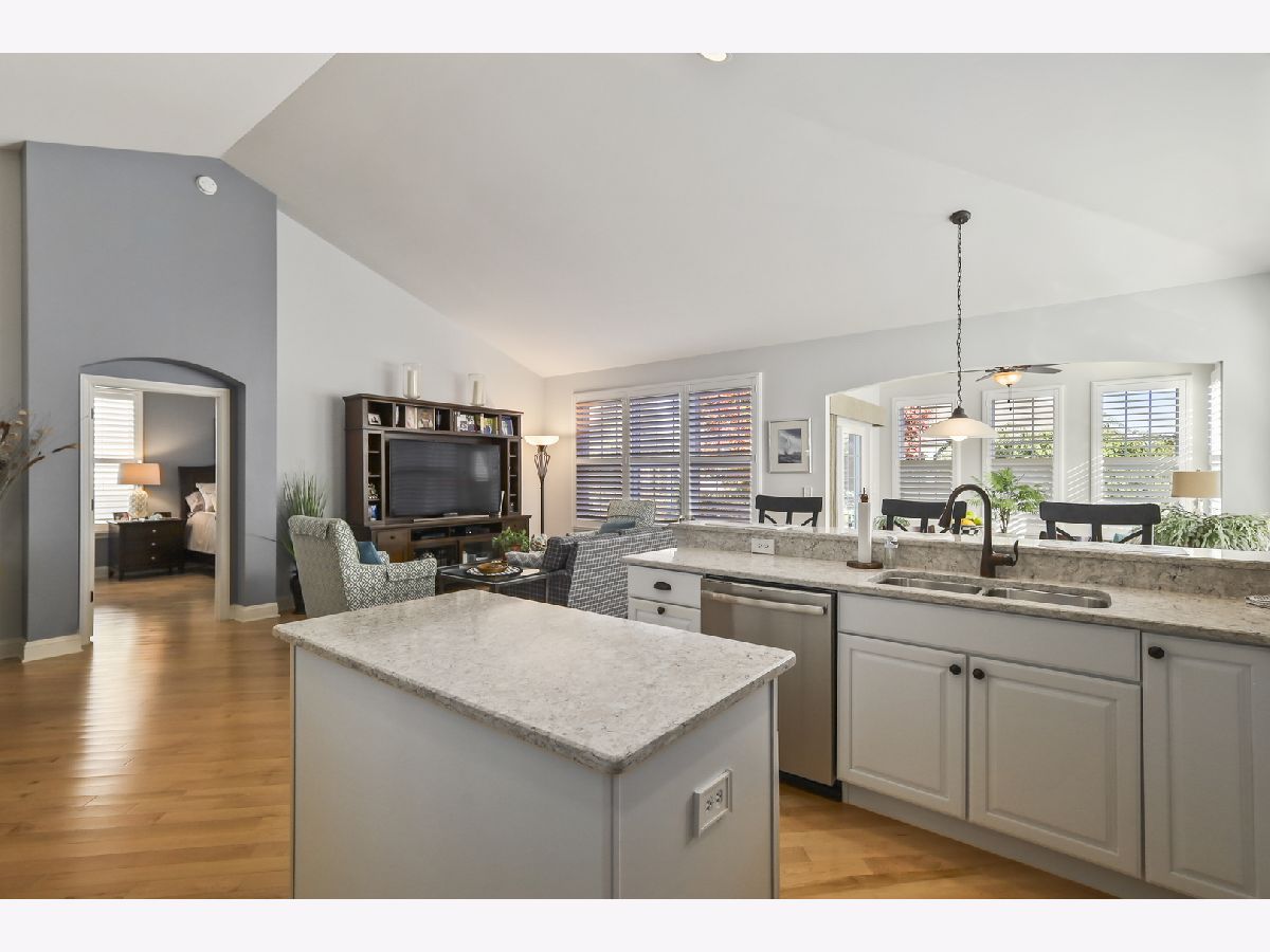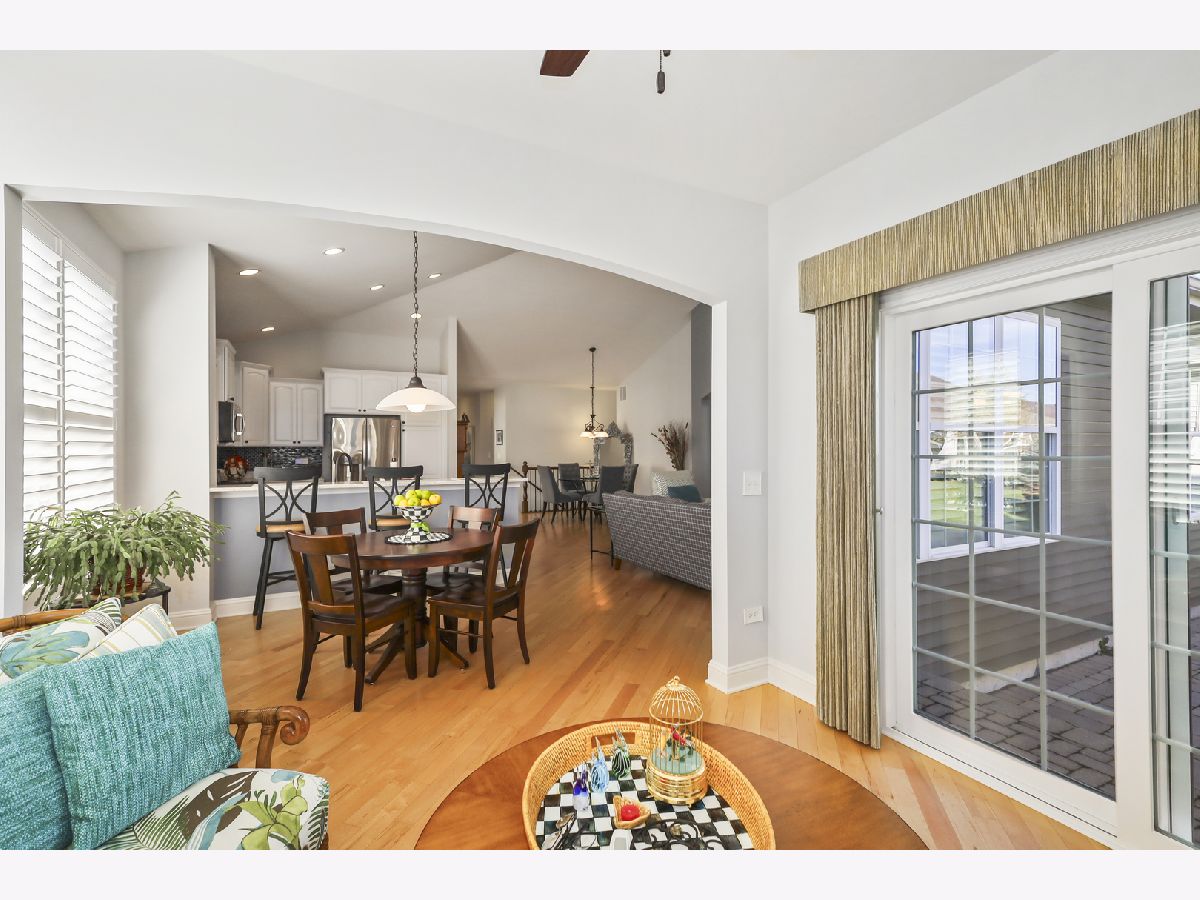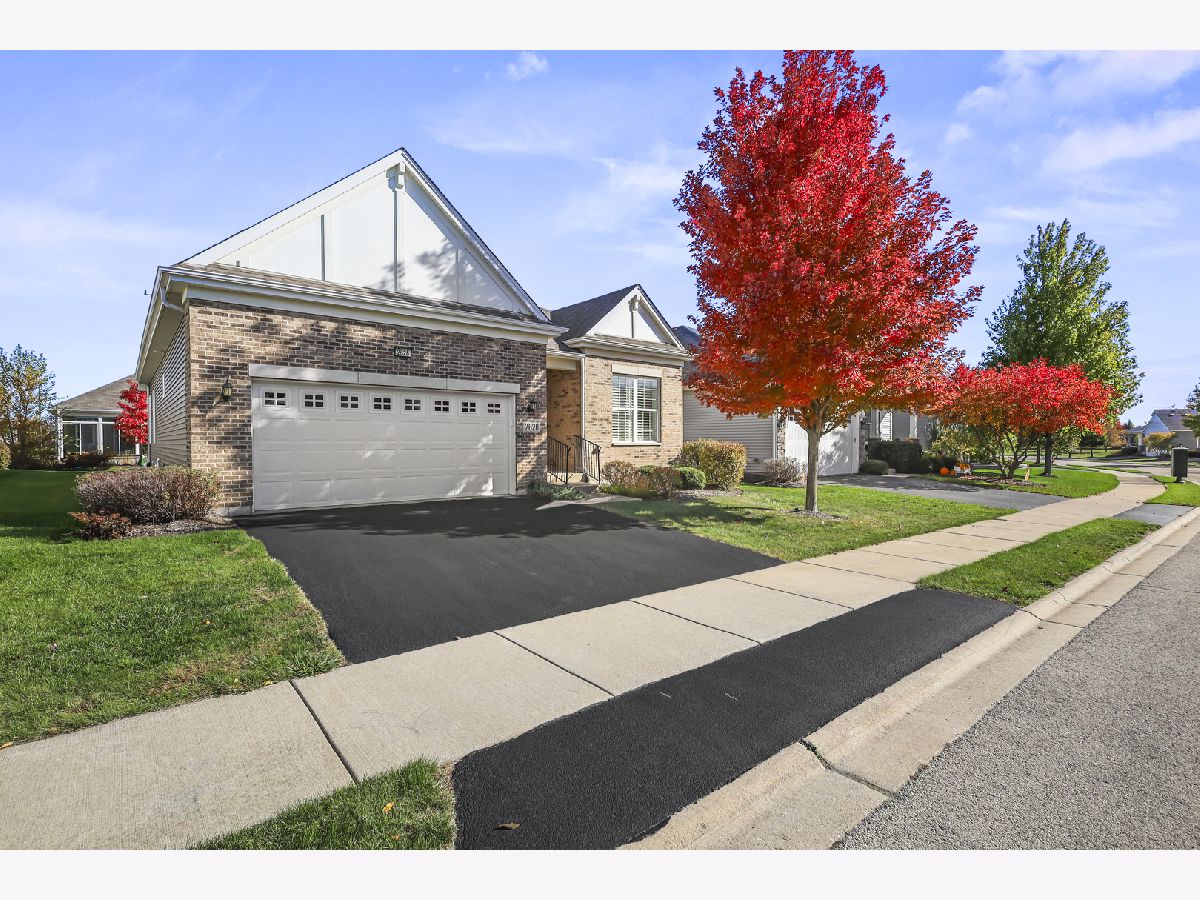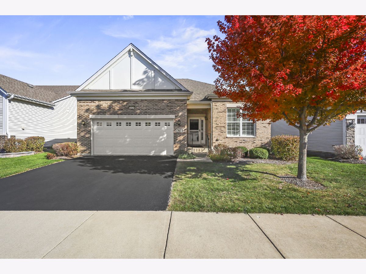 Discover comfort, style, and low-maintenance living in this beautifully maintained 2-bedroom, 2-bath Ranch home nestled in the desirable Carillon Club! This home is the perfect blend of elegance and ease. As you step inside, you are greeted with an open spacious layout along with gleaming Hardwood Flooring throughout the entire main level, creating a warm, seamless flow from room to room. Vaulted ceilings and flooding with natural light. The updated kitchen boasts elegant white cabinetry, Quartz Countertops, SS appliances and Island for additional storage. All the finishes throughout are completed with sleek brushed oil-rubbed bronze, offering both functionality and refined style. Dining and Living room are combined with an open concept. Enjoy your morning coffee or unwind with a book in the sun-drenched sunroom, featuring large windows that fill the space with natural light. Or lounge in leisure in the backyard on your beautiful brick paved patio. Plantation shutters throughout the home provide a timeless look and added privacy. The spacious primary suite includes high ceilings, two generous closets with one being a walk-in and hardwood flooring. Primary bath features dual quartz countertop vanity and standup shower with seating accommodation. The second bedroom and full guest bath offer comfort for visitors or a flexible home office setup. Make your way downstairs to find a full unfinished basement that is the perfect blank canvas-ideal for storage or future living space, along with huge crawl area for additional storage. 2 car garage is finished with appoxy flooring and insulation. This immaculately maintained home is move-in ready and located just minutes from shopping, dining, AMC movie theater, the new Block 59 shopping center, expressways and much more! Welcome home!