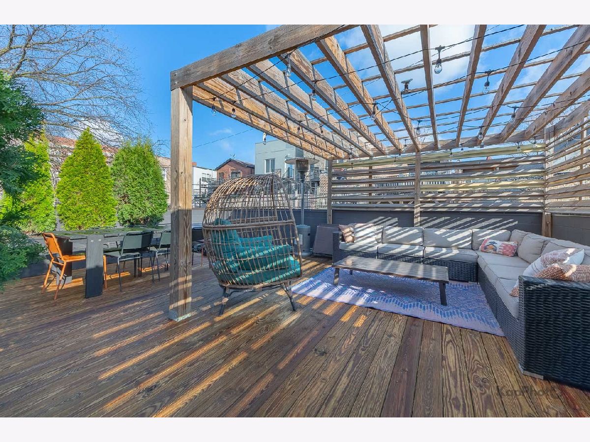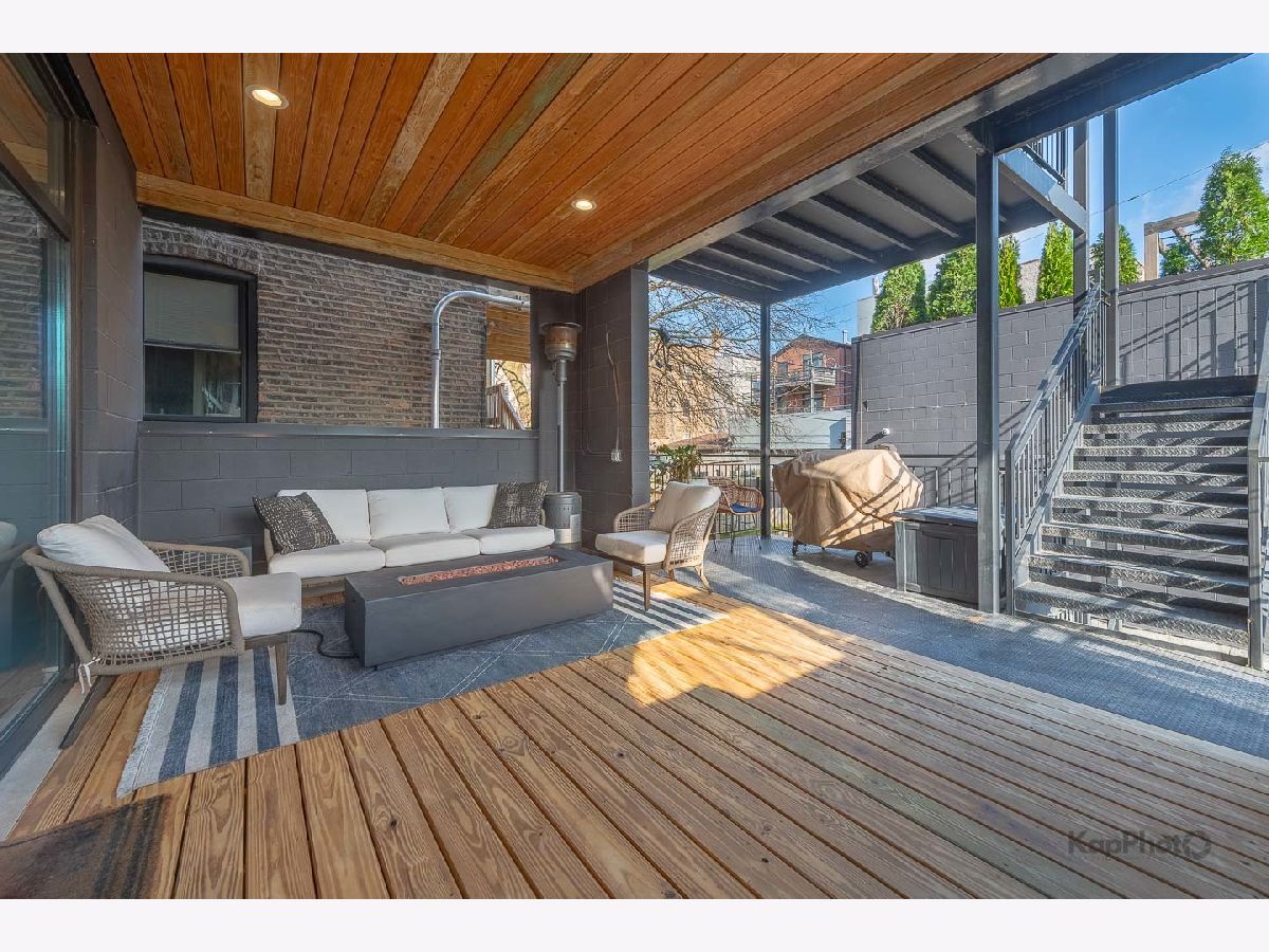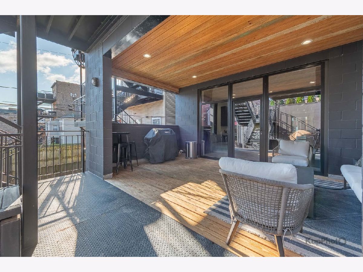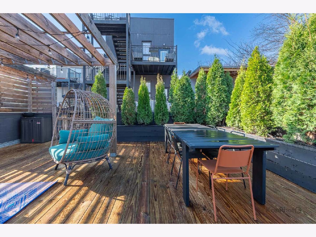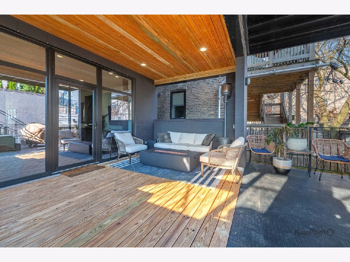 Luxury newer-construction duplex with 3 bedrooms, 2.1 baths, garage parking, and 2 impressive private outdoor spaces. The main level includes an oversized covered terrace with deck extension off the family room, plus a massive private garage roof deck with pergola, custom planter boxes, and privacy tree fencing. Roof deck is reinforced and prepped for a future ADU (Accessory Dwelling Unit). . The main floor offers an open layout with living room, dining area, kitchen, and family room across the full level, giving it a single-family home feel. The living room features dramatic floor-to-ceiling windows. The family room opens directly to the covered terrace and leads to the roof deck. The kitchen is finished with Italian 48" flat-panel cabinetry, quartz countertops with full-height backsplash, waterfall island with built-in microwave, undermount sink with Brizo pull-down faucet, and Samsung graphite stainless steel appliances. A breakfast nook adds custom built-in seating, storage, cabinetry, and a wine/beverage fridge. The lower level includes all 3 bedrooms and 2 full baths. The primary suite offers a spa-like bath with Italian double vanity, quartzite countertop, soaking tub, and walk-in shower with glass door. 2 additional bedrooms, a full guest bath, custom wood closet organizers, bamboo hardwood floors throughout, European windows, custom blinds and curtains, and Restoration Hardware lighting and plumbing fixtures complete the home. Located in prime Humboldt Park, just steps from the park's 207 acres with beach, bike and walking trails, tennis courts, baseball fields, fieldhouse, playground, and more. Close to neighborhood favorites including The California Clipper, The Hi-Lo, Boeufhaus, Rootstock, Spinning J, boutiques, nursery/gardens, and a wide range of dining options.