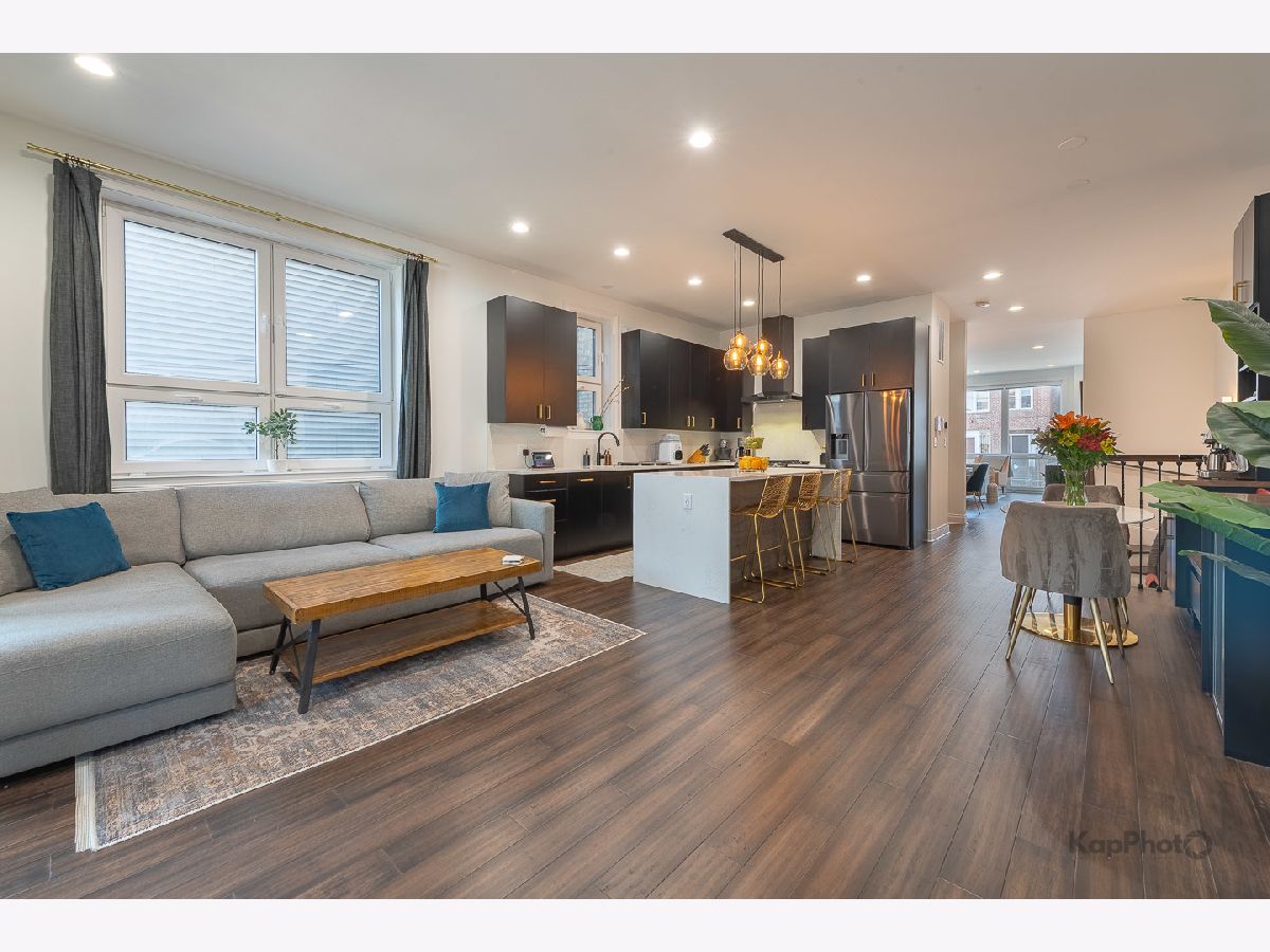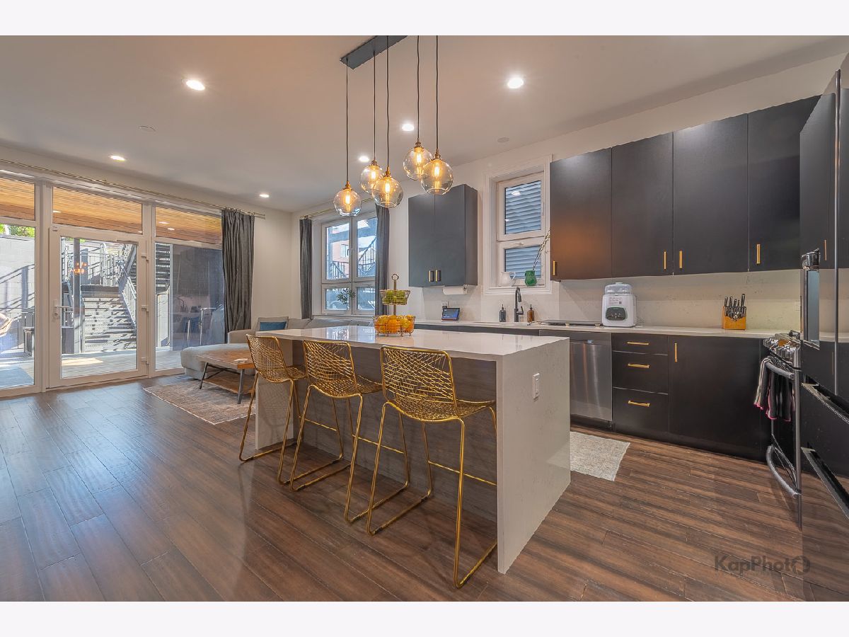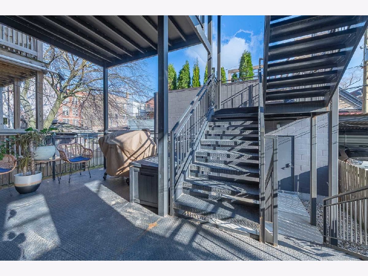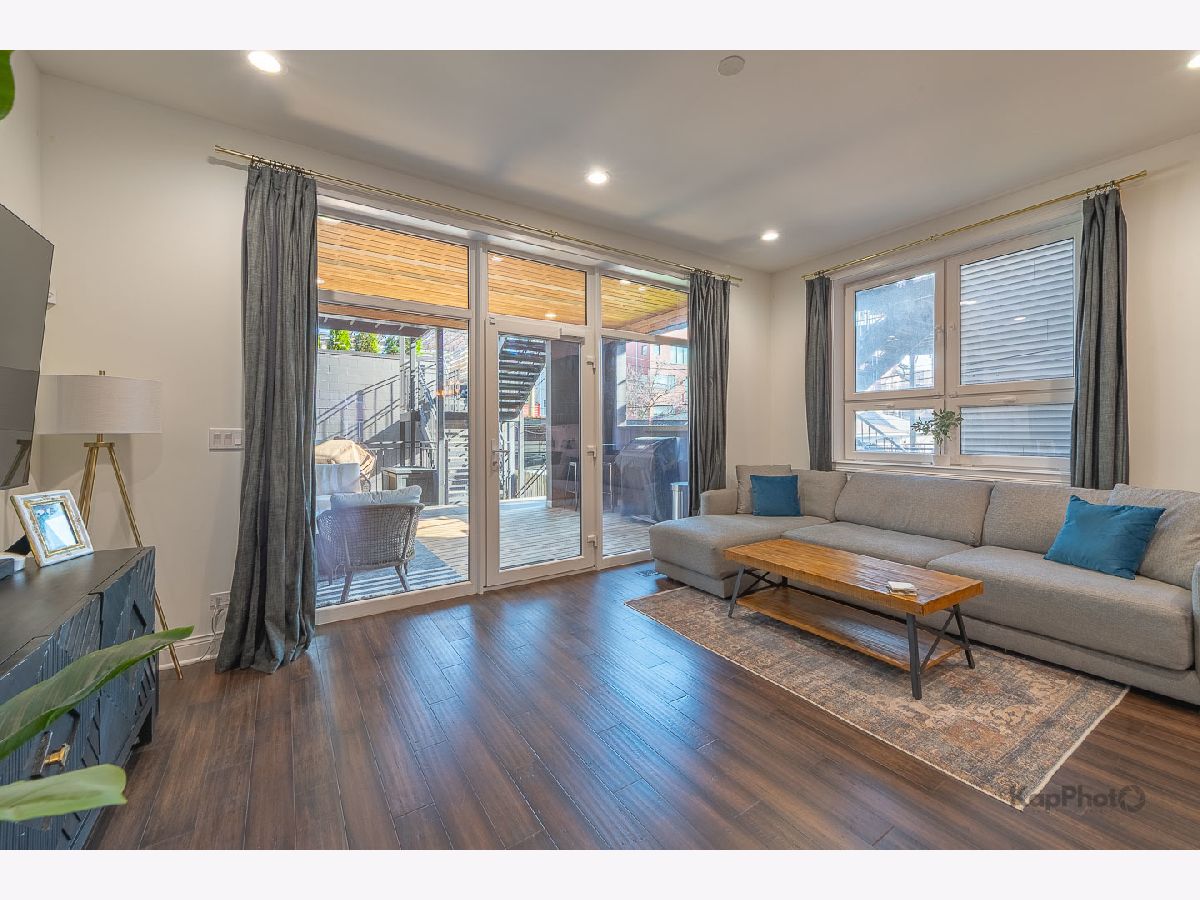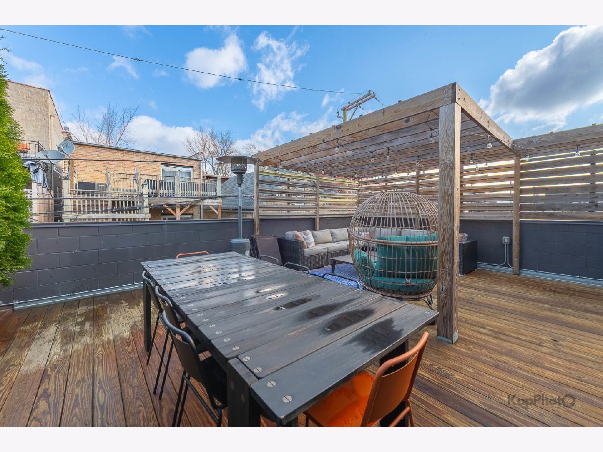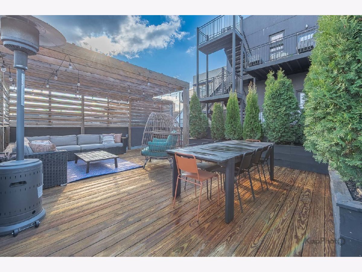 Luxury newer-construction duplex with 3 bedrooms, 2.1 baths, garage parking, and 2 impressive private outdoor spaces. The main level includes an oversized covered terrace with deck extension off the family room, plus a massive private garage roof deck with pergola, custom planter boxes, and privacy tree fencing. Roof deck is reinforced and prepped for a future ADU (Accessory Dwelling Unit). . The main floor offers an open layout with living room, dining area, kitchen, and family room across the full level, giving it a single-family home feel. The living room features dramatic floor-to-ceiling windows. The family room opens directly to the covered terrace and leads to the roof deck. The kitchen is finished with Italian 48" flat-panel cabinetry, quartz countertops with full-height backsplash, waterfall island with built-in microwave, undermount sink with Brizo pull-down faucet, and Samsung graphite stainless steel appliances. A breakfast nook adds custom built-in seating, storage, cabinetry, and a wine/beverage fridge. The lower level includes all 3 bedrooms and 2 full baths. The primary suite offers a spa-like bath with Italian double vanity, quartzite countertop, soaking tub, and walk-in shower with glass door. 2 additional bedrooms, a full guest bath, custom wood closet organizers, bamboo hardwood floors throughout, European windows, custom blinds and curtains, and Restoration Hardware lighting and plumbing fixtures complete the home. Located in prime Humboldt Park, just steps from the park's 207 acres with beach, bike and walking trails, tennis courts, baseball fields, fieldhouse, playground, and more. Close to neighborhood favorites including The California Clipper, The Hi-Lo, Boeufhaus, Rootstock, Spinning J, boutiques, nursery/gardens, and a wide range of dining options.