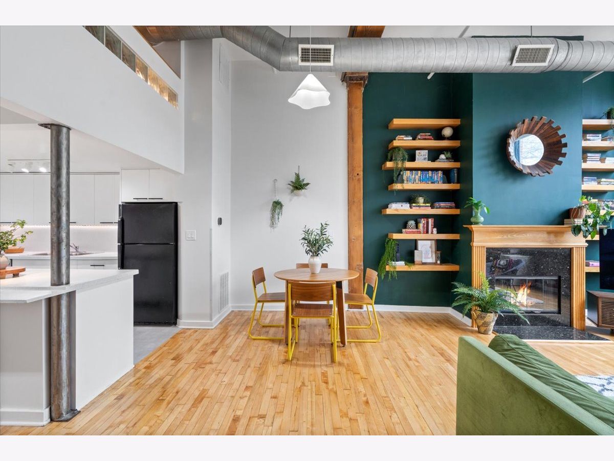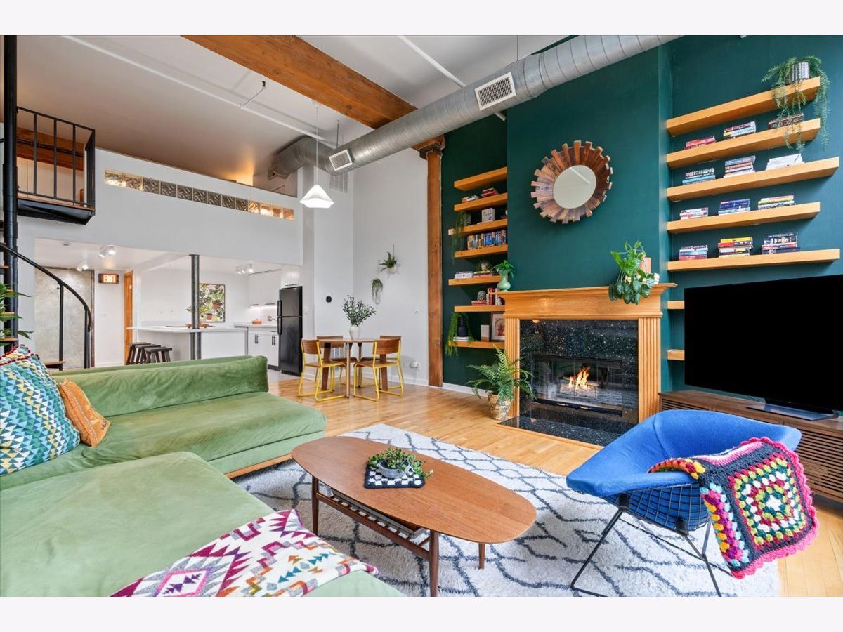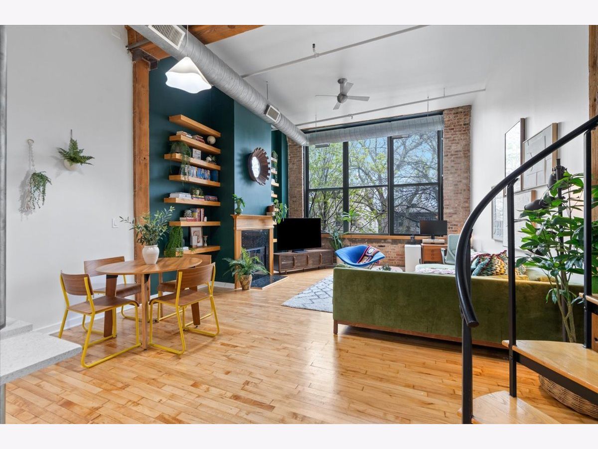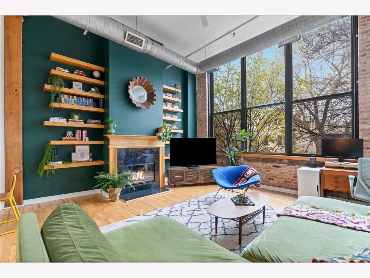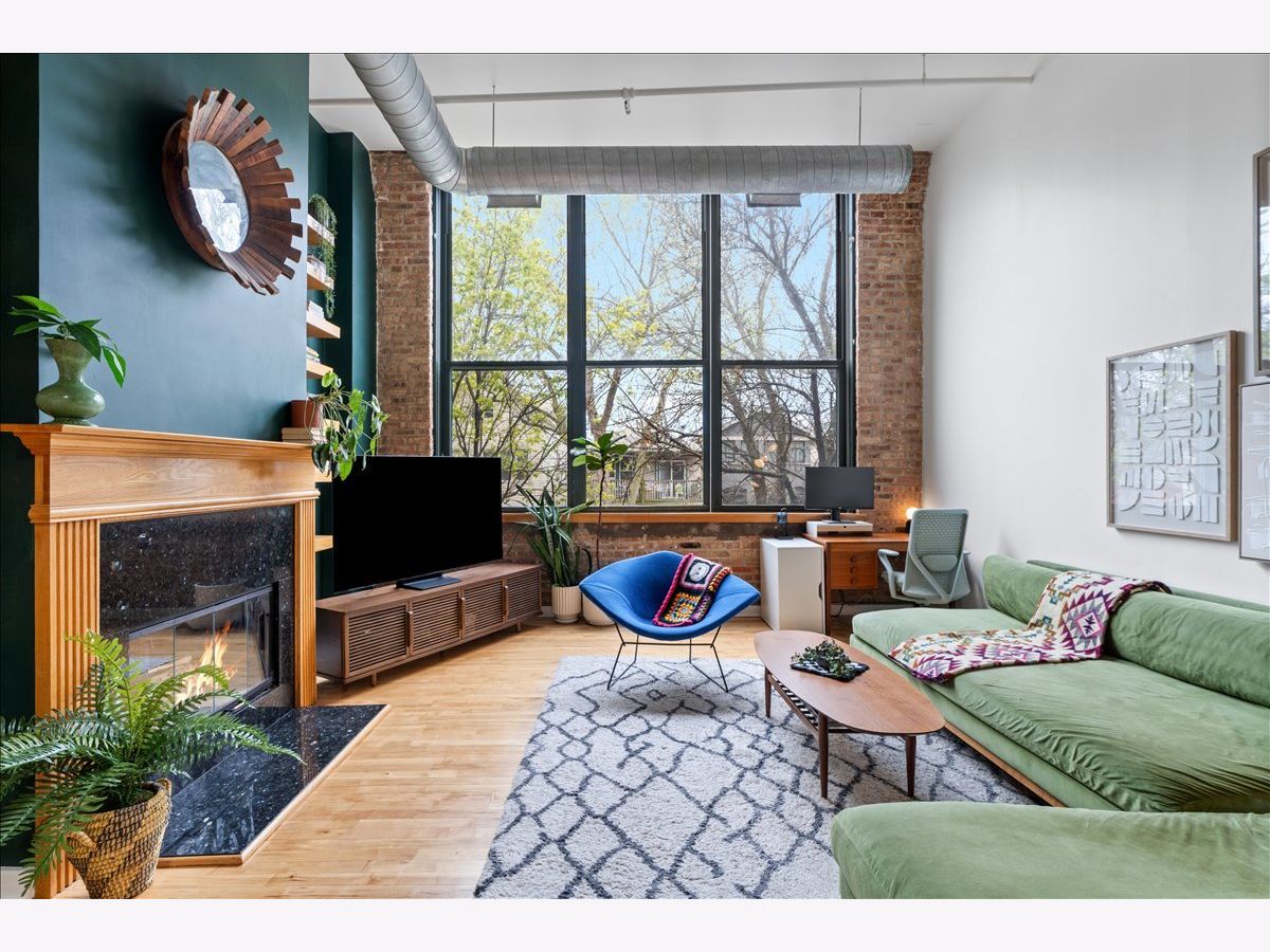 A rare timber loft in the heart of Logan Square, this home feels more like a hidden retreat than a city residence-an elevated treehouse within a converted 100+ year-old warehouse. Behind its industrial facade, the space opens with quiet drama: 15-foot ceilings, exposed brick, and hardwood floors anchored by a wood-burning fireplace and built in shelving. Oversized windows bring in natural light filtered through the surrounding treetops, softening the edges of a quiet, tree-lined street below. The open layout is flexible yet intentional - suited to slow mornings, focused work, or effortless entertaining. The kitchen features ample storage and a breakfast bar, and connects seamlessly to the main living space. A lofted bedroom overlooks it all, offering generous closet space and a sense of privacy while remaining visually connected to the architecture below. Freshly painted and equipped with in-unit laundry, central heat and air, and includes assigned, gated parking. Well-maintained building featuring secure entry, shared rooftop deck, and bike storage. Moments from the California Blue Line, Haas and Palmer Square Parks, and the best of Logan Square and Bucktown, it is both private and connected - a character-rich loft shaped by light, history, and a distinctly urban sense of ease.