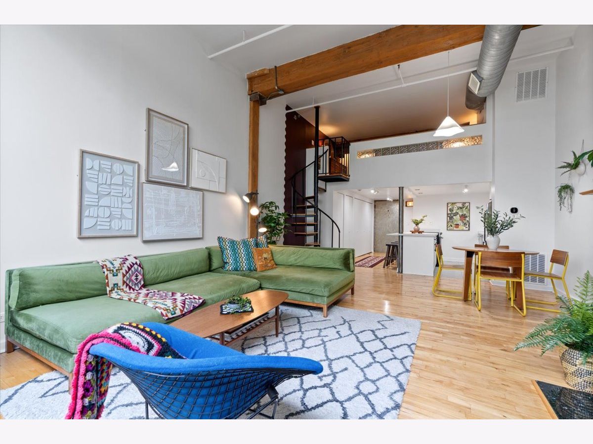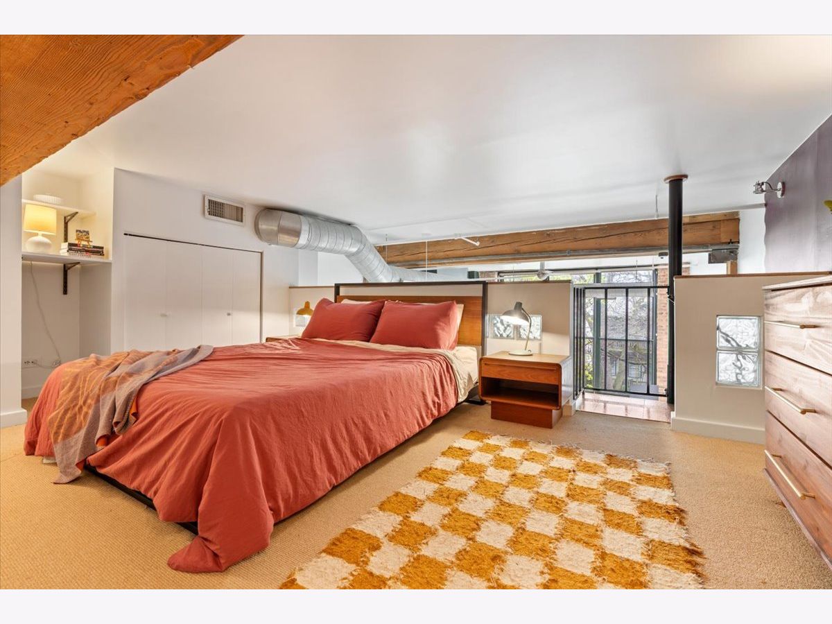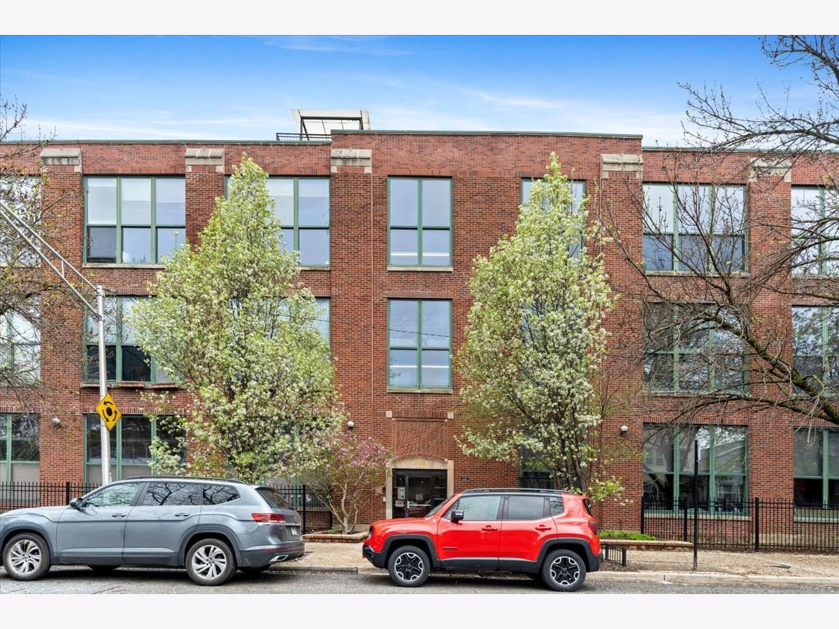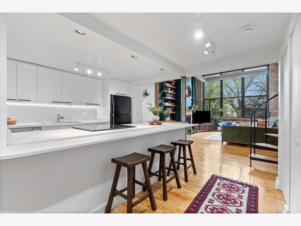 A rare timber loft in the heart of Logan Square, this home feels more like a hidden retreat than a city residence-an elevated treehouse within a converted 100+ year-old warehouse. Behind its industrial facade, the space opens with quiet drama: 15-foot ceilings, exposed brick, and hardwood floors anchored by a wood-burning fireplace and built in shelving. Oversized windows bring in natural light filtered through the surrounding treetops, softening the edges of a quiet, tree-lined street below. The open layout is flexible yet intentional - suited to slow mornings, focused work, or effortless entertaining. The kitchen features ample storage and a breakfast bar, and connects seamlessly to the main living space. A lofted bedroom overlooks it all, offering generous closet space and a sense of privacy while remaining visually connected to the architecture below. Freshly painted and equipped with in-unit laundry, central heat and air, and includes assigned, gated parking. Well-maintained building featuring secure entry, shared rooftop deck, and bike storage. Moments from the California Blue Line, Haas and Palmer Square Parks, and the best of Logan Square and Bucktown, it is both private and connected - a character-rich loft shaped by light, history, and a distinctly urban sense of ease.