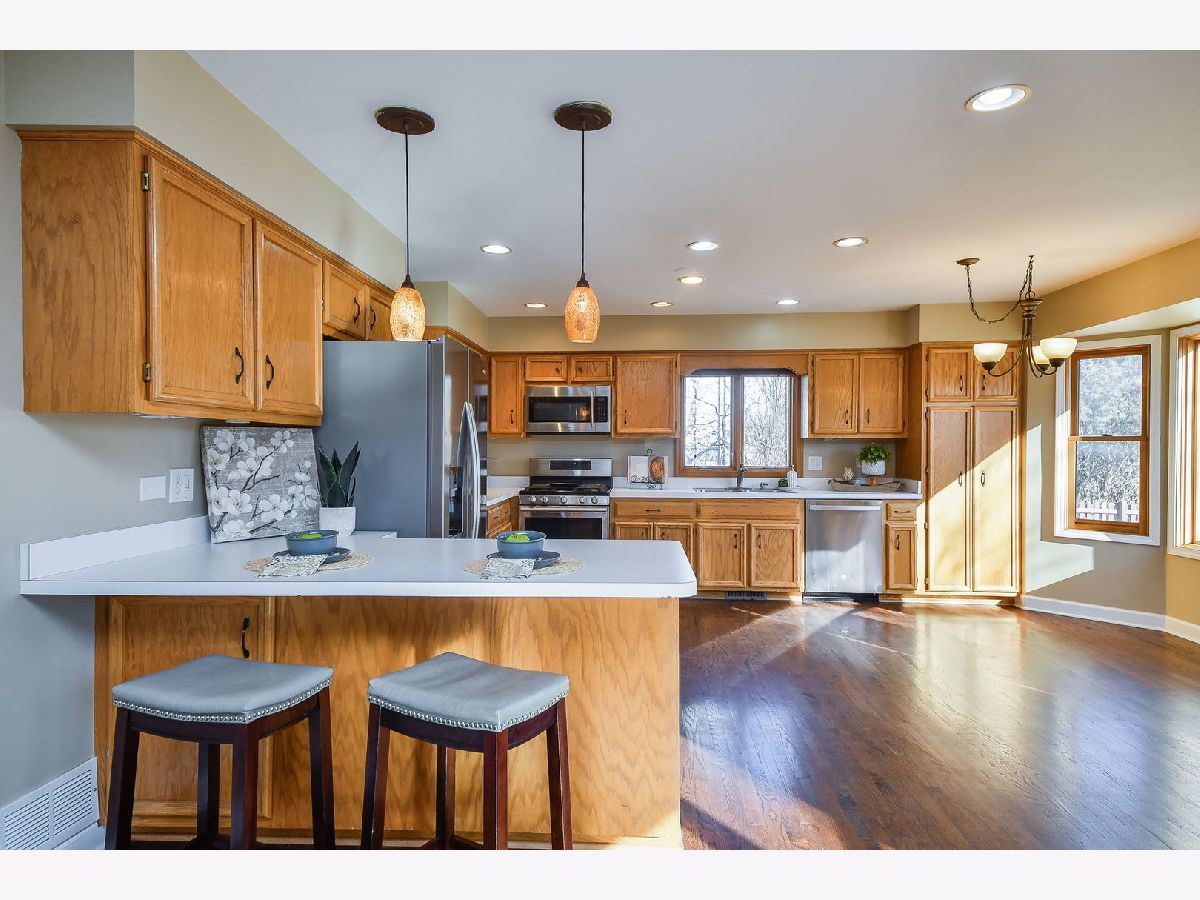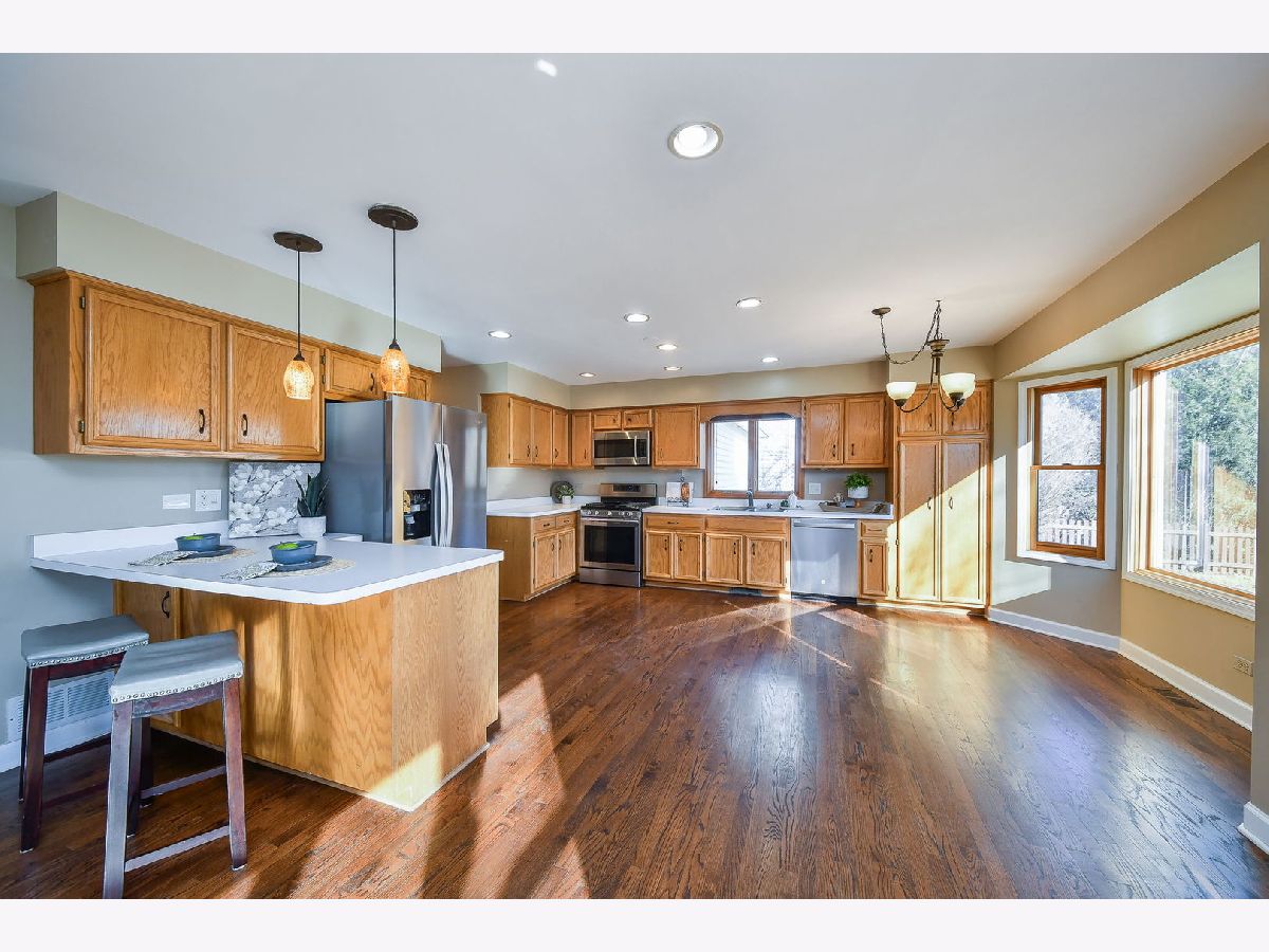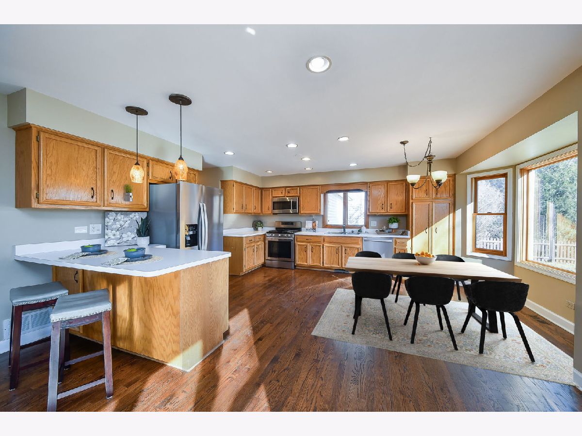 Enjoy all of the incredible amenities that the Oakhurst Subdivision has to offer to it's residents with this fantastic 4 bedroom home! The adorable covered front porch couldn't be a more perfect spot to enjoy your morning coffee. Step inside and notice the rich mocha stained hardwood floors that grace the entire 1st level and staircase! This heart of the home kitchen truly lives up to it's name here, it is the most wide open space, ready to accommodate a large kitchen table, and gatherings at the breakfast bar. Ample cabinet and pantry space is highlighted by the stainless steel appliances. Sunshine streams into the family room making it such a warm space to relax by the fireplace. A formal dining room with bay window makes for a wonderful entertaining space and the separate living room can be turned into an office/playroom/flex space so easily! The powder room has been beautifully remodeled, and the first floor laundry room boasts ample storage and front loader stainless washer and dryer. Wrought iron spindles and hardwood steps highlight the staircase to the 2nd floor. Here you will find a hardwood hallway leading to all 4 bedrooms, that all have just had new carpet installed. The Primary suite is extra large with a big walk in closet. Enjoy the oversized primary bathroom with separate deep soaking tub and shower, and dual sinks on a vanity with tons of storage! All of the additional bedrooms have also just been re carpeted and boast great closet space, and ceiling fans. The linen closet and guest bathroom round out the 2nd level. Bring your dream basement ideas to life in this full basement just waiting for all of your storage needs or finishing ideas! There is no crawlspace so it boasts a perfect opportunity to be creative in a wide open area. If a large yard is on your wish list, look no more! This is such a nice wide and deep lot and it's fully fenced! Enjoy the ease of entertaining on the maintenance free concrete patio and new deck. The lifestyle in Oakhurst is such a bonus. You will have soccer fields, basketball courts, sand volleyball, pickleball, tennis courts, miles of walking paths just steps outside your front door. Join the pool and clubhouse if you desire, we have award winning swim and water polo teams! If you like endless walking and biking opportunities you will find miles or paved paths around Waubonsie Lake, next to Oakhurst Forest Preserve and to Lake Patterson ( which also boasts a huge sled hill! ). Also walking distance to all 3 schools, Starbucks, Dunkin, Mariano's grocery and incredible food options! Minutes drive to the Rt. 59 train station, and downtown Naperville. You simply cannot go wrong, Welcome to Oakhurst! You'll be so happy with the updates you do not have to do! Sellers have updated : 2026 - All NEW carpet in the bedrooms. 2025 - NEW furnace, stainless refrigerator, deck, back up sump pump, and dishwasher. 2017 - NEW water heater, hardwood flooring. 2015 - NEW roof, washer/dryer, new bay windows installed.
