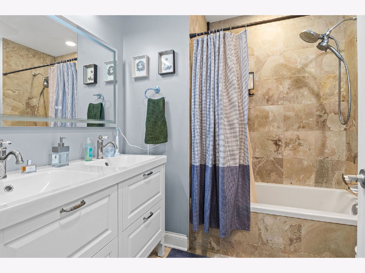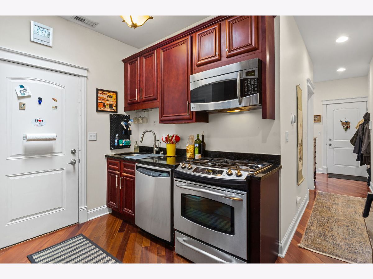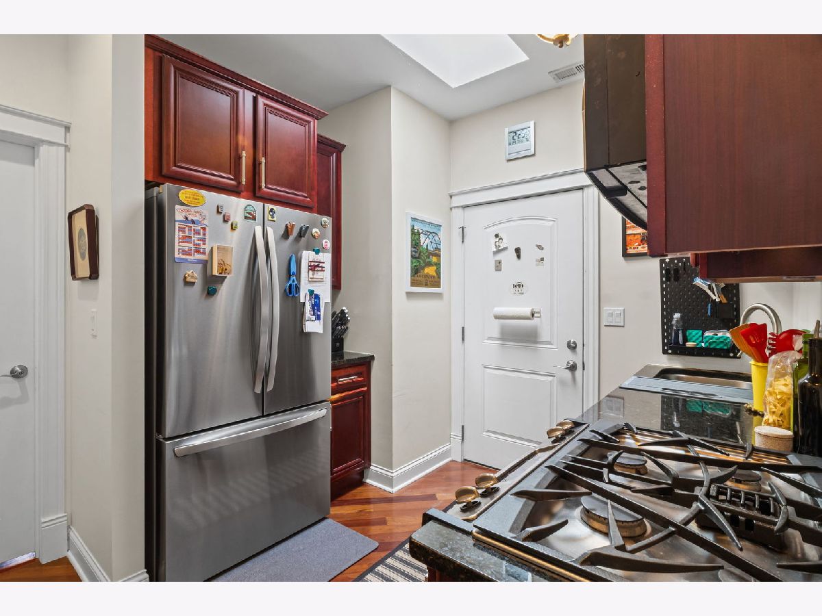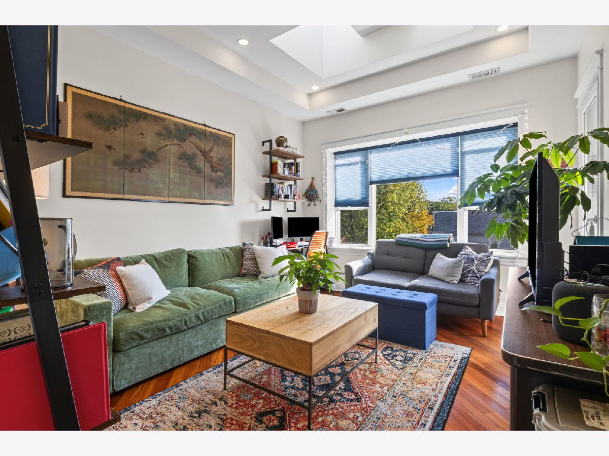 Welcome home to this lovely 2-bedroom, 1-bathroom sunlight-filled top-floor unit in the heart of Logan Square! The inviting main living area is filled with natural light from skylights and opens to a private south-facing balcony through a patio door that allows airflow without opening or easily snaps in place to open with the handle. The galley kitchen features stainless steel appliances, a dishwasher, and rich cherry wood cabinetry-perfect for any home chef. Two generous-sized bedrooms share a beautifully updated full bath (renovated in 2025). Additional highlights include a storage unit in the basement and a back deck ideal for grilling or relaxing. Easy street parking and an unbeatable location close to the Blue Line, the 606, restaurants, coffee shops, and all that vibrant Logan Square has to offer.