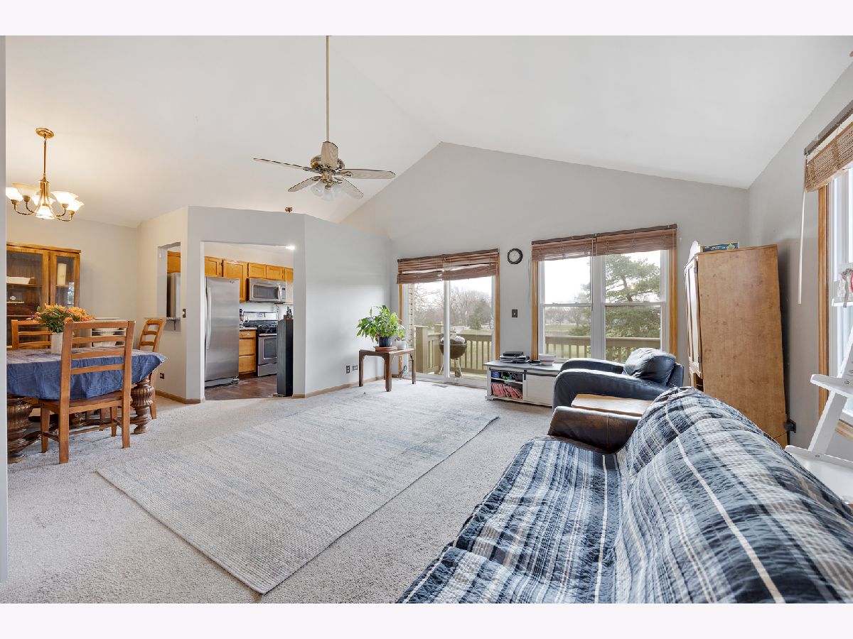 Upper-level unit in the desirable East Hamptons subdivision offering a bright and open layout with private entrance and vaulted ceilings in the living room. This 2-bedroom, 1-bath home features a separate dining area, kitchen with granite countertops, and two well-sized bedrooms with shared full bath. Enjoy natural light throughout and a private balcony with views of Fox Run Golf Course and pond. Additional highlights include in-unit washer and dryer, attached 1-car garage, and low monthly association dues. Conveniently located near shopping, dining, parks, major highways (53/90/290), and within highly rated Mead and Conant High School districts.