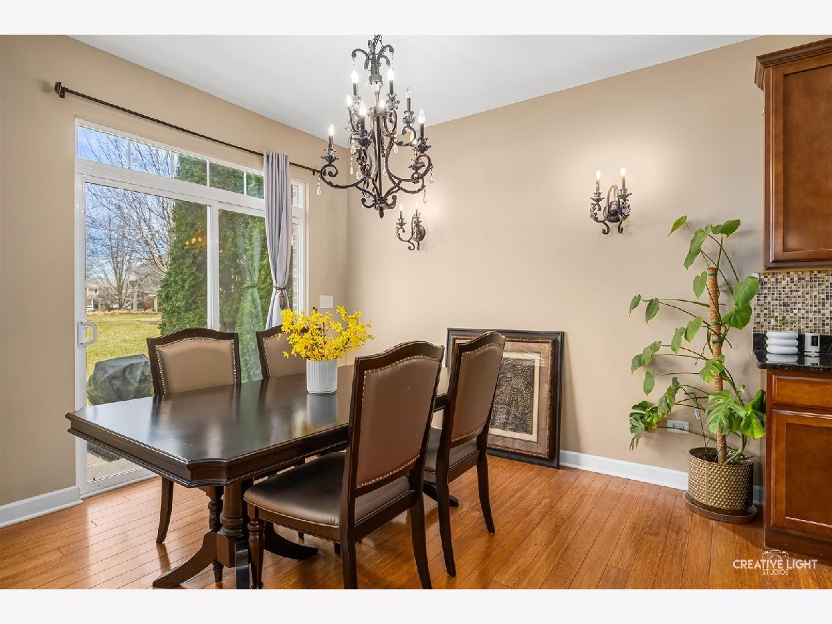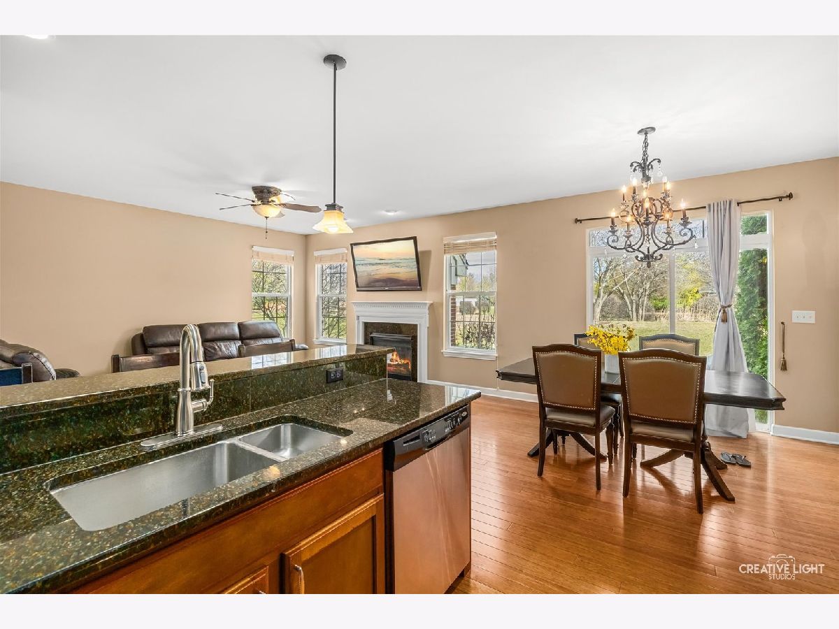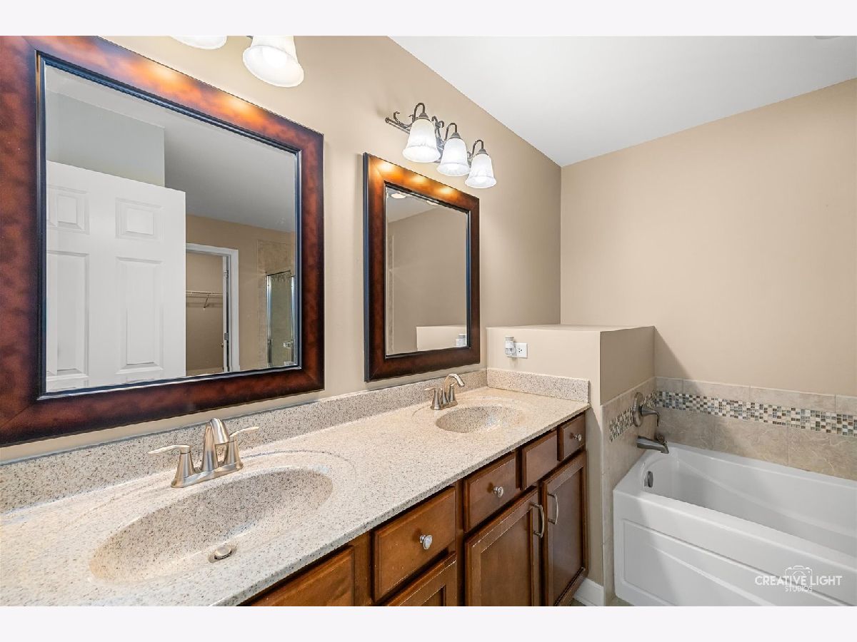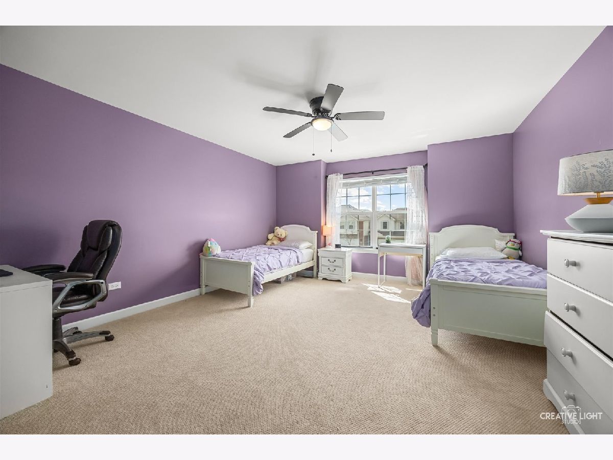 Builder's personal luxury end-unit townhome with 3,110 sq ft of finished living space, including a beautifully finished basement. Backing to a scenic park with gazebo, this sun-filled home offers the privacy and feel of a standalone residence with a private entrance and brick paver patio. The freshly painted main level features an open floor plan with bamboo hardwood flooring, neutral decor, and a cozy fireplace in the living room flowing into the dining area and kitchen. The kitchen includes granite countertops, breakfast bar/island, stainless steel appliances, pantry, custom backsplash, designer lighting, and recessed lighting. The spacious primary suite offers a tray ceiling, walk-in closet, double vanity, soaking tub, and separate shower. Two additional bedrooms share a full bath, with one offering direct access. Convenient second-floor laundry includes high-end washer/dryer, cabinetry, and a utility sink. Finished basement with egress window provides flexible space for a family room, office, gym, or hobby area. Low HOA covers water, sewer, garbage, lawn care, snow removal, and exterior maintenance. Prime location near parks, schools, shopping, Whole Foods, Route 59, Ogden Ave, I-88, and I-355.