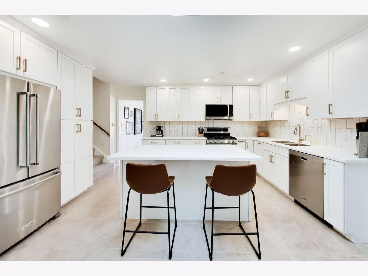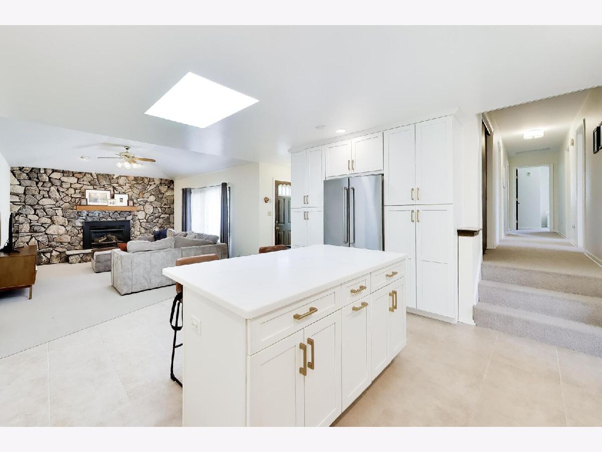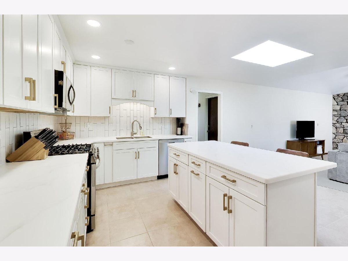 This home is a stunner with its open, light-filled spaces and gorgeous updated kitchen! An impressive wall of cabinets with double pantries flank the new stainless steel refrigerator and gives that "high-end look" right out of a magazine. Center island with seating, new gas range, skylight and beautiful countertops. The kitchen is open to a large family room with fireplace and sliding doors that lead to a private patio; a perfect trifecta for relaxing and entertaining. The living and dining rooms have new flooring and two large bow windows that let the sun shine in. Four generous bedrooms including a primary ensuite with walk-in closet. The hall bath has been updated with new vanity and flooring. Wood floors under the carpet in the bedrooms and hallway too! The basement is enormous and has a wet bar and large laundry room as well as a huge storage area. Two car attached garage. This house has so much to offer and is tucked into a wonderful quiet area yet surrounded in all directions with wonderful restaurants and incredible shopping.