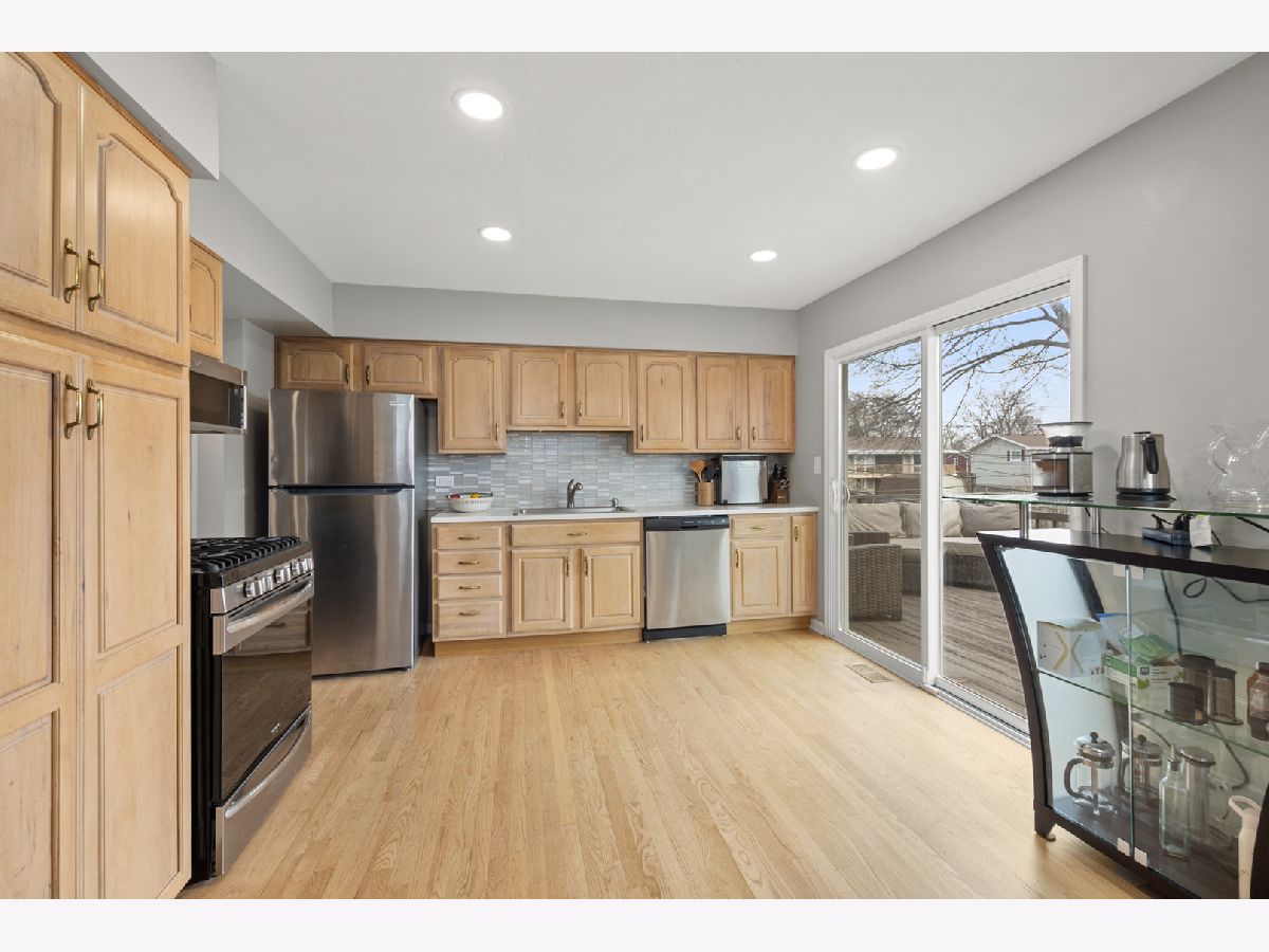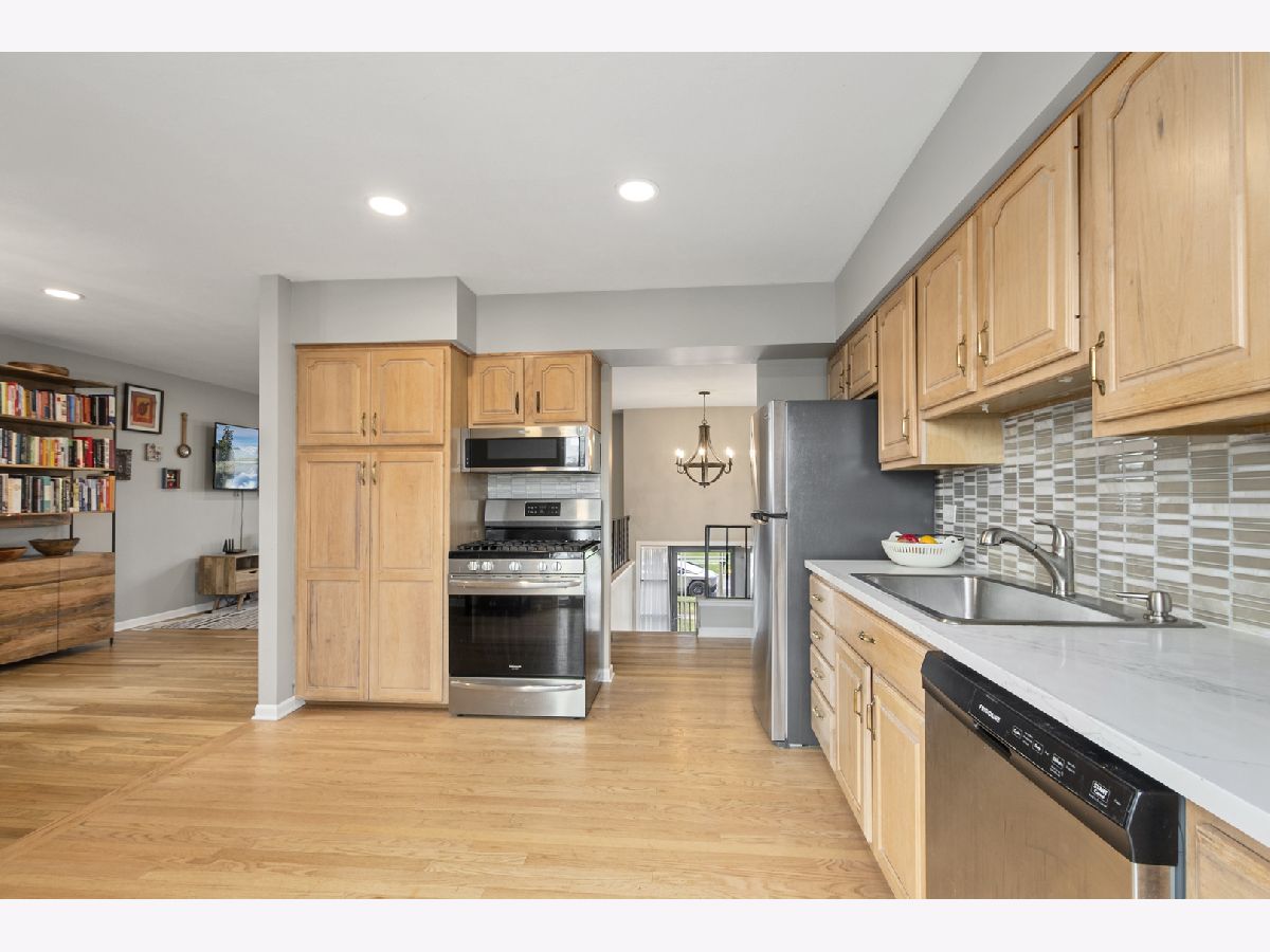 Beautifully updated home overlooking Kensington Park. Three bedrooms, 2 full renovated baths. Updated Kitchen with newer stainless steel appliances, opens to dining room and has sliding glass door which opens to large deck overlooking park. Hardwood flooring on first floor. The walkout lower level offers a brick fireplace in family room, bedroom, full bath and laundry room. Two car attached garage. Conveniently located to schools, shopping and major travel arteries. Furnace 2016, tear off roof 2023. New insulation in attic in 2025, two new sliding glass doors in 2024, new bathroom window in 2024.