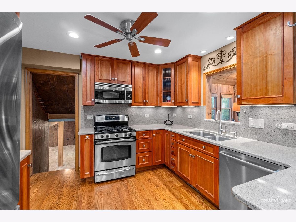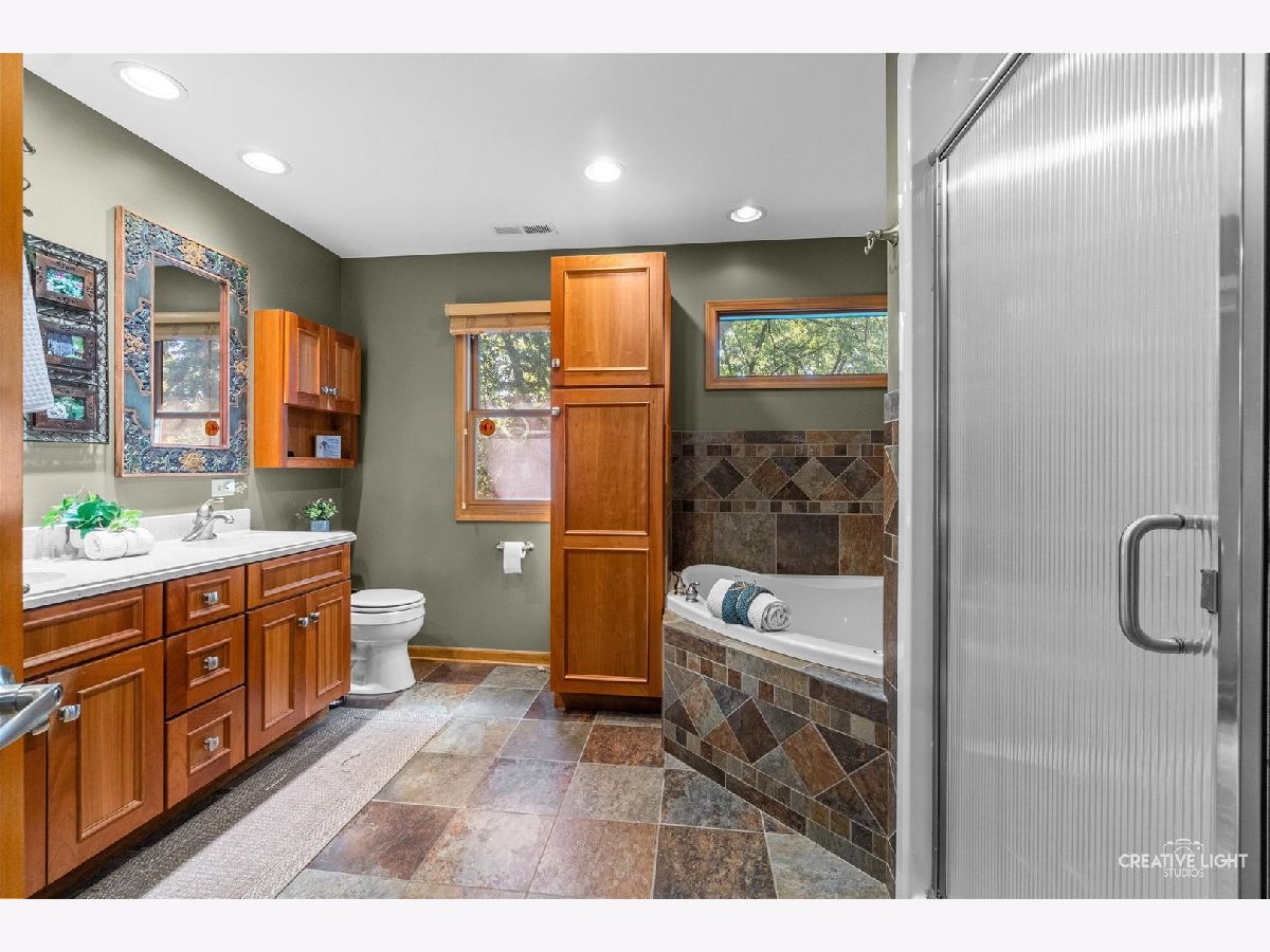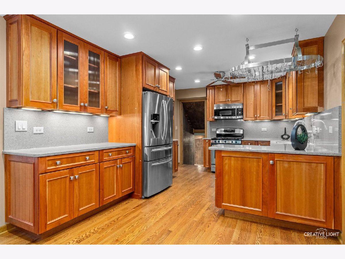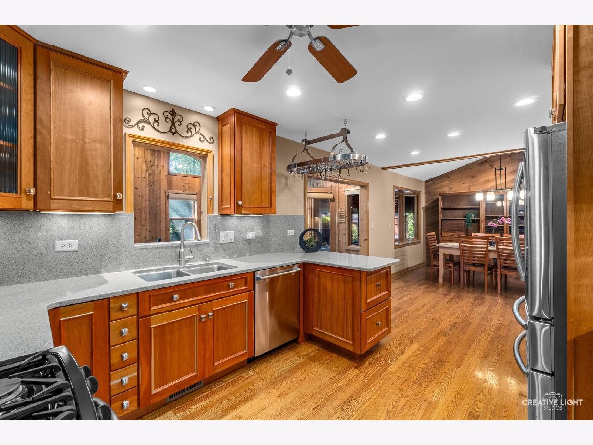 Now is your opportunity to own this beautiful home, as it is now on the market for first time in over 60 years! The unique combination of privacy, spacious living, and convenient access to key amenities makes this home very appealing. This residence's over 2,400 square feet of well-designed living space, complemented by additional screened rooms and a generous one-acre lot will give everyone the space they need. You will be wowed by the updated eat-in kitchen featuring custom cherry cabinets (make sure to check out the extra large pot and pans drawers), quartz countertops and backsplash, and stainless steel appliances including the oven, refrigerator (2016), dishwasher (2016) and microwave. Enjoy relaxing or entertaining in both of the inviting living areas that include a cozy stone fireplace, beamed ceiling and vaulted ceiling with windows providing stunning yard views. Up a few stairs are 3 nice sized bedrooms that have been freshly painted and a full bath. Up a few more stairs is the primary suite which showcases the vaulted ceiling, electric fireplace, two closets including a walk-in with extra storage and a wall full of closet space including a fireproof safe. Your spa like en suite bath features 2 sinks, cherry vanity, walk-in shower, jetted tub, and porcelain tile/heated floor. The English, walk-out basement has even more living space with the recreation room, laundry room includes the washer, dryer, utility sink and cabinets for storage, powder room and access to the crawl. Other special features include the 2 1/2 car garage with gas line ready for a heater, deck, skylights, fenced in area with shed, city water (plus well for outside watering), RV deposit and city sewers; all further emphasize the thoughtful design and functionality of this home! Enjoy living in a peaceful setting while remaining close to dining, retail, highly rated district #200 schools and easy access to I-88. Welcome home!