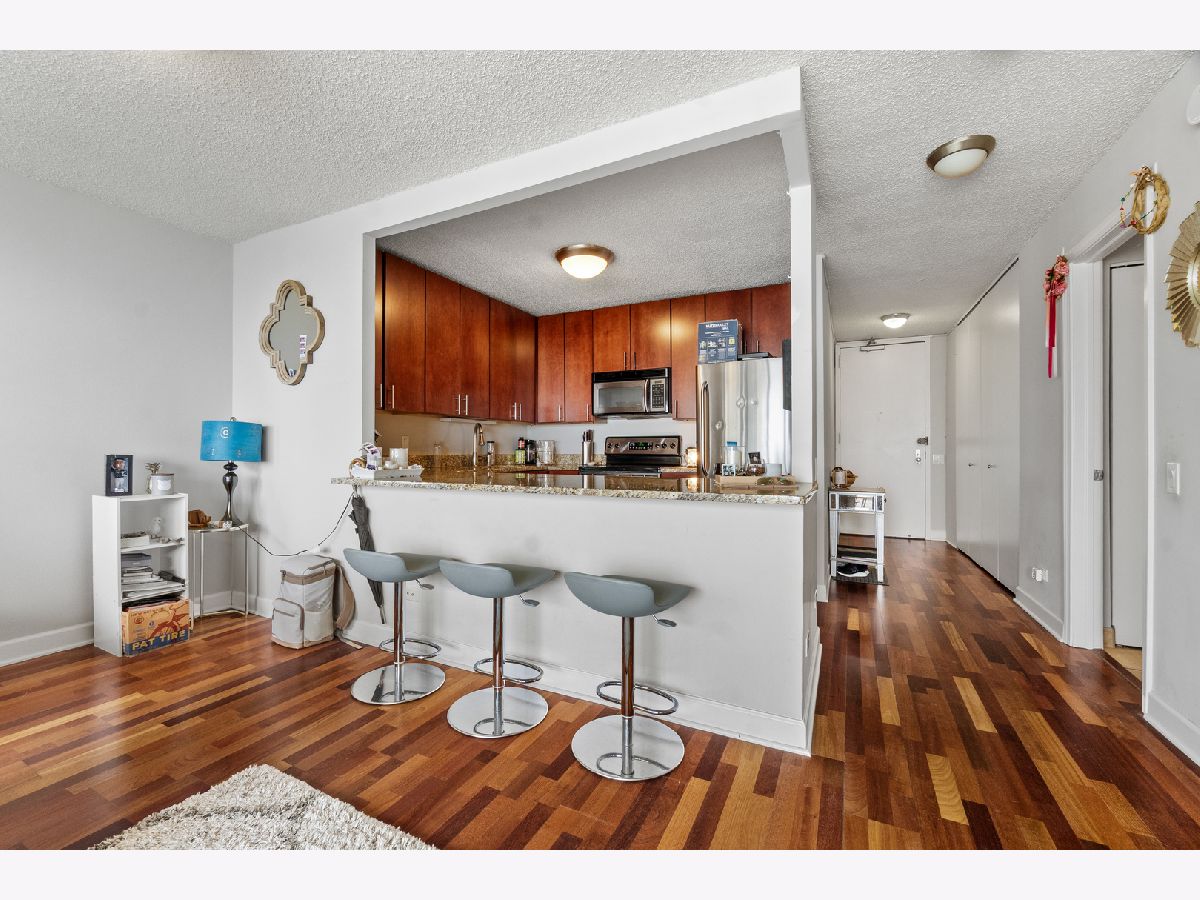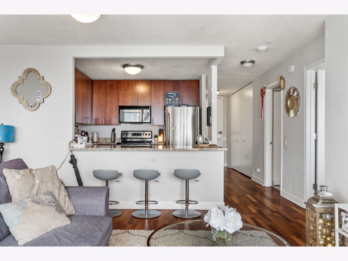 Perched on the 53rd floor, this sun-filled one-bedroom residence offers elevated city living in the heart of River North, with expansive skyline views and an open, airy layout designed for modern living. The thoughtfully designed kitchen features stainless steel appliances, granite countertops, and a breakfast bar that flows seamlessly into the living and dining areas-perfect for entertaining or unwinding while taking in the city lights. Hardwood floors run throughout the home, complemented by a marble bath with a tub and shower combination. Residents enjoy access to a full suite of amenities including 24-hour door staff, an outdoor pool and sundeck, expansive terrace with grilling stations, fitness center, party room, private movie theater, community laundry room, and on-site dry cleaning. Located just steps from River North's celebrated restaurants, coffee shops, galleries, and nightlife, with Michigan Avenue shopping, the Chicago Riverwalk, and convenient transit options all moments away. Deeded parking is available for an additional $30,000 and must be purchased with the unit.