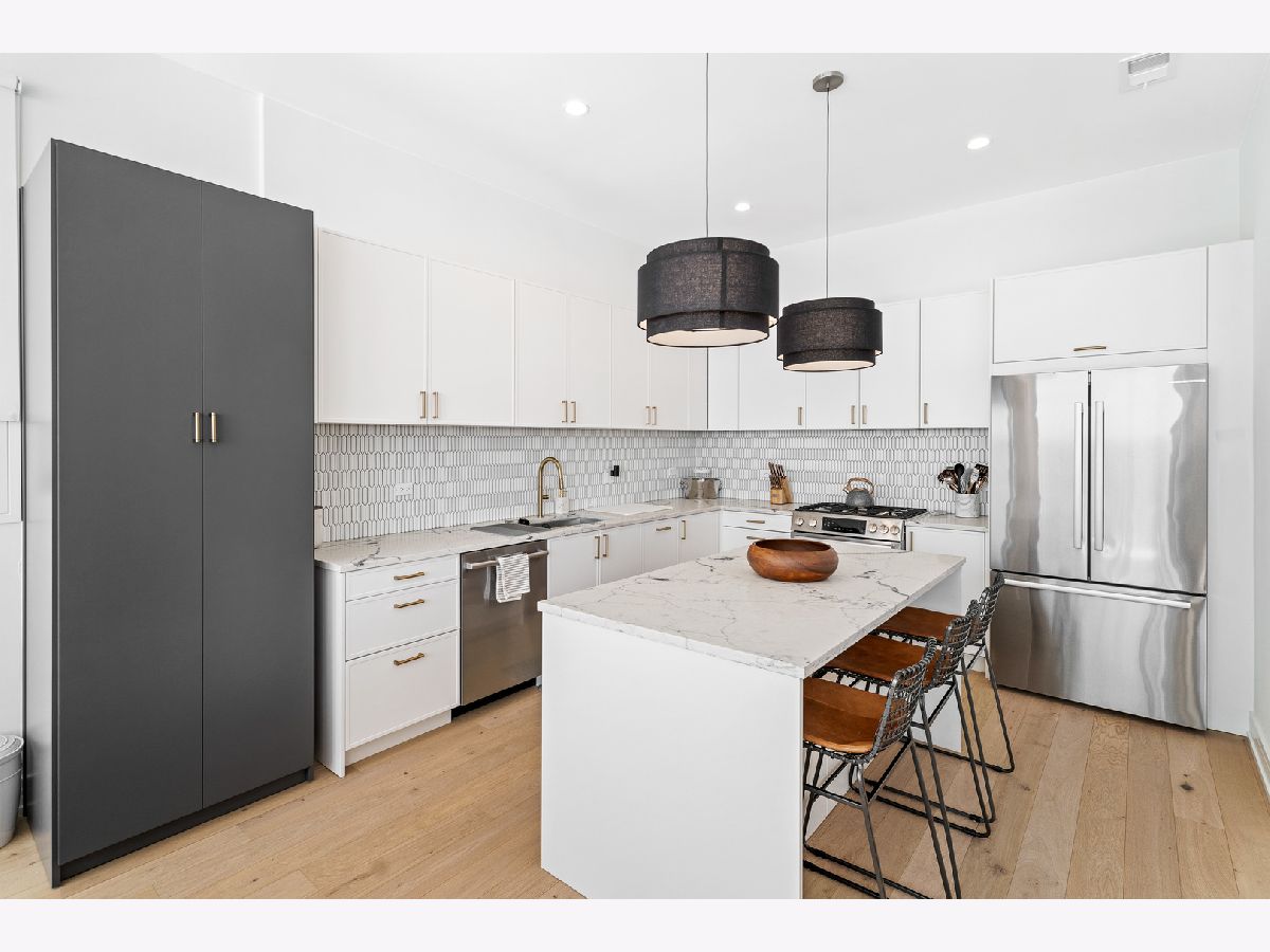 This sought-after Lyndale Trio, in Logan Square, steps away from Palmer Square Park, Farmers market, and some of the finest dining and shops in the City. This 3rd Floor home features 2-bedrooms with walk in closets, a custom murphy bed included ,2- baths include steam shower porcelain tile and heated floors, hardwood floors, large living room with a fire place, a entertainment kitchen of your dreams with a full size island, Bosch appliances. The large rooftop deck with views of the Chicago Skyline and Navy pier fireworks a rooftop bar and surround sound though out unit. Make this amazing home yours for the holidays.