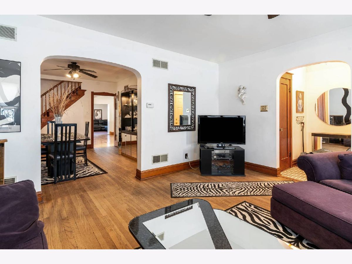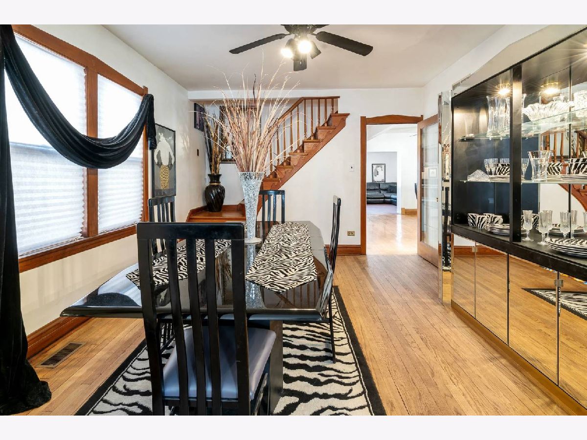 Tastefully remodeled Mills Octagon Brick Bungalow offering original ceramic tile entryway flooring. Large living room and formal dining room for entertaining, feature hardwood floors, natural wood trim and an oak staircase to the 2nd floor. There is a full 1st floor bathroom, and a first-floor bedroom that also has hardwood flooring. Large eat in kitchen with oak cabinets, hardwood flooring and adjacent breakfast room for additional kitchen space. (The breakfast room was originally the 2nd bedroom, but wall was removed) Beautiful 1st floor family room addition is very large and features a corner gas fireplace. Second floor offers 2 more bedrooms with hardwood flooring. Large front bedroom on 2nd floor has a new built-in wall AC unit. Finished basement rec room plus bathroom with shower. Separate laundry room with new Amana washer & dryer. Basement includes a storage space, tool room and glass block windows. 3 new steel exterior doors, new awning at side door. Gas forced air and central air and new Tramco flood control system. 1 car vinyl sided garage. Newer Vinyl privacy fence. Kitchen refrigerator is "as-is" and dishwasher not working. Close to Elmwood Park "Circle" restaurants, community rec center, pool & parks and area amenities. Shopping, CTA, Metra, and public transportation all nearby. Close to grade schools & shopping.