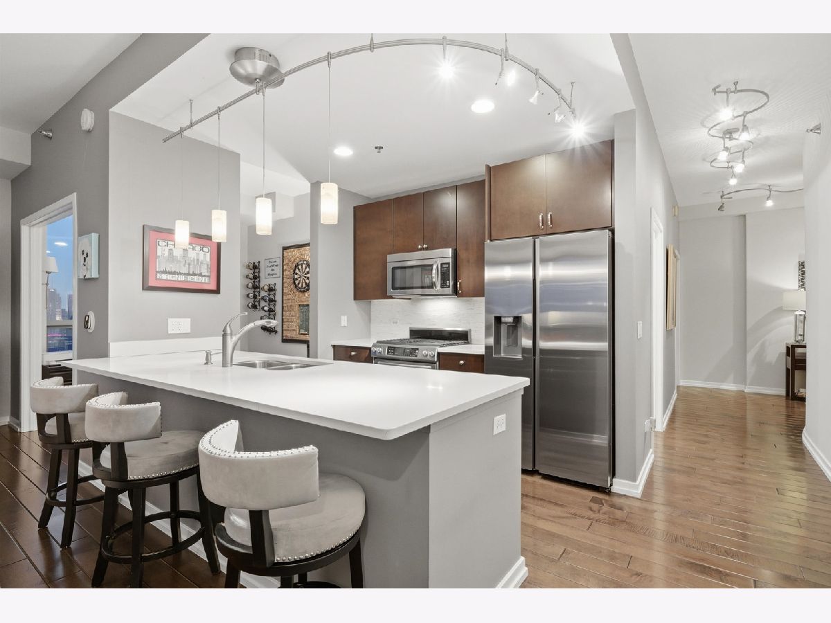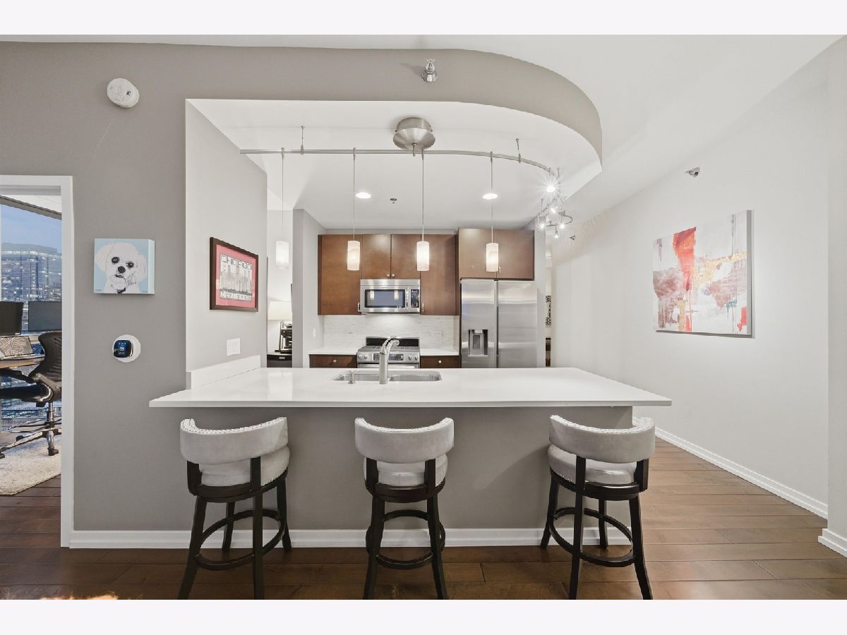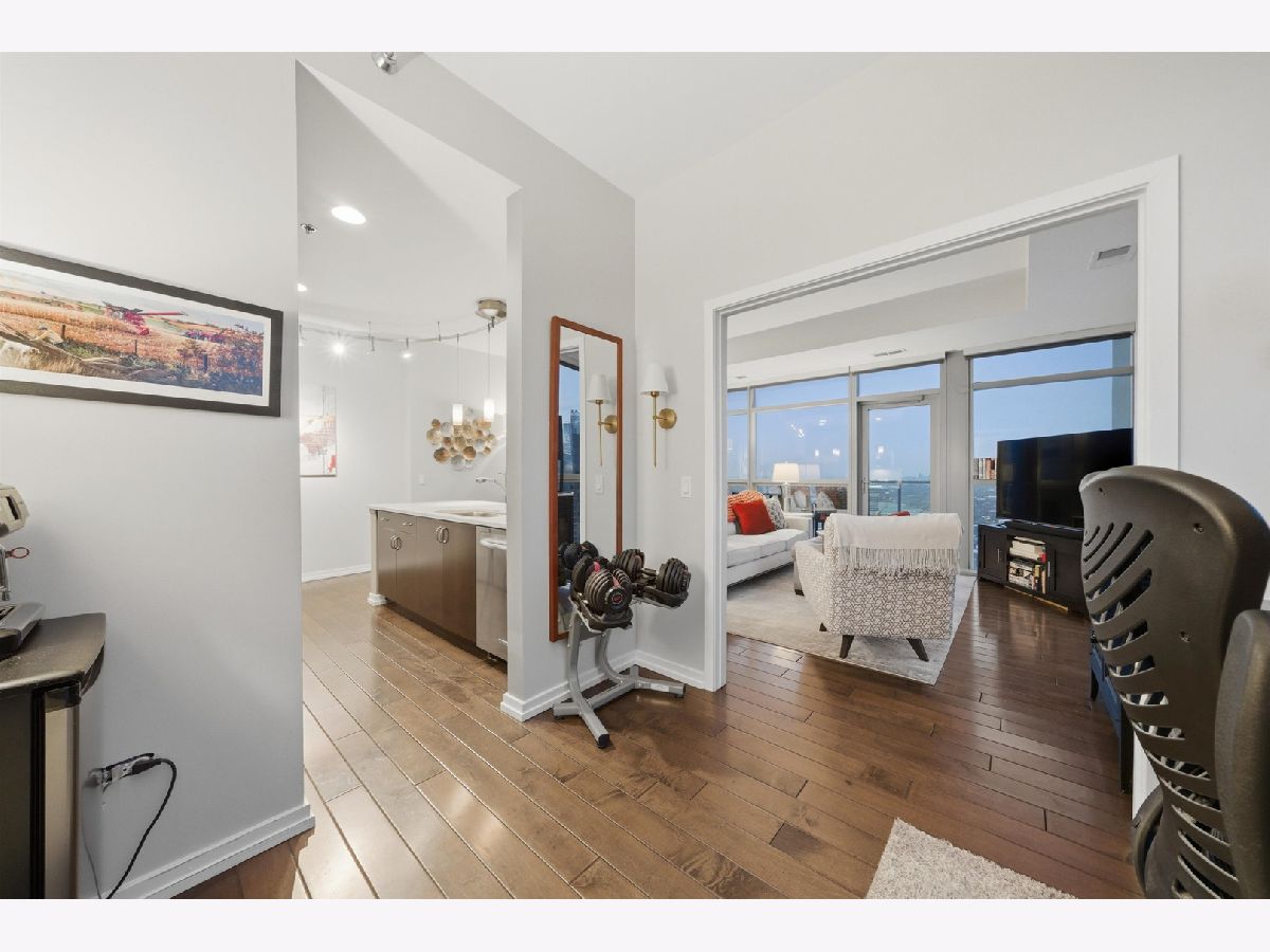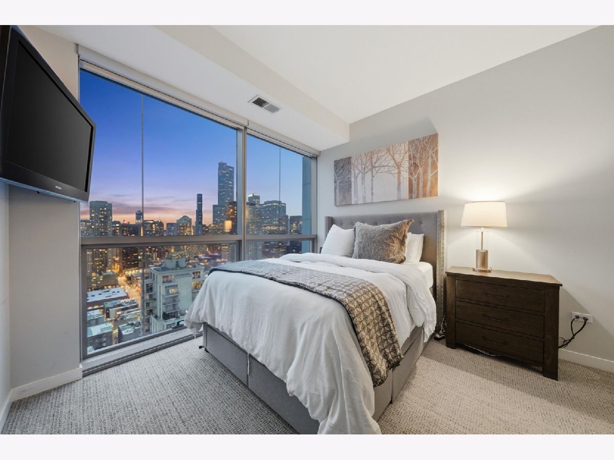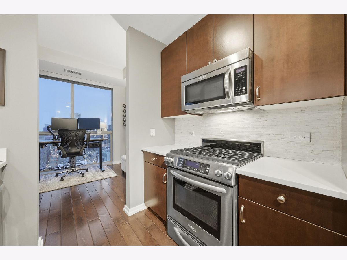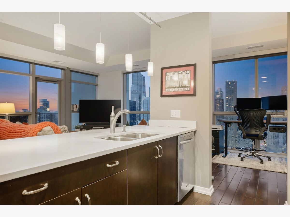 Highly sought-after corner residence at the desirable Silver Tower, showcasing breathtaking north and east city skyline views. This stunning 1-bedroom + DEN, 1-bath home is a must-see! Beautiful hardwood floors run throughout the kitchen, living area, and second bedroom. The updated chef's kitchen features generous counter space, abundant cabinetry, and stainless steel appliances. Floor-to-ceiling windows flood every room with natural light and showcase the spectacular views from every angle. Step out onto your private terrace and take it all in - the skyline backdrop is unforgettable. The spacious primary bedroom offers excellent closet space, while the versatile second bedroom works perfectly as a home office or guest room. An updated bathroom completes this thoughtfully designed layout. Deeded garage parking available for an additional $35k. Silver Tower is a full-amenity building featuring 24-hour door staff, an on-site engineer, fitness center, two sun decks, EV charging station, guest parking, and additional storage. Enjoy unbeatable proximity to East Bank Club, the Chicago Riverwalk, dog parks, restaurants, Target, Michigan Avenue, Lake Shore Drive, and Oak Street Beach. An incredibly convenient location - truly a dream condo. Be sure to explore the property in 3D - click the 3D tour button to virtually walk through every detail.