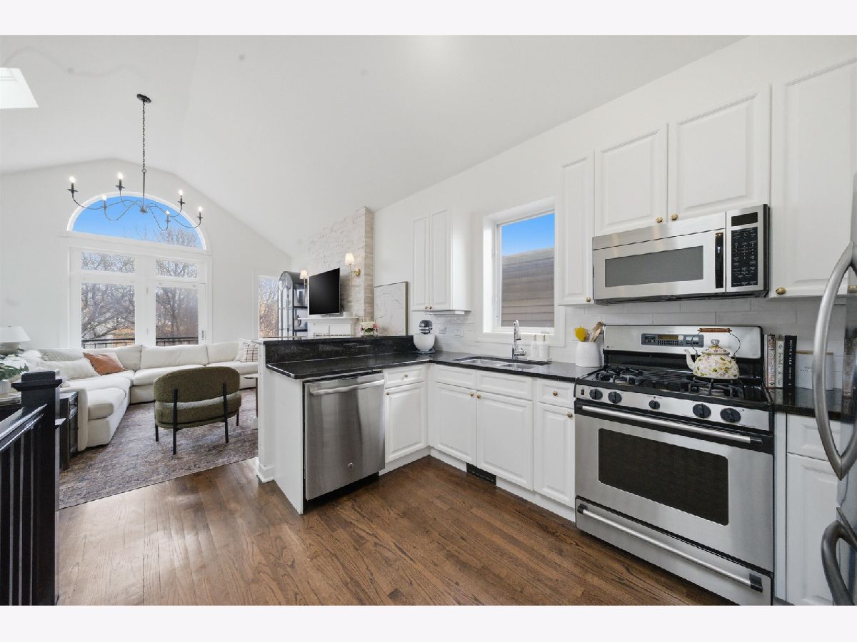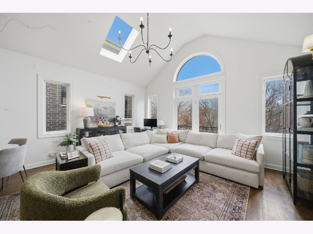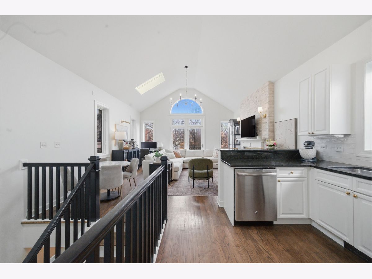 Penthouse, sun-filled 2-bedroom, 2-bath condo in a prime Lakeview location! Vaulted ceilings and skylights brighten the spacious living and dining area, featuring a cozy gas fireplace and seamless flow into a stylish kitchen. The kitchen offers white cabinetry, granite countertops, a breakfast bar, and stainless steel appliances. The primary suite includes generous closet space and an en-suite bath with a dual vanity. A well-sized second bedroom is perfect for guests or a home office, with a second updated bath conveniently located just across the hall. Hardwood floors run throughout, along with a newer washer and dryer. Enjoy a large private deck with direct access from the primary bedroom, perfect for relaxing or entertaining. Garage parking and additional basement storage are included. Recent upgrades include a new sliding glass door in the primary bedroom (2025), full renovation of the primary bath (November 2024), guest bathroom renovation (May 2025), custom closets in all bedrooms, and new paint and light fixtures throughout. Unbeatable location, just steps from the restaurants and shops of Southport Corridor! Explore the property in 3D-click the 3D tour to walk through every detail.
