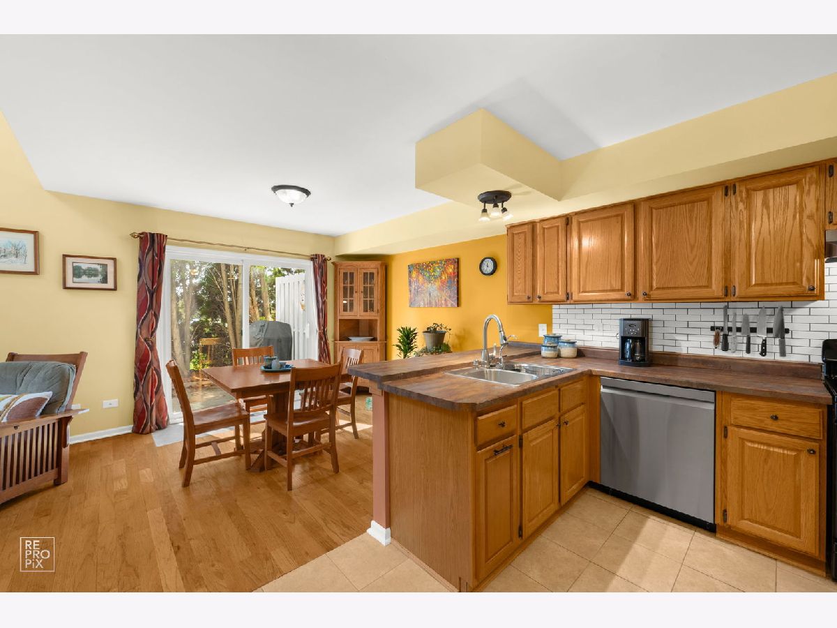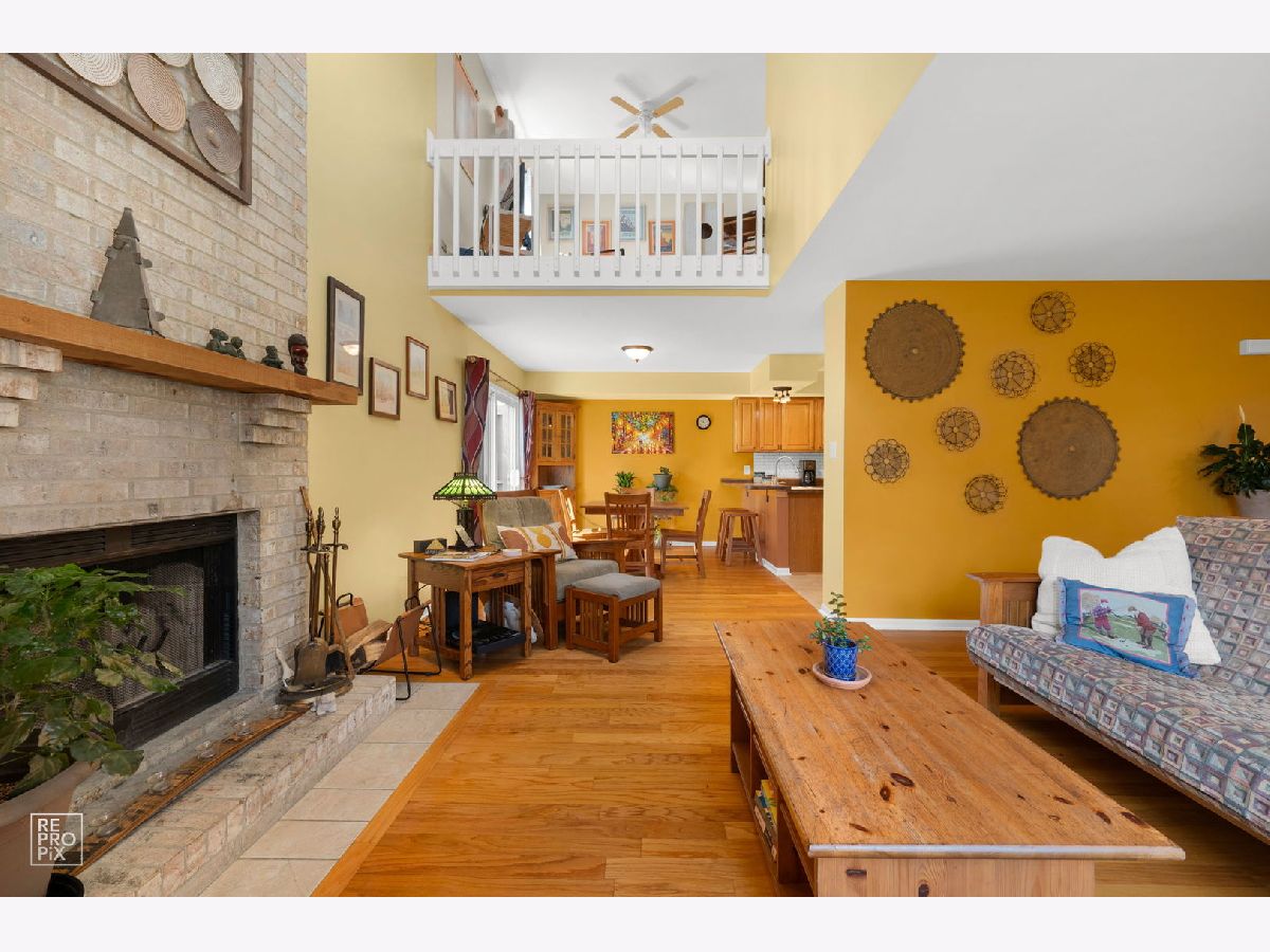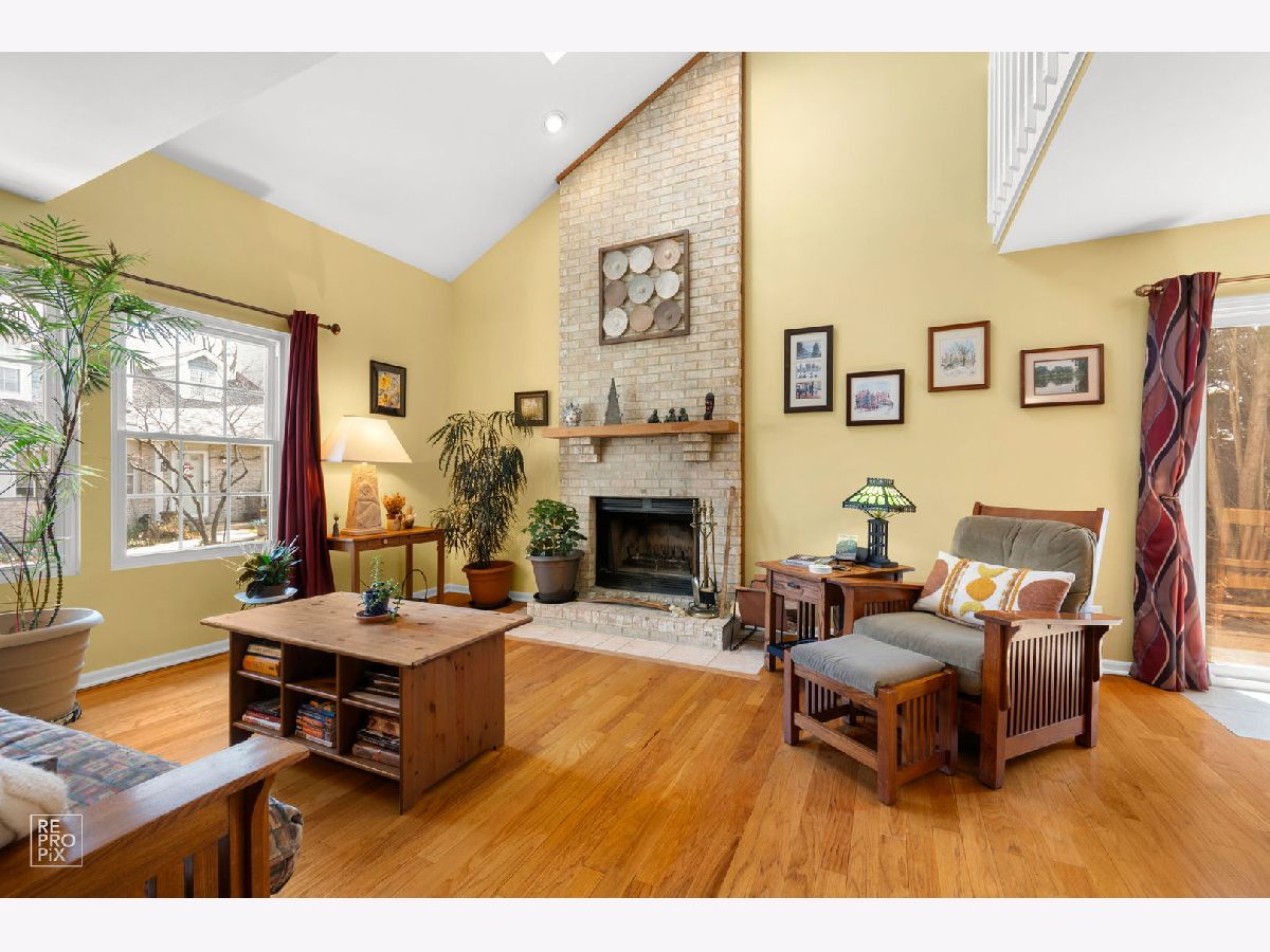 End unit in the Townes of Oakhurst! Largest unit with open floor concept. Living room has oak hardwood flooring, vaulted ceiling, skylight and brick fireplace. Kitchen has been modified from original floor plan for optimal functionality. Kitchen has ceramic tile floor, subway tile backsplash, breakfast bar, reverse osmosis system and pantry. Formal dining room also has oak hardwood flooring with sliding door to private patio. Primary bedroom has custom cabinets for lots of storage, cathedral ceiling and walk-in closet. Large bathroom with double sinks and whirlpool tub. 2nd bedroom has hickory hardwood flooring and built-in murphy bed. Loft has hickory hardwood flooring and can be used as an office or turned into a 3rd bedroom if needed. 2nd floor laundry room and 2 car garage. Great location! Close to the new "Block 59" dining & shopping! Metra to downtown only 3 miles. Close to I-88. Award winning 204 school district. Roof replaced in 2019, Hot Water Heater replaced 2018, Patio Divider replaced 2025.