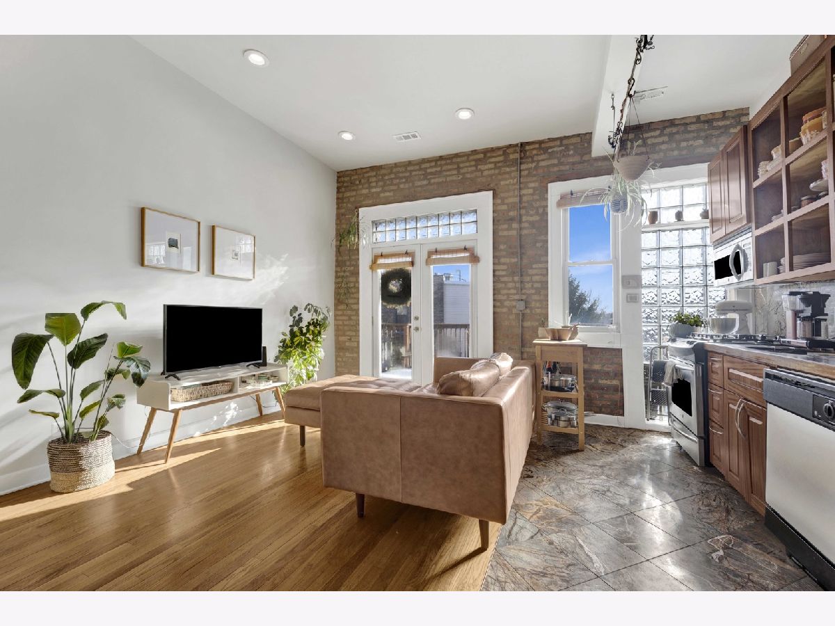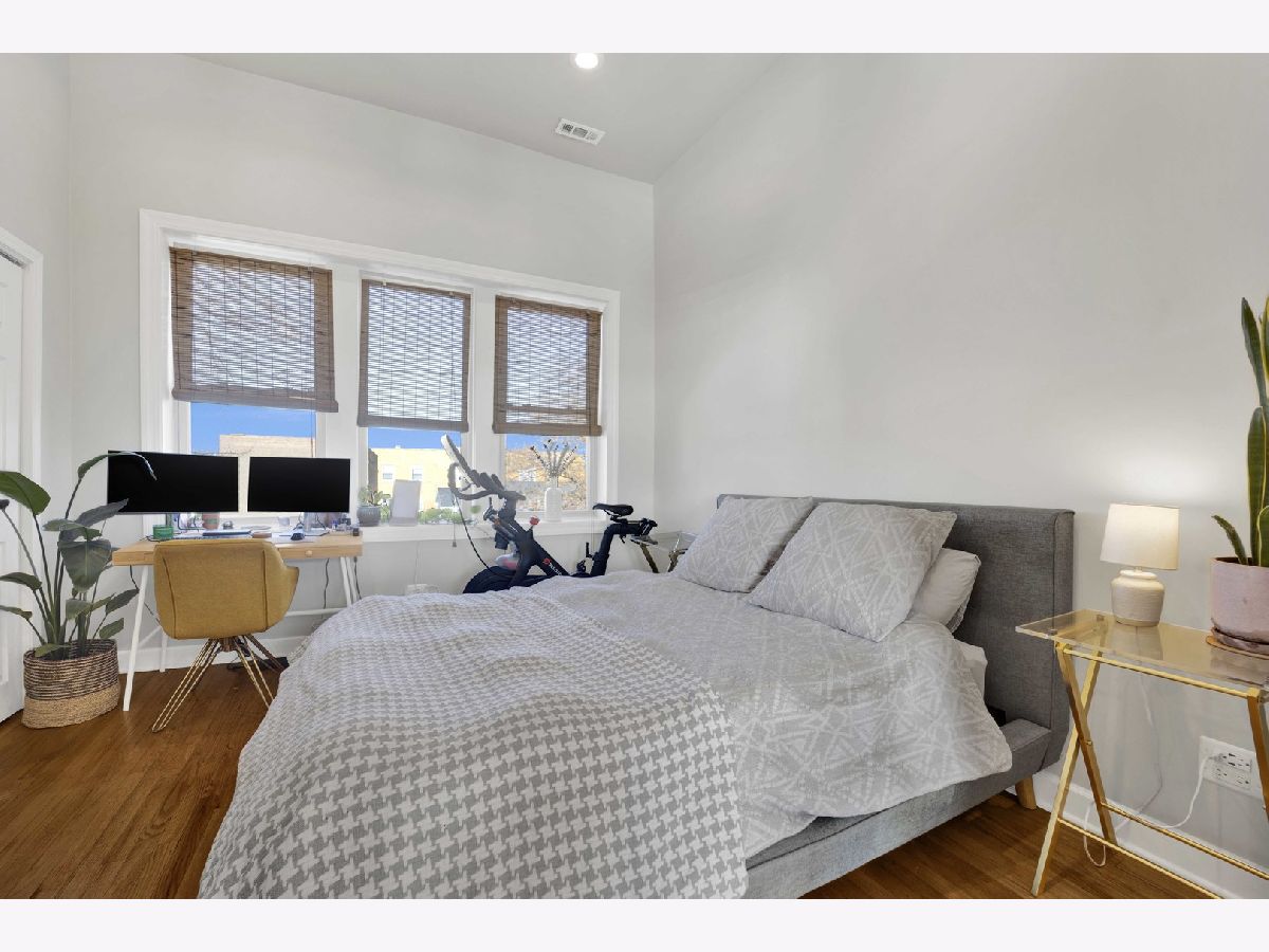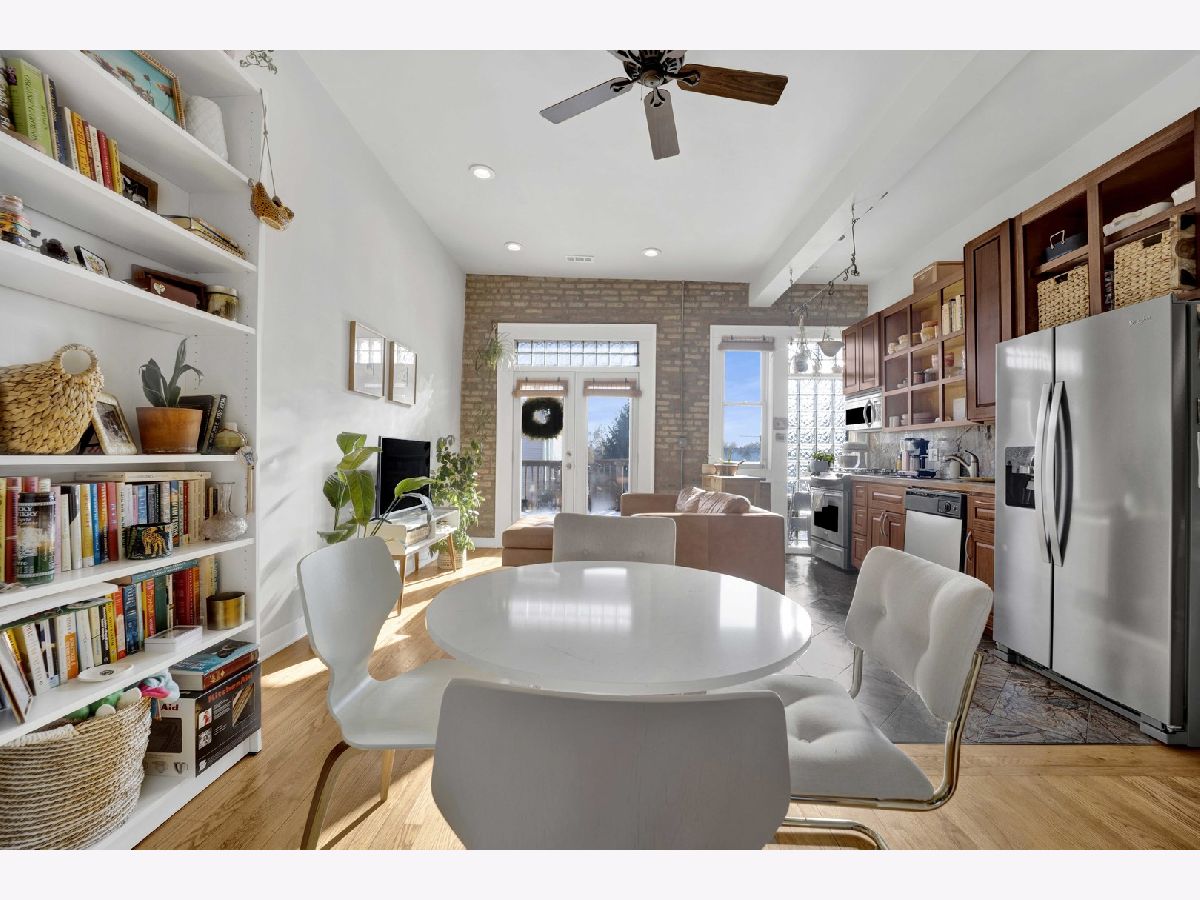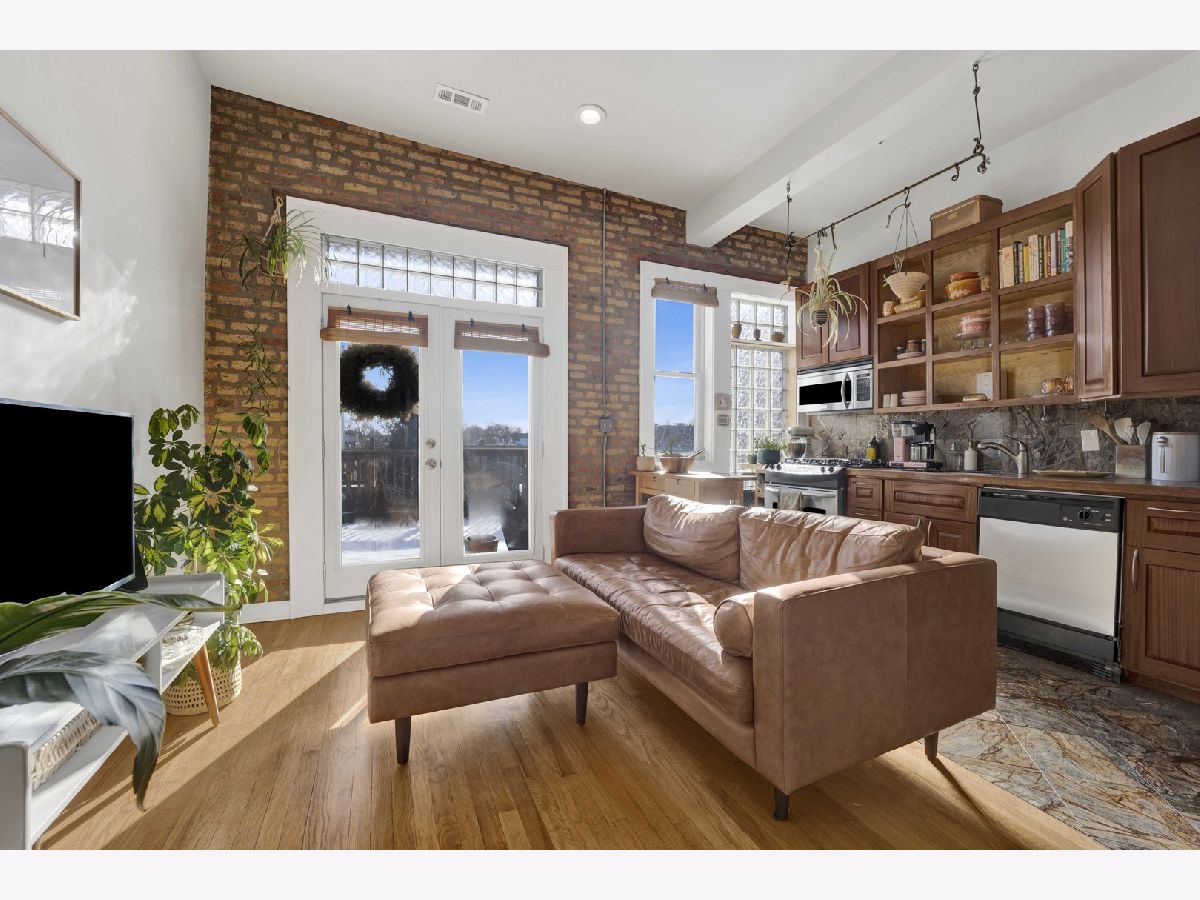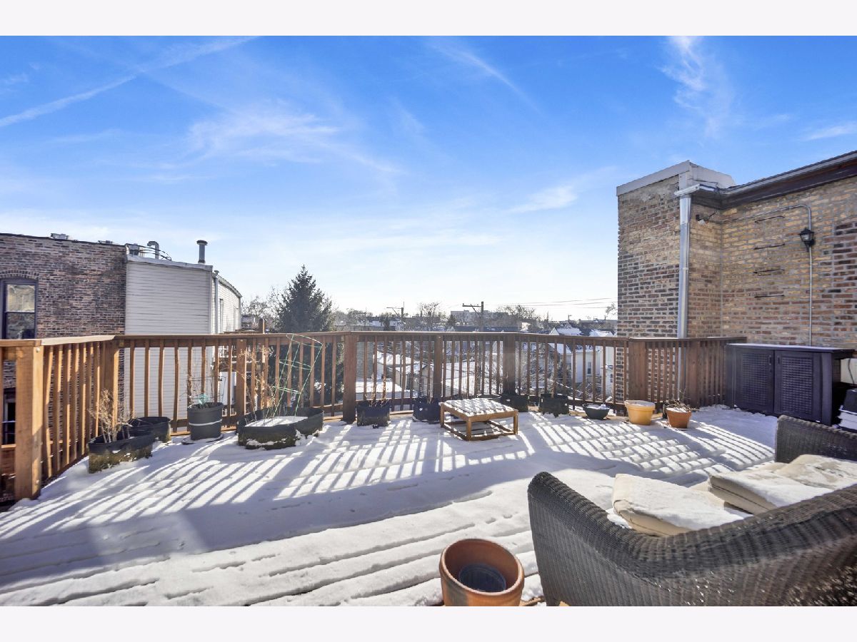 Positioned at the crossroads of Logan Square and Avondale, with quick access to 90/94, this top-floor 2BR/1BA residence pairs vibrant city living with a peaceful, elevated retreat above it all. Natural light fills the open living and dining areas, where soaring ceilings and exposed brick add warmth and architectural character. The layout offers generous room proportions and seamless flow throughout. Just off the kitchen, the oversized deck opens to wide sky and treetop views, creating an impressive outdoor footprint ideal for entertaining or unwinding above the neighborhood rooftops. Additional highlights include an in-unit washer and dryer, hardwood flooring, a tankless water heater, central air and heat, a dedicated storage unit, a low monthly HOA, and easy permit street parking provided by the city. Moments from neighborhood restaurants, coffee shops, parks, the farmers market, the Blue Line, and everyday conveniences - all while enjoying the perspective and privacy of top-floor living. *New shower/tub, tankless hot water heater, and refrigerator. Tenant occupied through 4/30/2026. All showing requests require 24-hour notice.