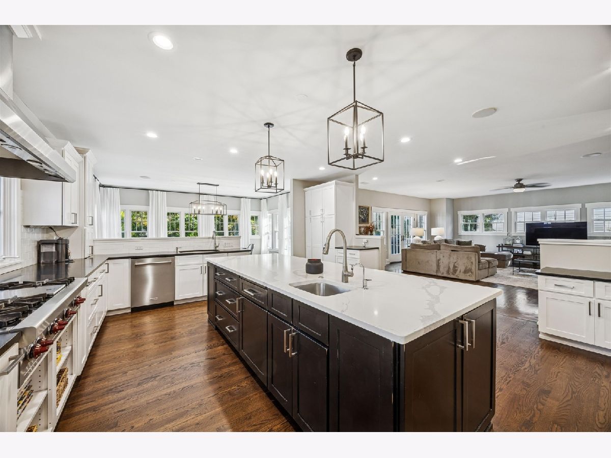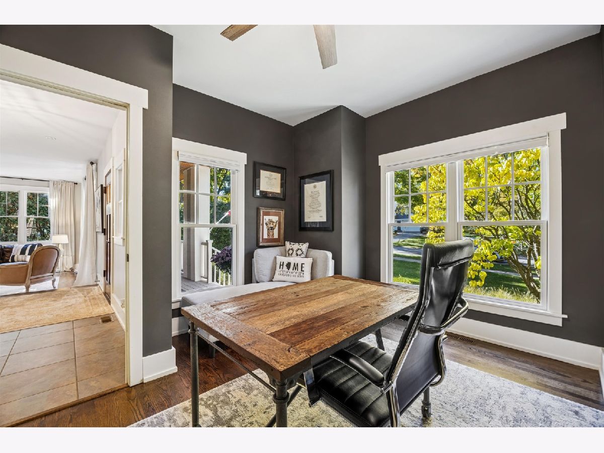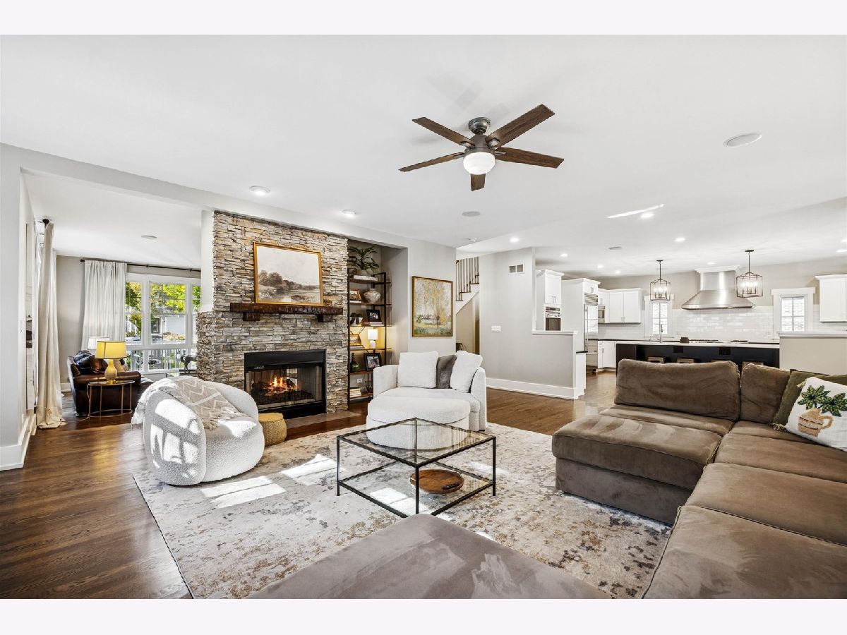 Sitting on nearly a third of an acre, this stunning Modern Craftsman home is sure to impress. The extra-wide 77-foot lot allows for multiple outdoor living spaces and expansive interiors that have been beautifully maintained and thoughtfully upgraded. A welcoming front porch leads into a bright foyer featuring gleaming hardwood floors, a refreshed designer color palette, and large architectural windows that fill the home with natural light. The front of the home includes a private office with stylish built-ins, a spacious formal living room with a double-sided fireplace, a formal dining room, and a renovated powder room. The open-concept kitchen has been fully updated with a large quartz island with seating for four, professional-grade Sub-Zero and Wolf appliances, and an inviting breakfast area with a built-in command center. The adjacent family room opens through wide French doors to a generous deck overlooking the beautifully landscaped backyard with mature trees-perfect for entertaining or quiet relaxation. Upstairs, the primary suite offers vaulted ceilings, a cozy fireplace, and a spa-like bath with split double vanities, soaking tub, separate shower, and new designer lighting. Three additional spacious bedrooms, two full baths, and a large laundry room complete the second floor. The third level is bathed in natural light from multiple skylights, offering a flexible space ideal for recreation, a second office, or a home gym, along with ample attic storage. The walkout basement provides additional living space with a recreation room, a full bath, and direct access to both the garage and backyard. A three-car attached garage with dedicated workshop area adds exceptional convenience and functionality. Walk-to-everything from this prime location: the train, town and Blue ribbon award winning The Lane Elementary School with easy access to I-294 and Ogden Avenue. Make this exceptional home your forever home!