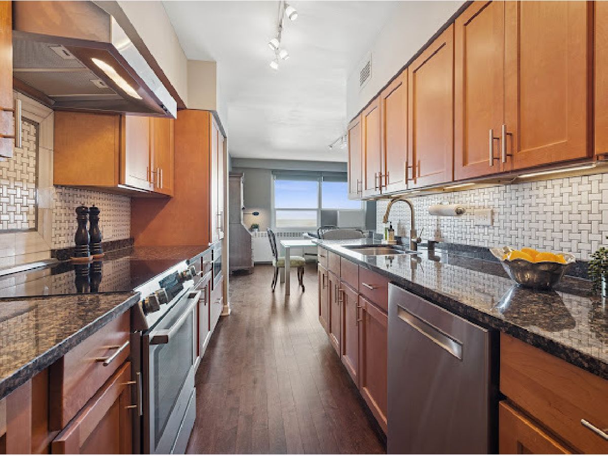 The Upper East Side meets Lake Shore Drive in this well-situated, concierge mid-rise building with panoramic views overlooking beautiful Belmont Harbor and Lake Michigan. From its expansive lobby, your 24-hour doorperson will direct your guests to a semi-private elevator that lifts them above the trees to your well-appointed vestibule (updated in 2025) that is shared with only one other apartment. From there, they enter your central hallway with a large walk-in closet and spacious bedrooms to the left and living rooms to the right. This two-full bath apartment boasts both a large living room and separate dining room/den, as well as a fully fitted and updated kitchen (2022) with custom maple (real wood) cabinets, granite counters, pantry closet, Bosch and Fisher & Paykel appliances and exhaust hood (2022), and Kohler fixtures. Off the kitchen is your private laundry room with LG stackable W/D, a rare amenity in this 23-story building. With large warmly carpeted bedrooms, sleek updated and generously porcelain tiled bathrooms with high-end Toto toilets, recently refinished, chestnut-stained maple hardwood floors (2022), and beige and light-grey accent walls, this residence is move-in ready. You can forget about seasonally variable monthly utility bills: Assessments include heat, cable, electricity (including air conditioning), water, and internet. You also have access to a large private, on-site storage room, two well-equipped exercise facilities, a secure and convenient main floor bike storeroom, and a library/party room from which there is a rooftop garden deck with comfortable lawn furniture, barbecues, and a fire pit. This fully staffed and professionally managed building has strong reserves and a receiving room with staff to deliver your packages to your front door. Additionally, there is ample complimentary daytime parking and reasonable overnight parking for your guests. For your vehicle there is special care, with on-site valet parking for $260 a month. The service includes weekly hand car washing. There are also multiple EV charging stations. Just call down whenever you want your vehicle and it will be brought up. This concierge building is conveniently located in East Lake View within close distance of fine dining, theatres, grocery and drugstores, lake, beach, harbor, Wrigley Field and North Halsted nightlife. Just outside your front door is a non-stop express bus to Michigan Avenue and cross-town bus service directly to the Blue Line for O'Hare International Airport. As Ira Gershwin would say, "Who could ask for anything more?"