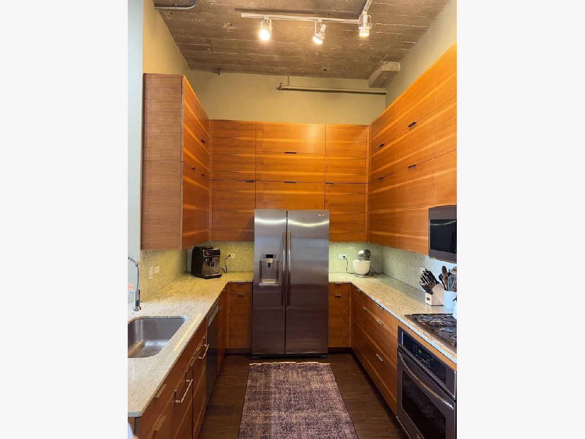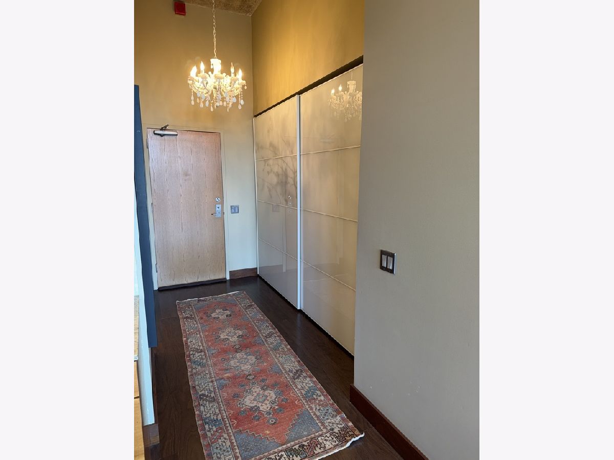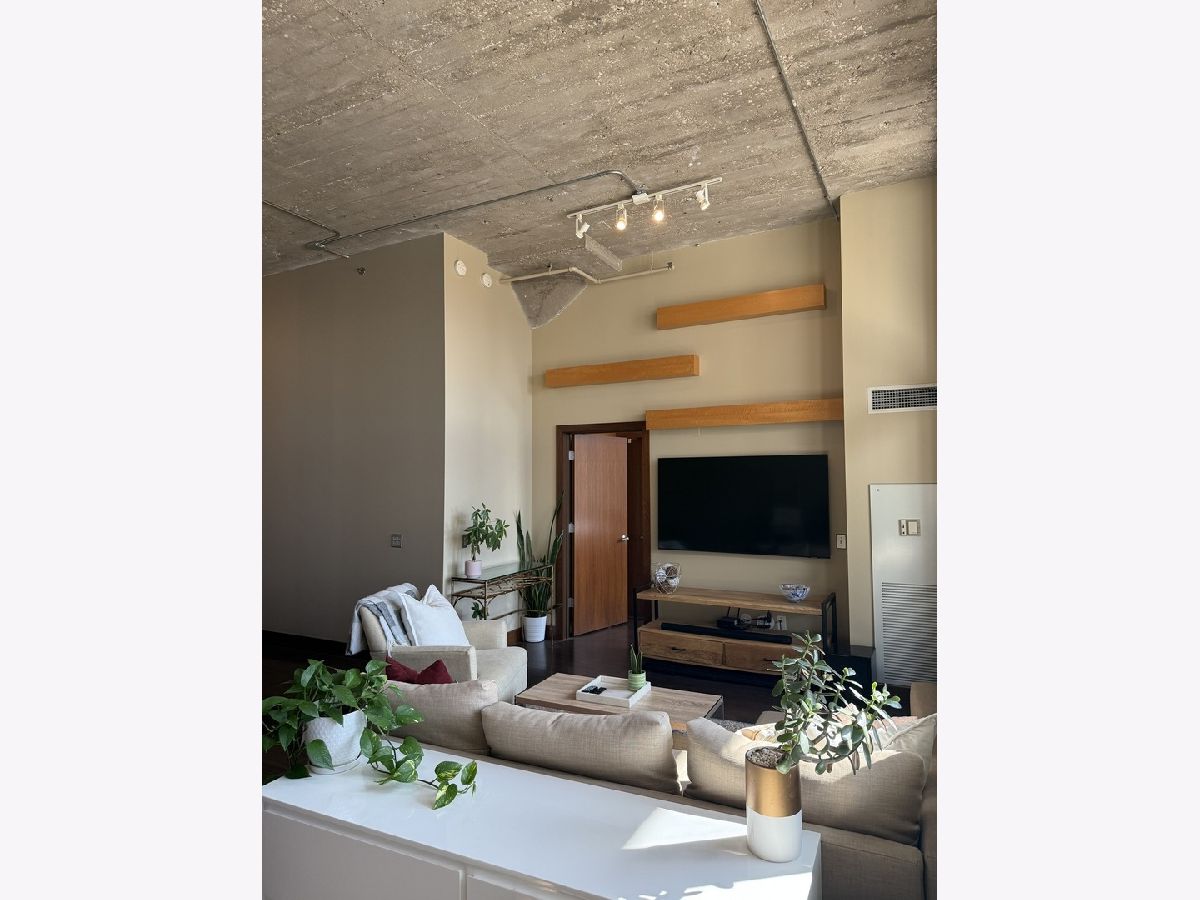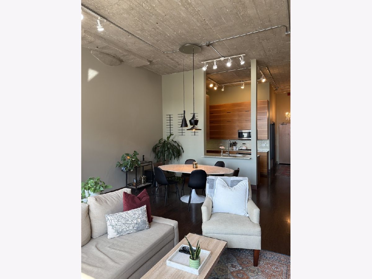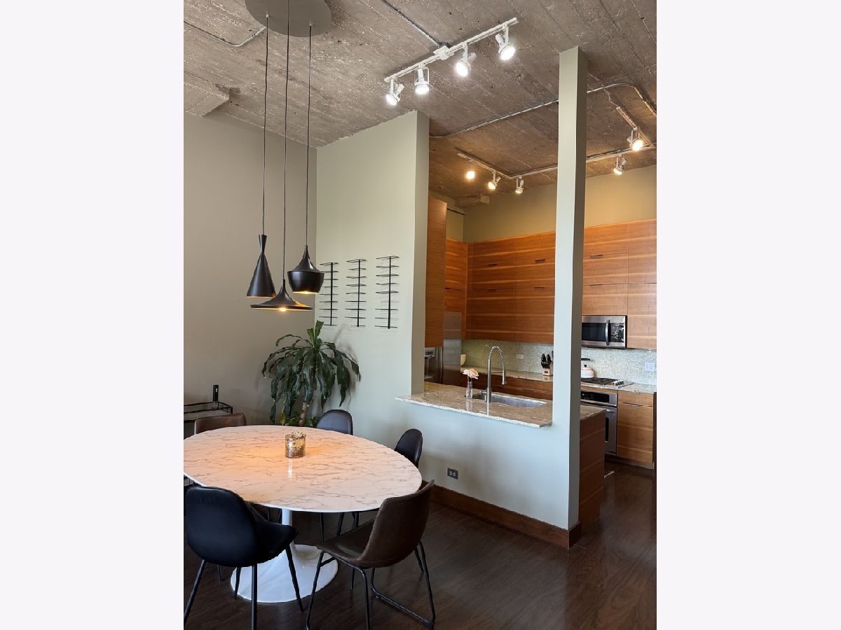 Step into this stunning light-filled 1-bedroom unit at Chess Lofts! South-facing with soaring 12-ft concrete ceilings, exposed brick, huge windows, and dark wide plank floors - this one is not to be missed. Once a 2-bedroom/2-bath, now converted to a 1100 square foot 1-bedroom/2-bath, you will be amazed by how expansive the hosting space is with ample storage throughout- no detail was missed when renovating this unit! Kitchen features custom cabinetry, pull out cabinet drawers, stainless steel appliances (Dishwasher and Microwave updated in 2025), and granite countertops. Entryway includes a completely enclosed custom closet with in-unit W/D. Large dining space with chandeliers throughout. Living space was previously split to include an office. Unique pull-out projector screen from one of the shelves in the living space. Fully-enclosed primary bedroom has blackout shades, beautiful hanging light fixtures, and an ample walk-in closet. Two large full bathrooms with storage. This home is perfect for entertaining with a 100sqft private terrace! The building offers a rooftop deck with incredible city and lake views, a gym, bike storage, package room, and onsite engineer. Parking space additional $30k and includes space for storage bins. HOA assessments include heat, air, cooking gas, water, common area maintenance, scavenger, common area gym, rooftop and package room. Building is PET FRIENDLY and is located next to a dog park, playground, lakefront path, museums, boat harbor, Grant Park, Solider Field, Wintrust Arena and McCormick Place! Ample street parking available, minutes to public transit and dining/entertainment. Investor friendly - no rental cap! Mint condition!