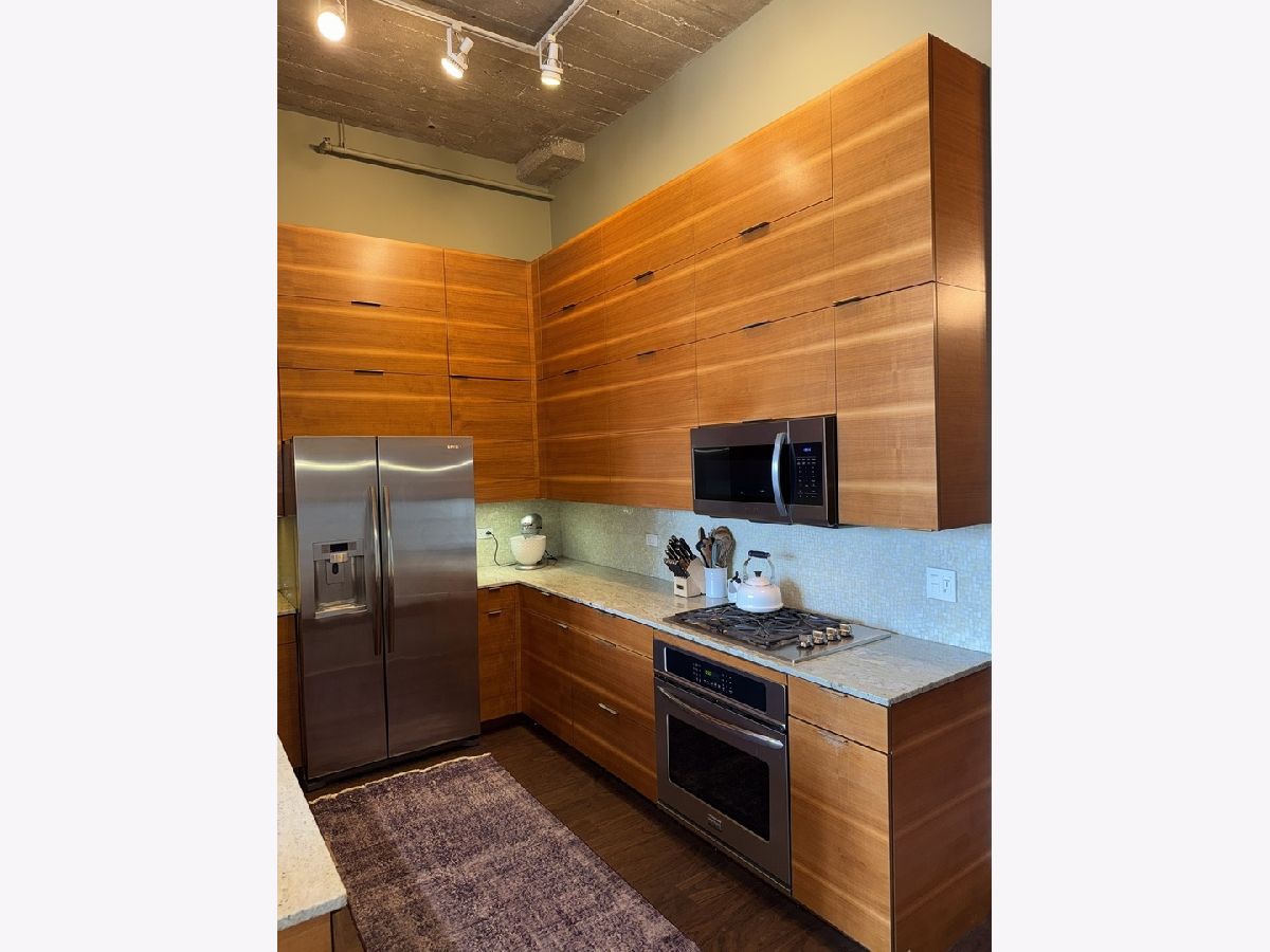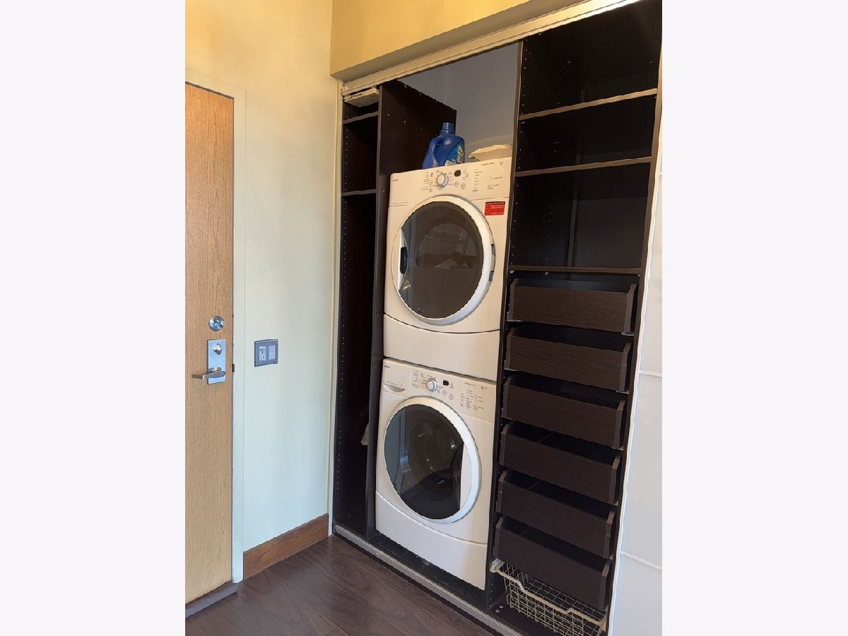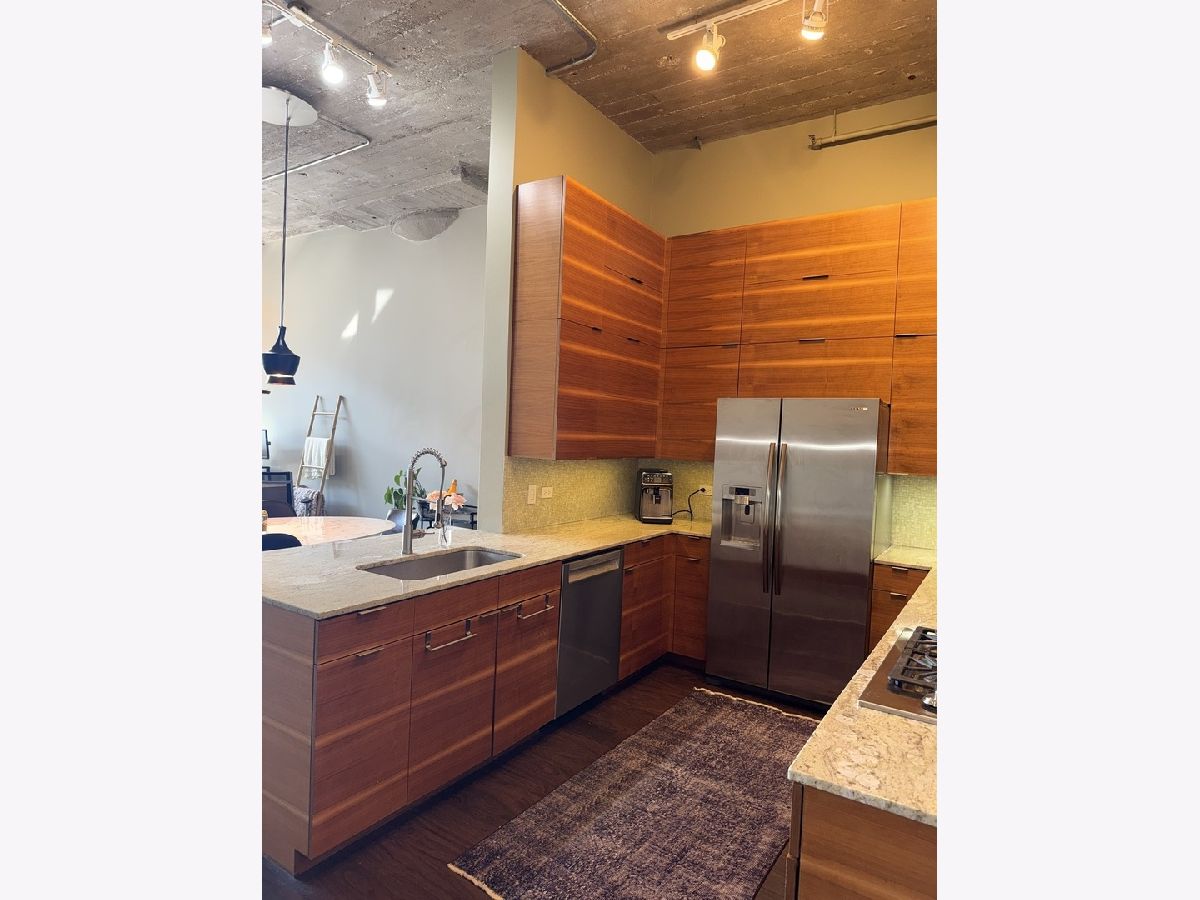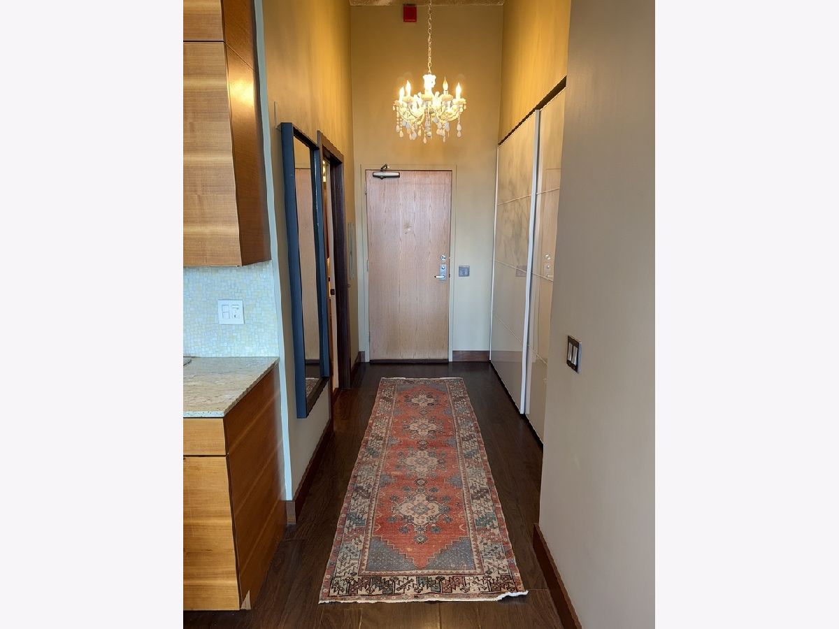 Step into this stunning light-filled 1-bedroom unit at Chess Lofts! South-facing with soaring 12-ft concrete ceilings, exposed brick, huge windows, and dark wide plank floors - this one is not to be missed. Once a 2-bedroom/2-bath, now converted to a 1100 square foot 1-bedroom/2-bath, you will be amazed by how expansive the hosting space is with ample storage throughout- no detail was missed when renovating this unit! Kitchen features custom cabinetry, pull out cabinet drawers, stainless steel appliances (Dishwasher and Microwave updated in 2025), and granite countertops. Entryway includes a completely enclosed custom closet with in-unit W/D. Large dining space with chandeliers throughout. Living space was previously split to include an office. Unique pull-out projector screen from one of the shelves in the living space. Fully-enclosed primary bedroom has blackout shades, beautiful hanging light fixtures, and an ample walk-in closet. Two large full bathrooms with storage. This home is perfect for entertaining with a 100sqft private terrace! The building offers a rooftop deck with incredible city and lake views, a gym, bike storage, package room, and onsite engineer. Parking space additional $30k and includes space for storage bins. HOA assessments include heat, air, cooking gas, water, common area maintenance, scavenger, common area gym, rooftop and package room. Building is PET FRIENDLY and is located next to a dog park, playground, lakefront path, museums, boat harbor, Grant Park, Solider Field, Wintrust Arena and McCormick Place! Ample street parking available, minutes to public transit and dining/entertainment. Investor friendly - no rental cap! Mint condition!