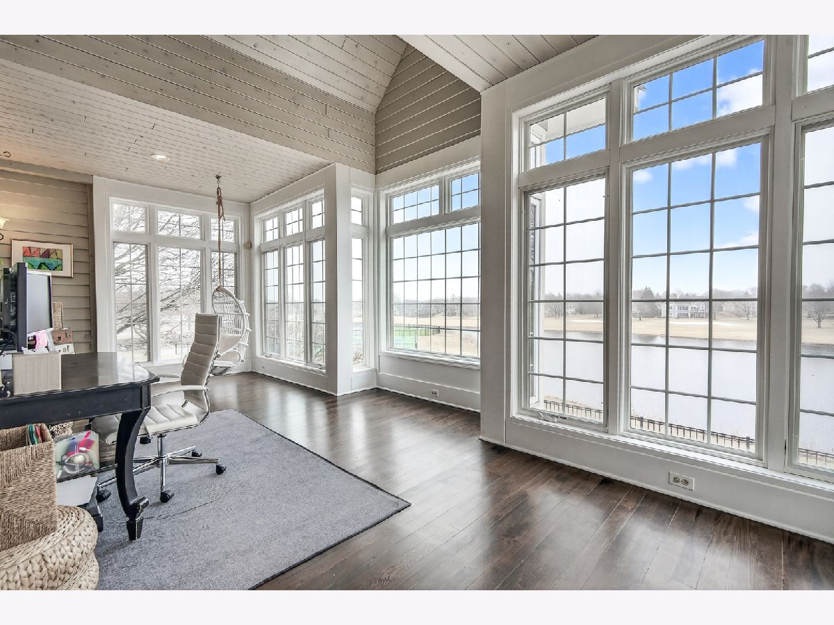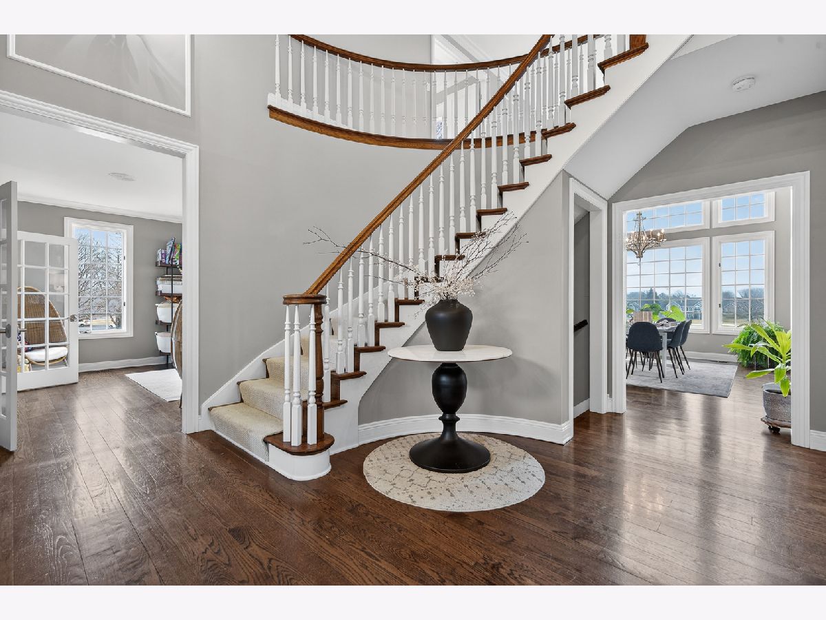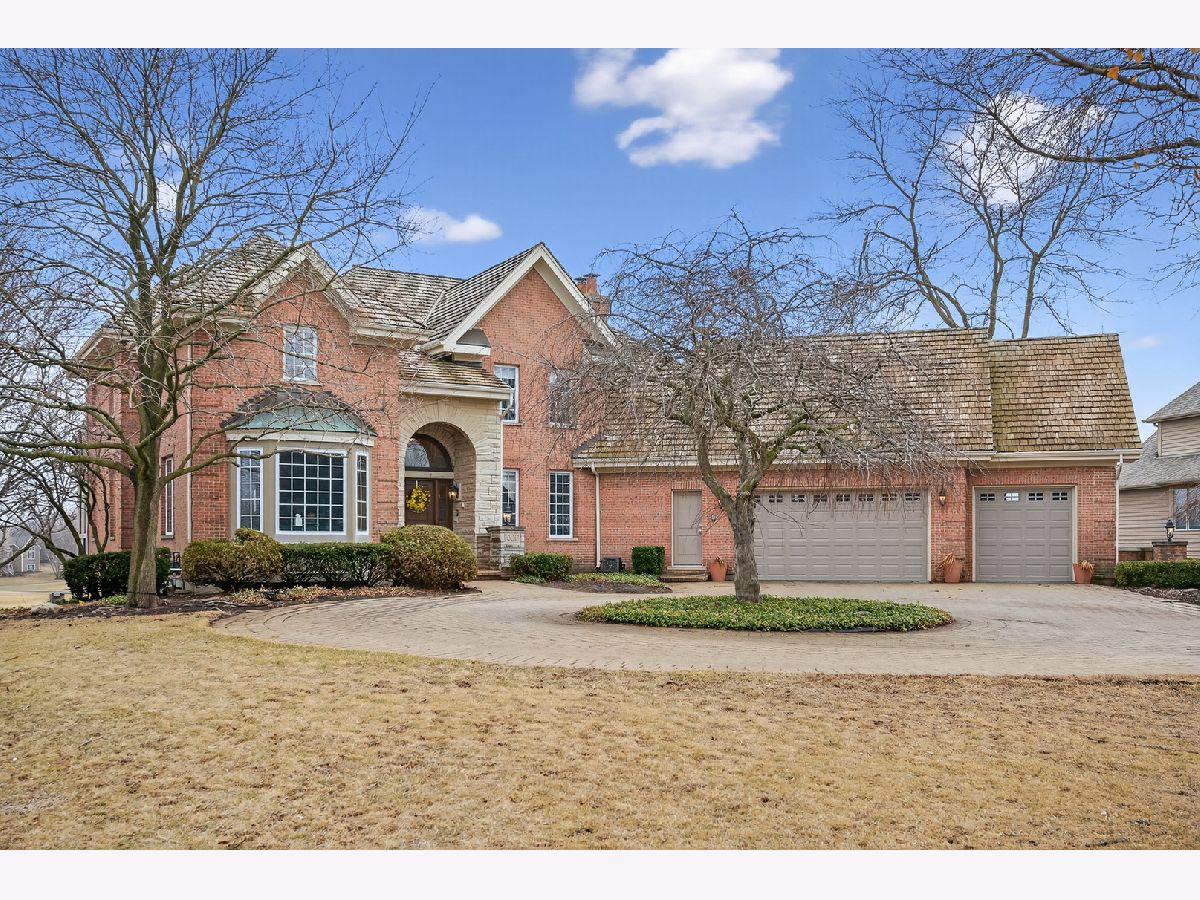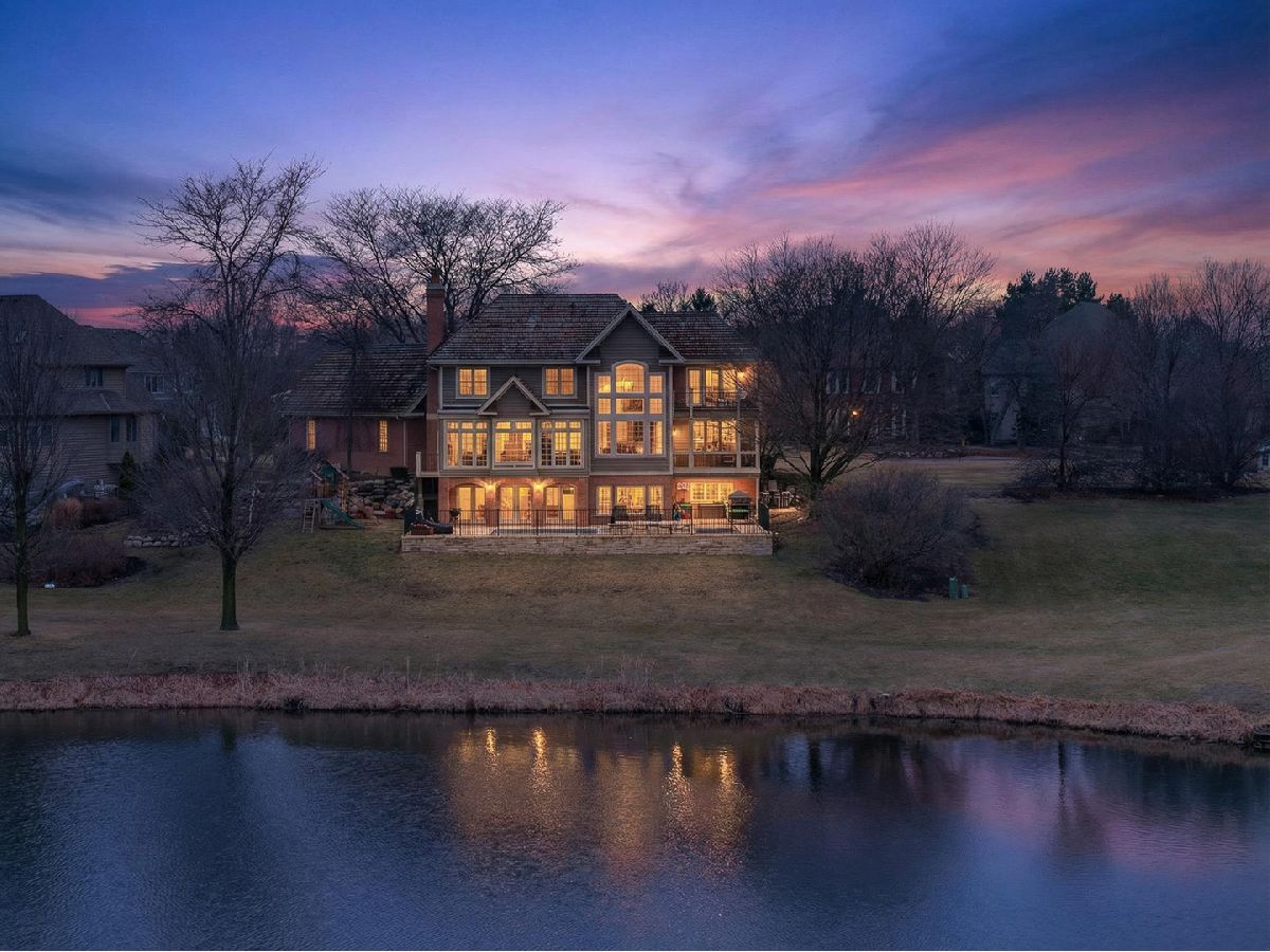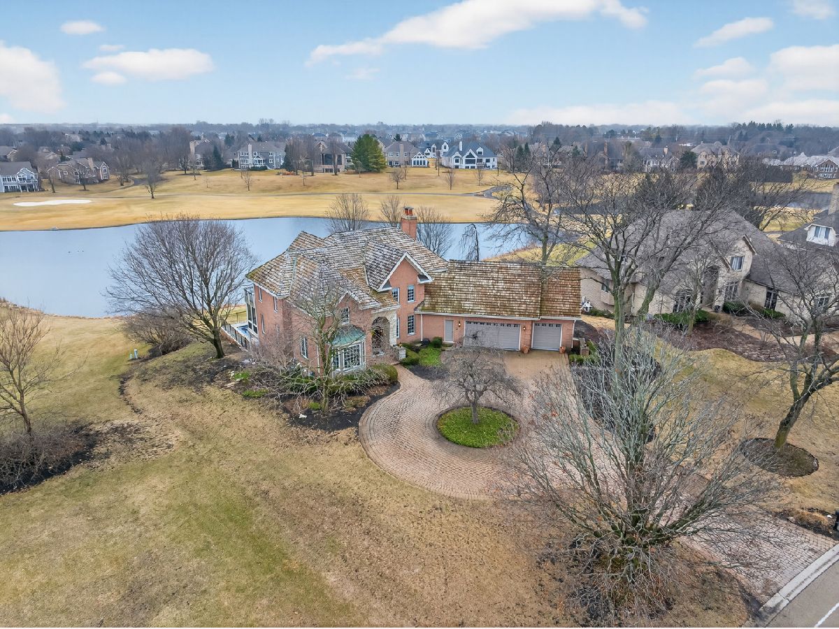 Welcome home to this beautiful estate in Boulder Ridge Country Club, perfectly set along the peaceful lake bordering the 17th and 18th holes and near the clubhouse. A grand foyer with a curved staircase welcomes you inside; hardwood floors and stunning light fixtures set the tone. The remodeled kitchen features custom cabinetry, quartz countertops, and premium Thermador appliances, opening to a warm and inviting family room with a coffered ceiling and beautiful fireplace. A sunroom wrapped in windows showcases breathtaking golf course and water views, creating the perfect spot to unwind. Upstairs, the spacious primary suite offers a private balcony and a spa-like bath with a stand-alone Kohler tub and custom shower. Additional bedrooms are beautifully updated and filled with natural light. The walkout basement is ideal for entertaining or relaxing, featuring a cozy fireplace, custom bar, guest suite, and access to the patio and pool. Outside, your own backyard retreat awaits - complete with a stunning 40x16 fiberglass pool overlooking the lake and golf course. It's the perfect setting for summer gatherings or peaceful evenings at home.