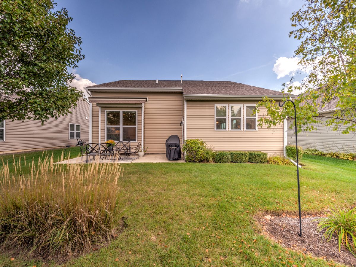 Live the Lifestyle You've Earned in the Grand Dominion 55+ Resort-Style Community. Welcome to this beautifully maintained and thoughtfully upgraded ranch home in the highly sought-after Grand Dominion active adult community. Designed for effortless living and peaceful enjoyment, this light-filled 2-bedroom + den, 2-bath home offers the perfect blend of comfort, style, and convenience. Step inside and be welcomed by an open, airy floor plan featuring beautiful hardwood floors throughout, recessed lighting, and custom window treatments that add a touch of elegance to every room. The east-west exposure fills the home with natural light all day long. The expanded primary suite is a true retreat, featuring a large walk-in closet with built-in organizers, a luxurious en-suite bath with a brand-new custom Kohler walk-in shower with a life-time warranty, and a serene view of your private patio-perfect for morning coffee or evening relaxation. The kitchen is bright and cheerful with white 42" cabinetry, newer pendant lighting above the central island ideal for entertaining family and friends. Step outside to your private patio with sunny western exposure, a lovely space to BBQ, dine alfresco, or unwind under the retractable sun setter awning. Additional highlights include: New AC 2025, Hot water heater 2024, customer Kohler walk-in shower 2024, newer washer and pendent lights, Hardwood flooring 2021, Furnace 2020. Enjoy all that Grand Dominion has to offer-resort-style amenities, walking trails, clubhouse activities, fitness center, indoor/outdoor pool, and a warm, welcoming community of active adults. This is more than just a home-it's a lifestyle. Schedule your private showing today and see why so many are choosing to call Grand Dominion home.