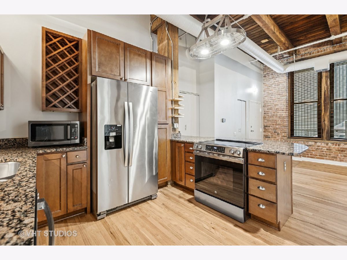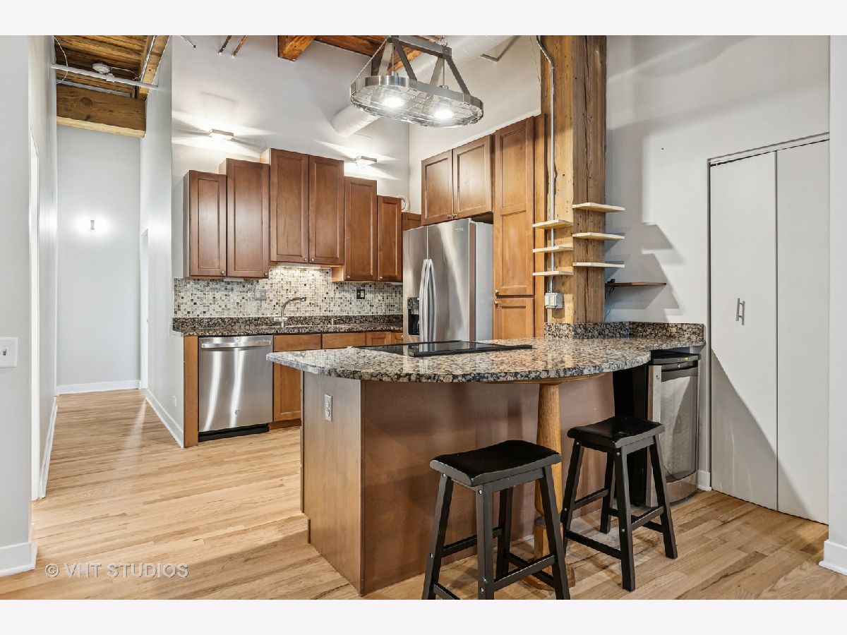 Welcome to this striking 2-bedroom, 2-bathroom timber loft in a boutique elevator building at 331 S Peoria. This spacious and sun-drenched home effortlessly combines industrial character with modern upgrades. Soaring ceilings with exposed wood beams, exposed brick walls, and oversized windows give the space warmth and personality, while hardwood floors run throughout the open-concept layout. The kitchen is outfitted with granite countertops, stainless steel appliances, a center island with breakfast bar seating, and custom cabinetry. A large living area offers the flexibility to create distinct zones for relaxing, dining, or entertaining. The generous primary suite features ample space for a king-sized bed, a walk-in closet with custom shelving, and an en-suite bath with dual vanities and a walk-in shower. The second bedroom also includes great closet space and high ceilings, ideal for guests or a home office. Additional features include in-unit laundry, abundant storage, and central HVAC. Enjoy the convenience of living just steps from the Blue Line, UIC, and all the dining, shopping, and nightlife the West Loop has to offer. Garage parking may be available for rent or purchase. This is the perfect blend of authentic loft style and modern comfort in one of Chicago's most vibrant neighborhoods.