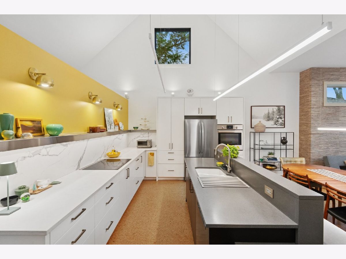 3310 Hayes Street has been completely reimagined by a modernist architectural firm with a full renovation in 2020, while retaining its Midcentury style. Warm cork floors that flow throughout, windows and skylights placed to maximize daylight set the tone for this thoughtfully designed home. Through the well lit foyer the house opens up into a two story vaulted great room. The all new kitchen with Bosch appliances, an induction cooktop, and beautiful recycled glass countertops is anchored by a 13ft island. The spacious dining room flows into the living room with another wall of windows overlooking the professionally landscaped backyard. Toward the back of the home is the primary bedroom which features a bright and roomy ensuite bathroom with heated floors and a custom closet. The second bedroom off the kitchen has its own ensuite bathroom and large closet. The sizable laundry room, conveniently located on the first floor, features a large fireclay utility sink and stackable washer and dryer. Up the skylight light staircase off the kitchen, is the third bedroom, along with an additional loft space perfect for a home office or a future third bathroom. The one car attached garage located in the back of the home off the newly paved alley has a BMW level 2 electric car charging station installed. There is additional parking in the front driveway. Not only does this home honor the modern style while making use of the concepts of universal design, it also incorporates up to date energy efficient heating and cooling systems that provide cost effective and eco-friendly living.
