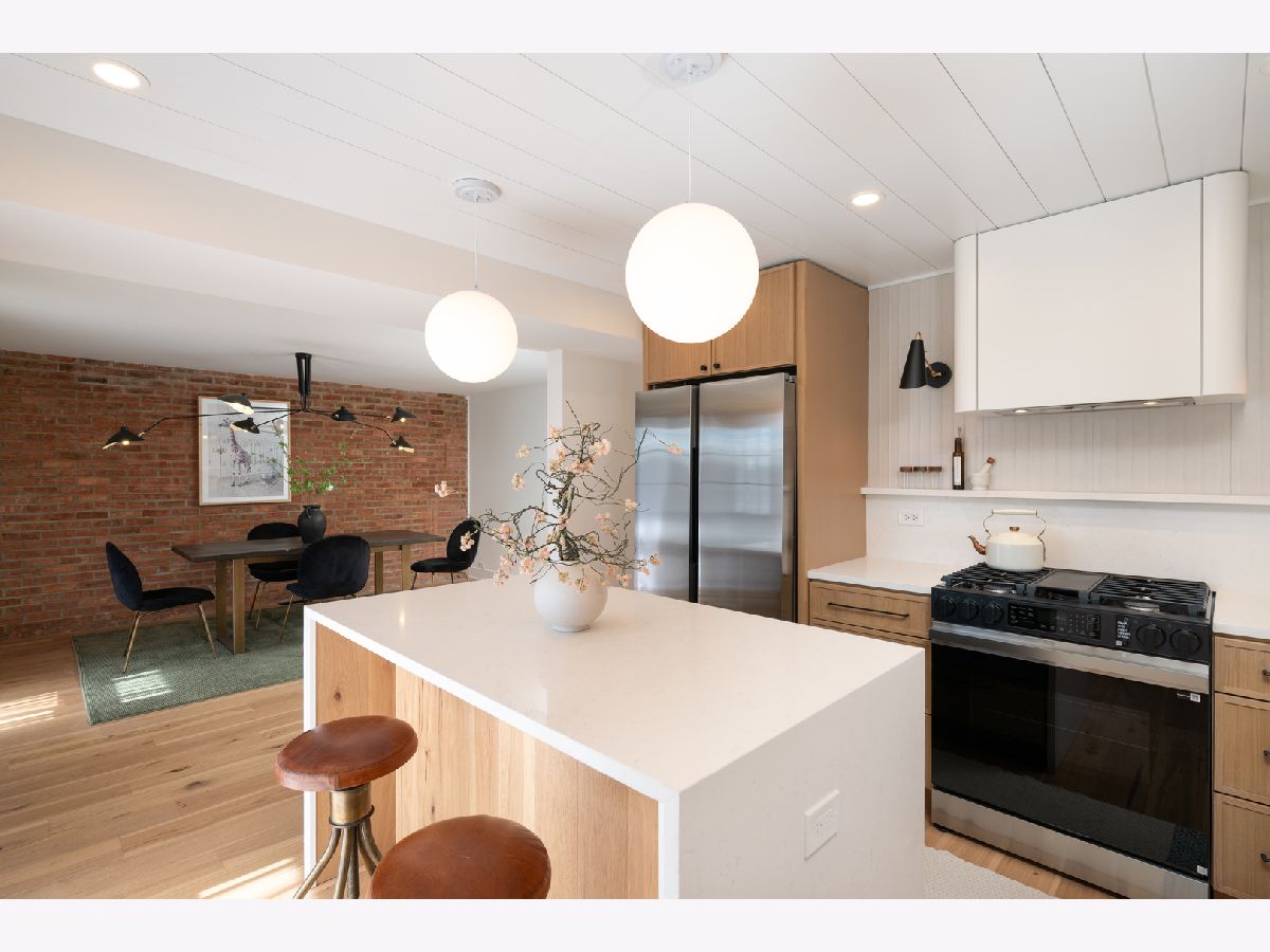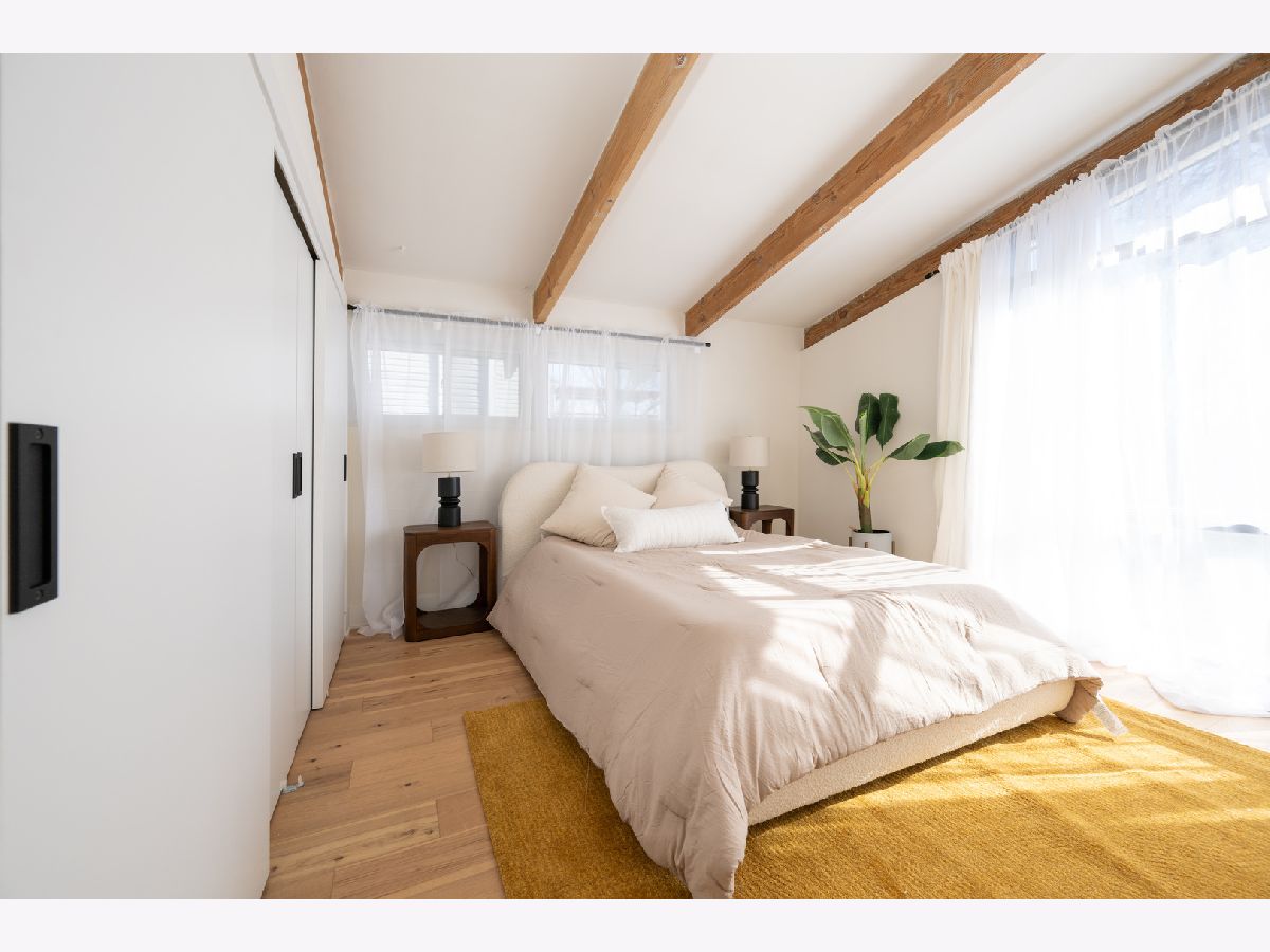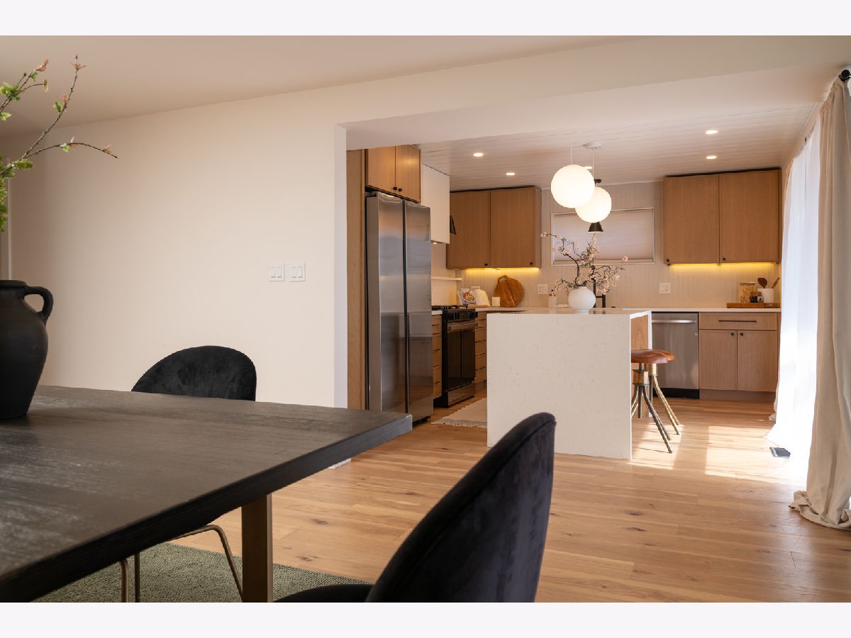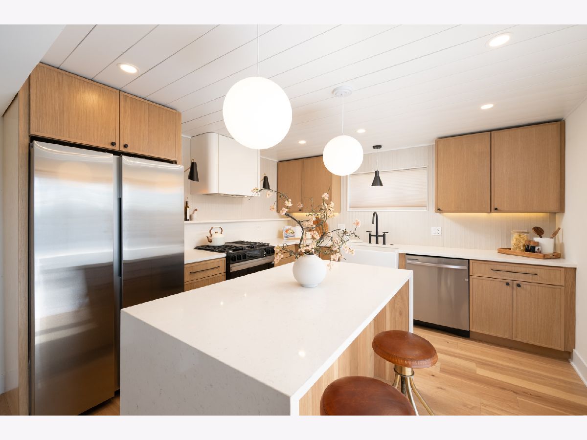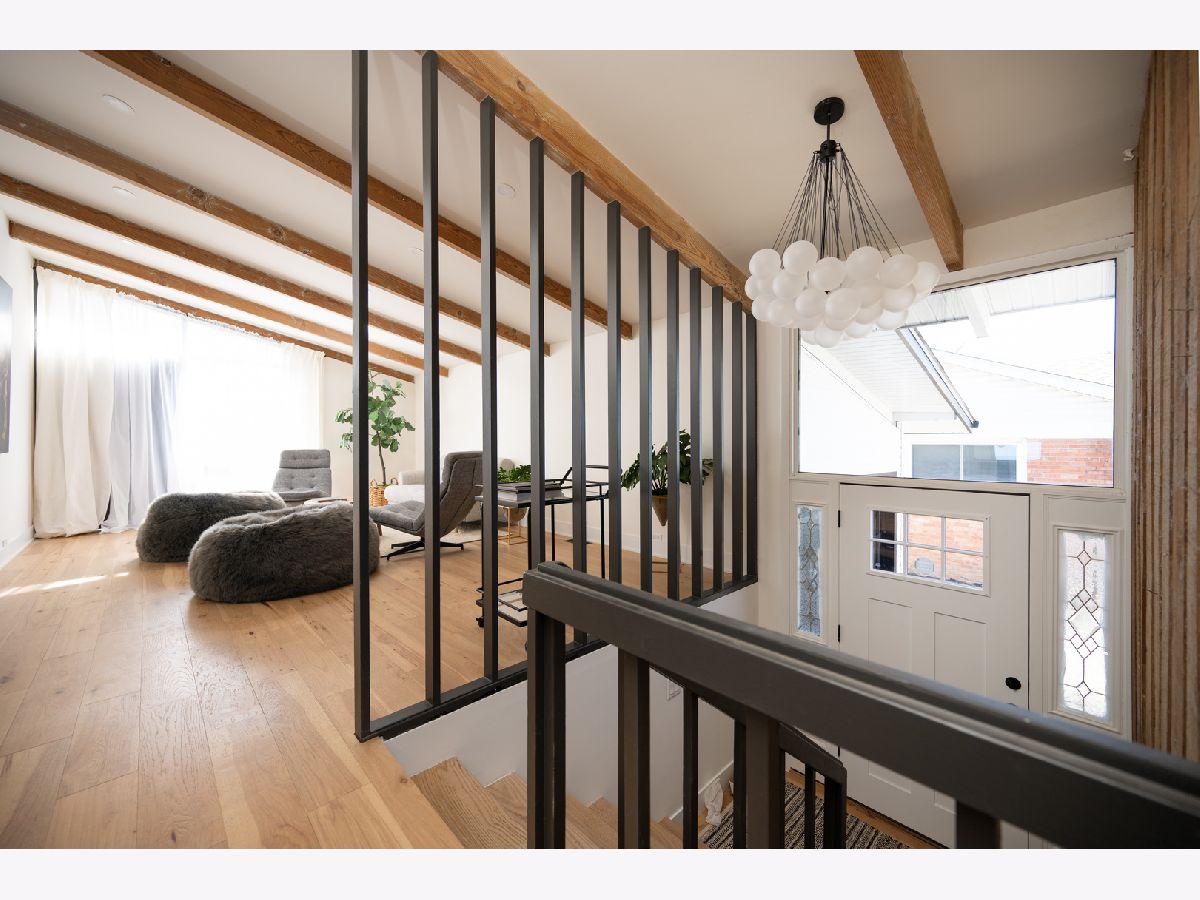 Mid-Century modern reimagined four-bedroom, two-bath raised ranch over 1,800 square feet of thoughtfully designed living space, blending iconic architectural character with contemporary finishes. The main level welcomes you into a dramatic living room highlighted with original wood ceiling beams and expansive floor-to-ceiling windows that flood the space with natural light and open to a private balcony. White oak engineered hardwood flooring runs throughout, complemented by timeless light fixtures and tile selections that honor the home's mid-century aesthetic. The primary bedroom echoes vaulted ceilings and designer lighting, while the upper-level bath showcases a natural and harmonious blend of wood and stone. An additional bedroom and a dedicated office complete the upper level. A statement mid-century-inspired staircase leads to the lower level, where style and functionality continue. The modern kitchen features white oak cabinetry, white quartz countertops, an apron-front sink, center island, shiplap ceiling, custom hood, and designer backsplash. Distinctive lighting adds personality and flows seamlessly into the formal dining area, where a full wall of windows creates a bright indoor-outdoor ambiance. The lower level also includes two additional bedrooms, a spacious laundry room, and a light and airy full bath with contemporary tilework, a vessel vanity sink, and shiplap accent detailing. Set on an oversized lot, the expansive yard offers ample space to create additional outdoor features to suit your vision.