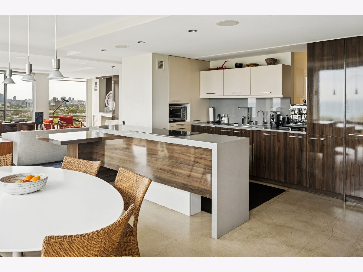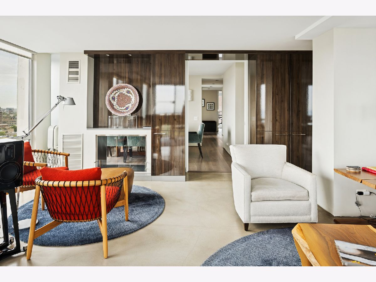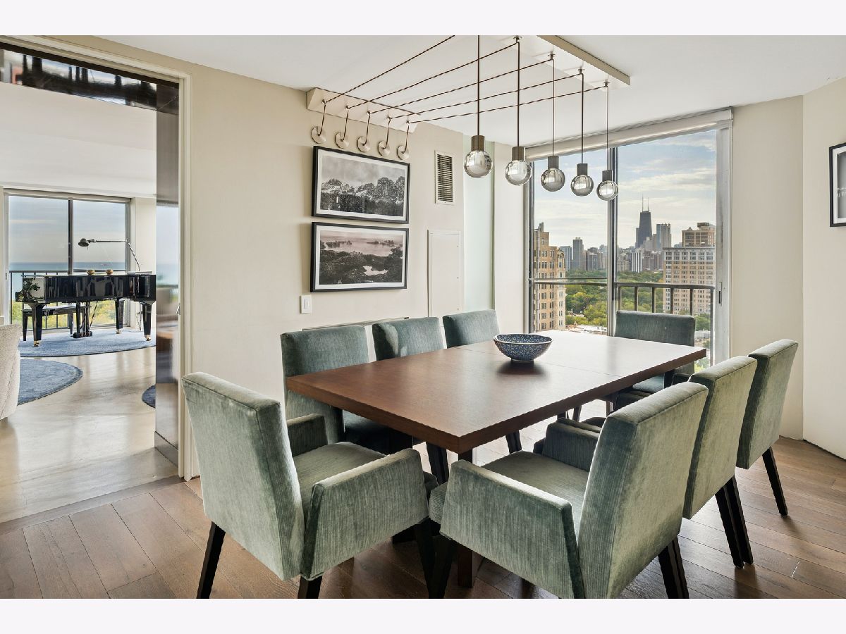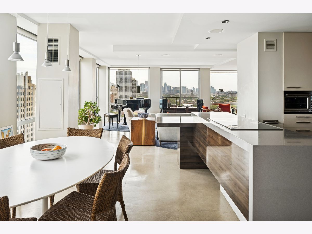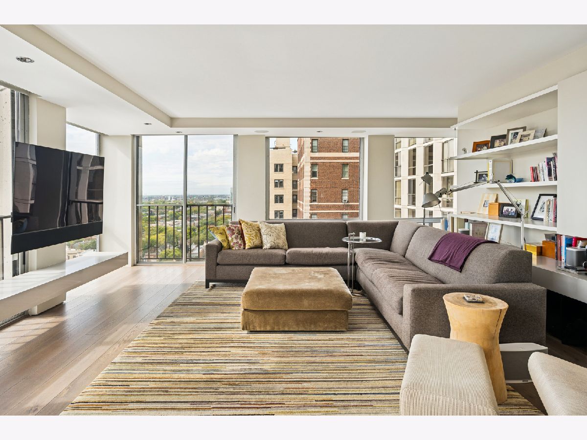 Three condos have been seamlessly combined to create a spectacular 3,350 sq. ft. four-bedroom residence showcasing world-class views of the lake, park, and skyline. This striking contemporary home features a clean, modern design with exceptional flow and generous, flexible living spaces-all framed by floor-to-ceiling windows capturing breathtaking panoramas. Polished concrete and hardwood floors, European-style baths, and designer lighting elevate the aesthetic throughout. The northeast corner living and dining area offers a fireplace, custom built-ins, electric shades throughout and stunning natural light. The chef's kitchen impresses with Leicht cabinetry, Thermador induction cooktop, Bosch dishwasher, Dacor ovens, a breakfast bar, and ample space for a dining table.The luxurious primary suite includes a custom walk-in closet and spa-like bath with wall-mounted Duravit sinks, airjet soaking tub, and steam shower. Additional highlights include three more bedrooms and baths, a family room, a den/office, and in-unit laundry. Valet and self-parking available. Ideally located within the highly sought-after Lincoln Elementary School District.