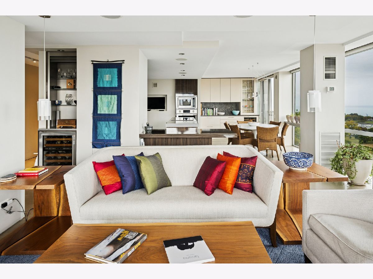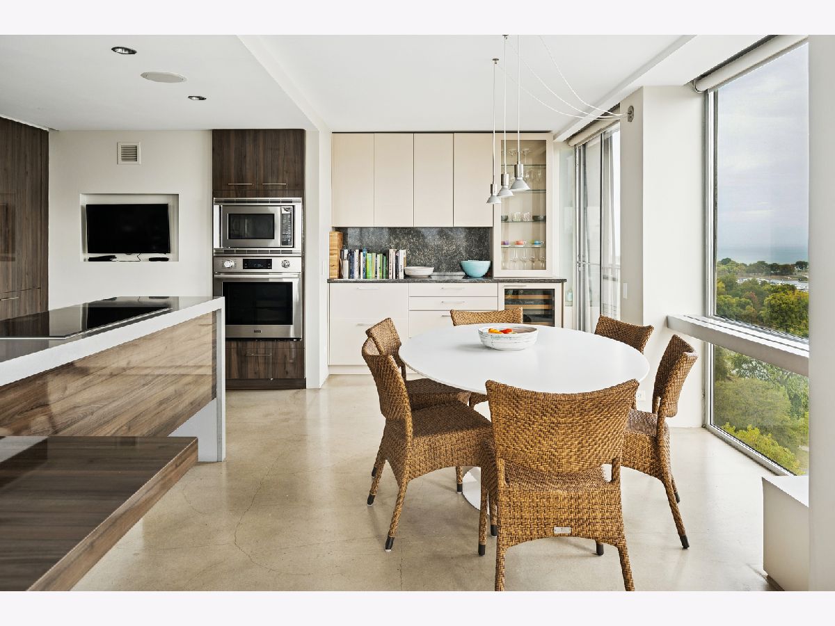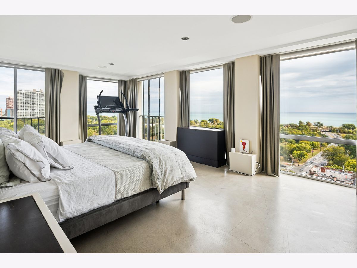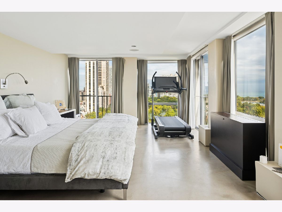 Three condos have been seamlessly combined to create a spectacular 3,350 sq. ft. four-bedroom residence showcasing world-class views of the lake, park, and skyline. This striking contemporary home features a clean, modern design with exceptional flow and generous, flexible living spaces-all framed by floor-to-ceiling windows capturing breathtaking panoramas. Polished concrete and hardwood floors, European-style baths, and designer lighting elevate the aesthetic throughout. The northeast corner living and dining area offers a fireplace, custom built-ins, electric shades throughout and stunning natural light. The chef's kitchen impresses with Leicht cabinetry, Thermador induction cooktop, Bosch dishwasher, Dacor ovens, a breakfast bar, and ample space for a dining table.The luxurious primary suite includes a custom walk-in closet and spa-like bath with wall-mounted Duravit sinks, airjet soaking tub, and steam shower. Additional highlights include three more bedrooms and baths, a family room, a den/office, and in-unit laundry. Valet and self-parking available. Ideally located within the highly sought-after Lincoln Elementary School District.