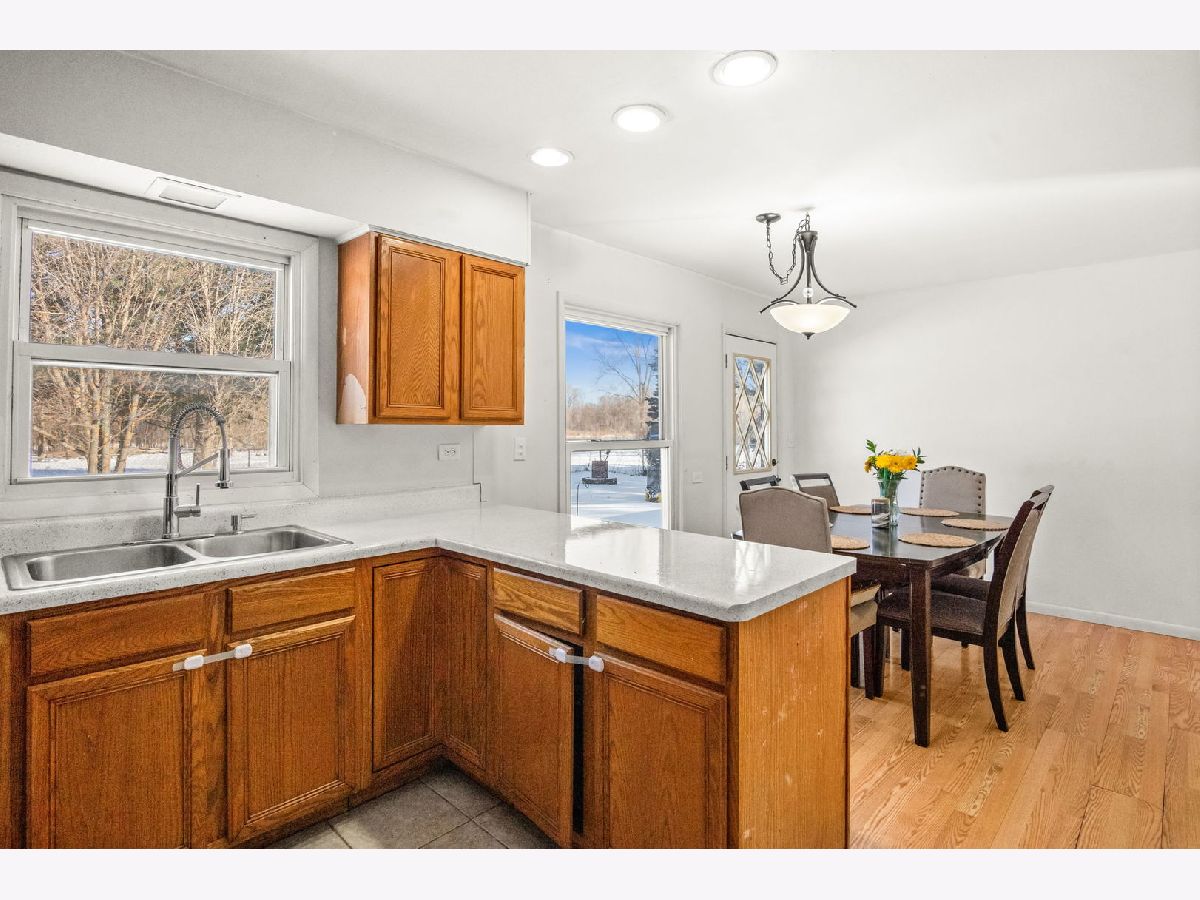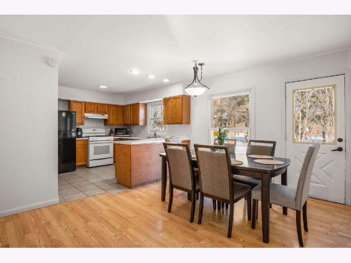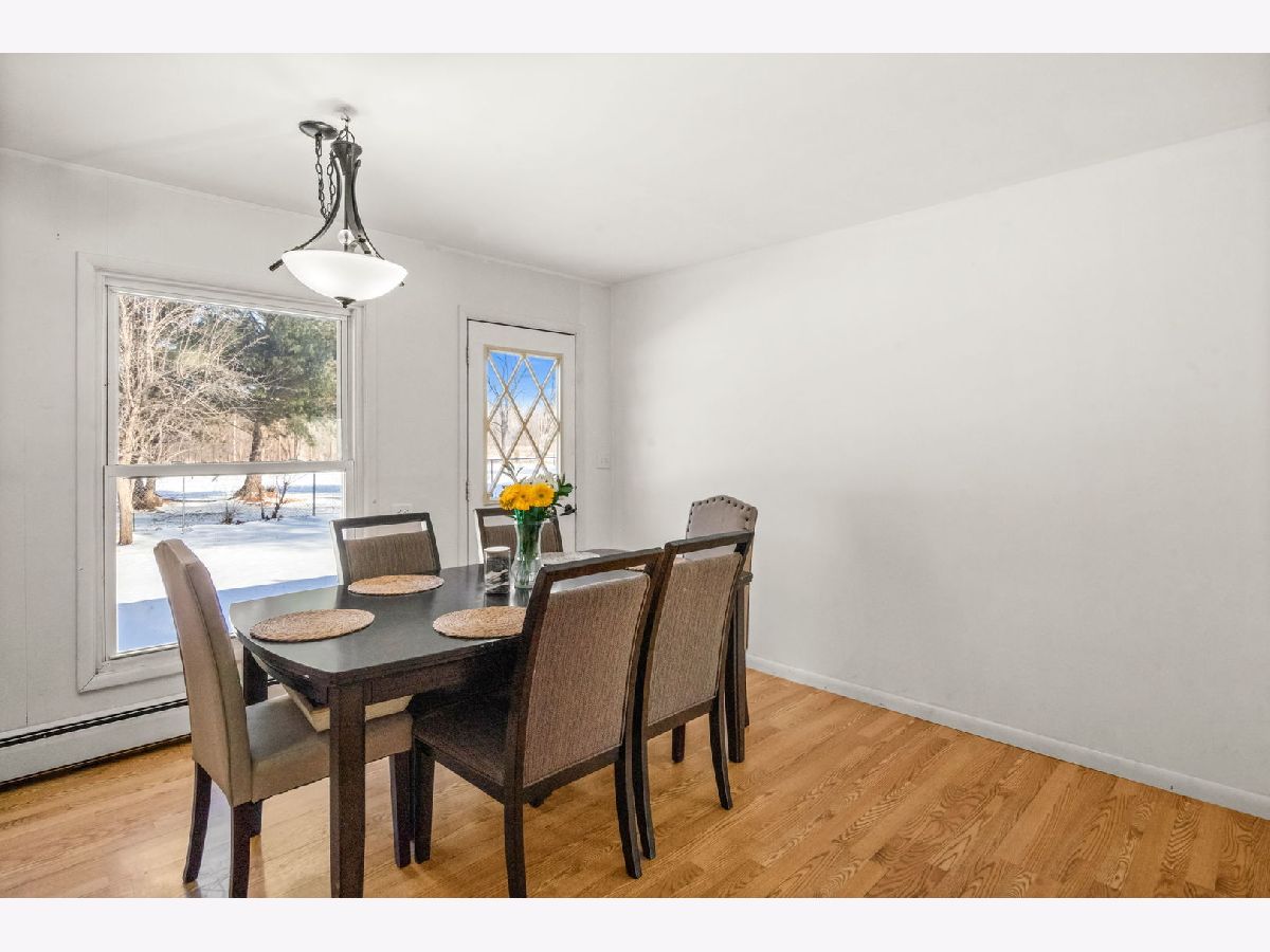 This well maintained 4 bedroom, 2 bath ranch in Marengo offers comfortable one level living on a large fenced lot with mature trees, perfect for relaxing or entertaining outdoors. A covered front porch sets a welcoming tone, while the 2 car attached garage and storage shed add everyday convenience. Inside, hardwood and wood laminate flooring run throughout most of the home, complemented by recessed lighting for a bright, modern feel. The inviting living room flows into a kitchen with tile flooring and a separate breakfast room, where a door leads directly to the backyard for easy indoor outdoor living. Four generously sized bedrooms provide flexible space, including a primary suite with a private bath and lighted ceiling fan. With a vinyl exterior, roof and boiler replaced in 2018, and a new water heater in 2025, this home delivers both value and peace of mind in a quiet Marengo setting.