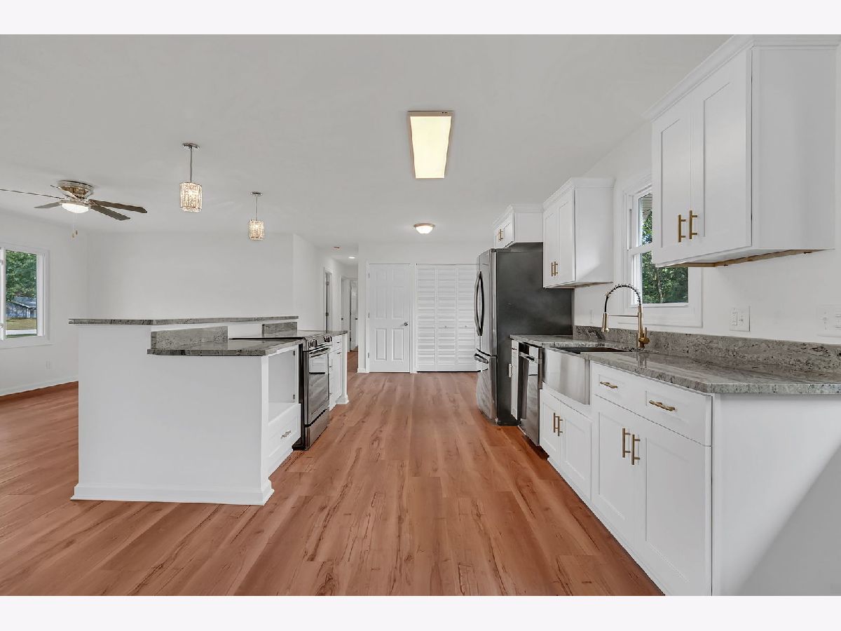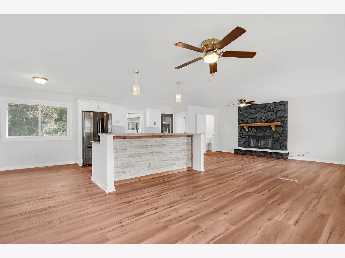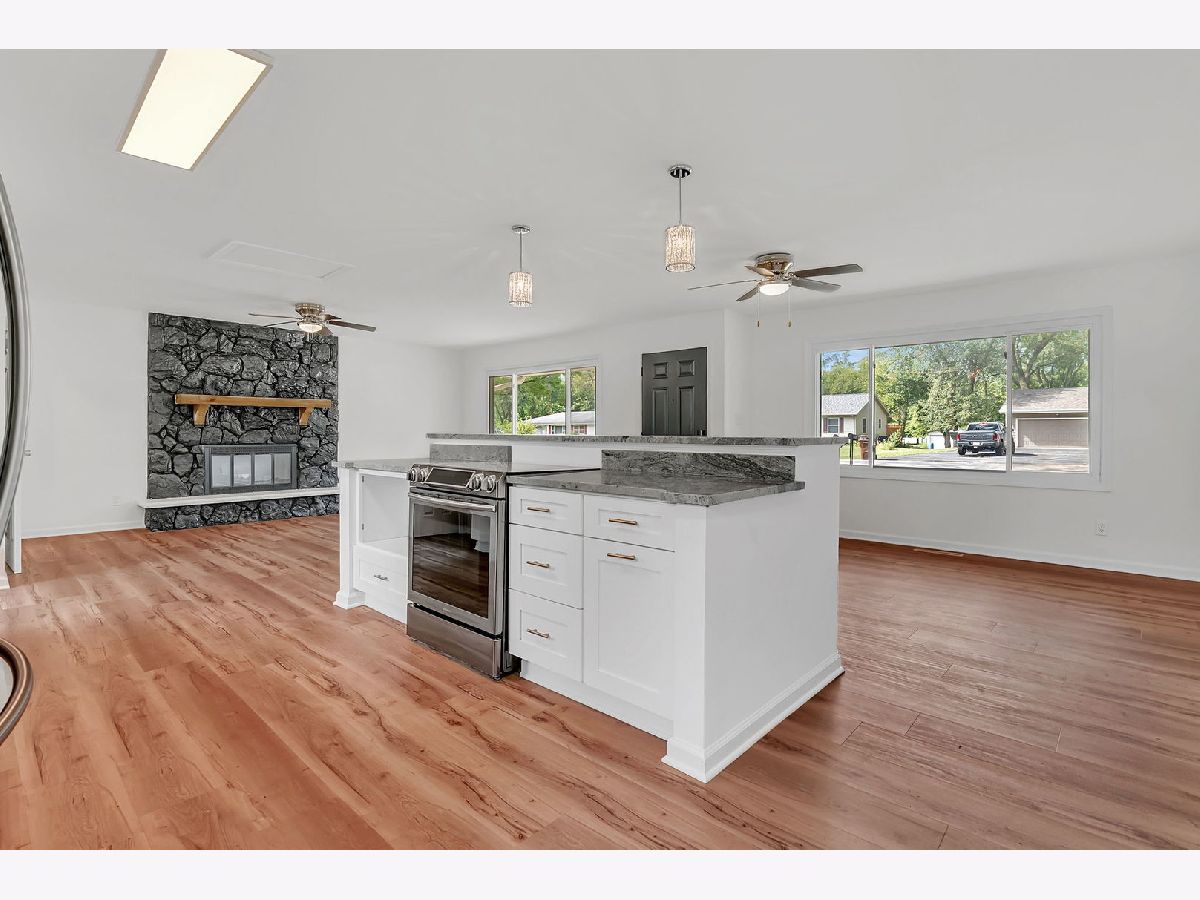 This beautifully updated 3-bedroom, 1.5-bath home has been fully renovated in 2025 and is truly move-in ready. The open floor plan features a stunning kitchen with a large island offering bar seating, a farmhouse sink, brand-new soft-close cabinetry, and modern fixtures throughout. All major appliances, including stove, refrigerator, dishwasher, washer, and dryer, are included. The living room is anchored by a charming fireplace, creating a warm and inviting atmosphere. Both bathrooms have been fully remodeled with contemporary finishes. Enjoy additional living space with a versatile three-seasons room/sunroom off the garage and relax outdoors on the covered deck. The property also includes a storage shed and sits on a spacious half-acre lot, perfect for entertaining or outdoor activities.