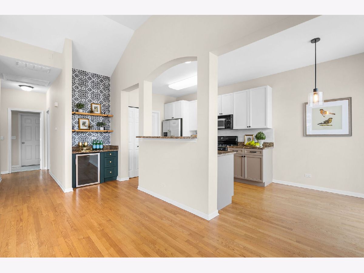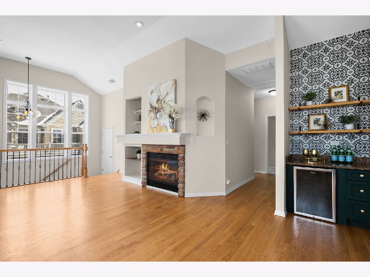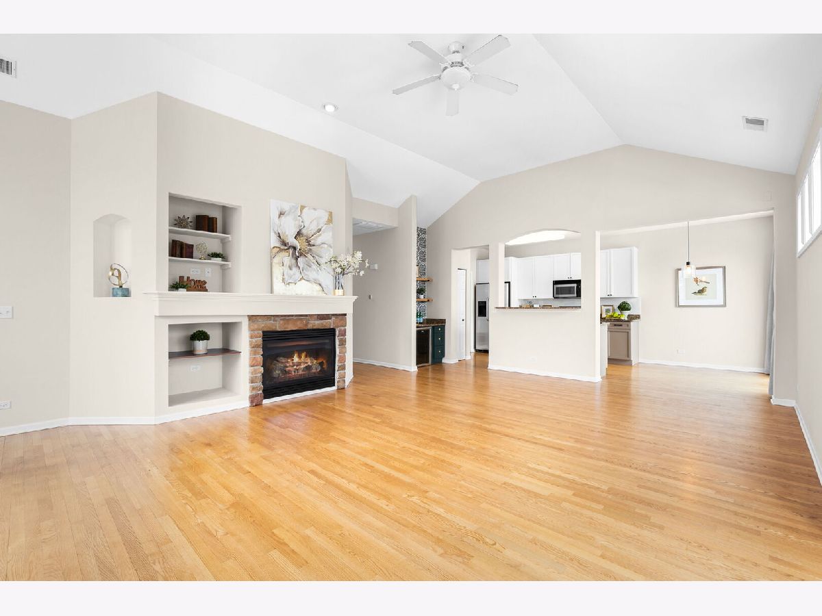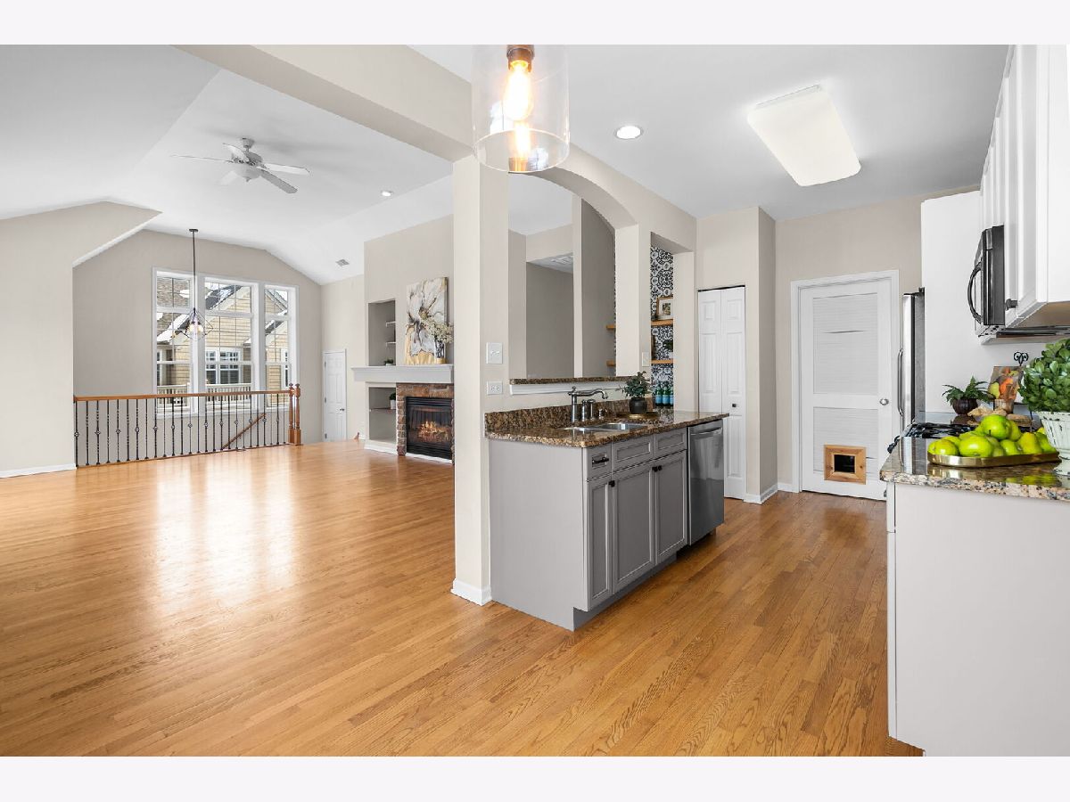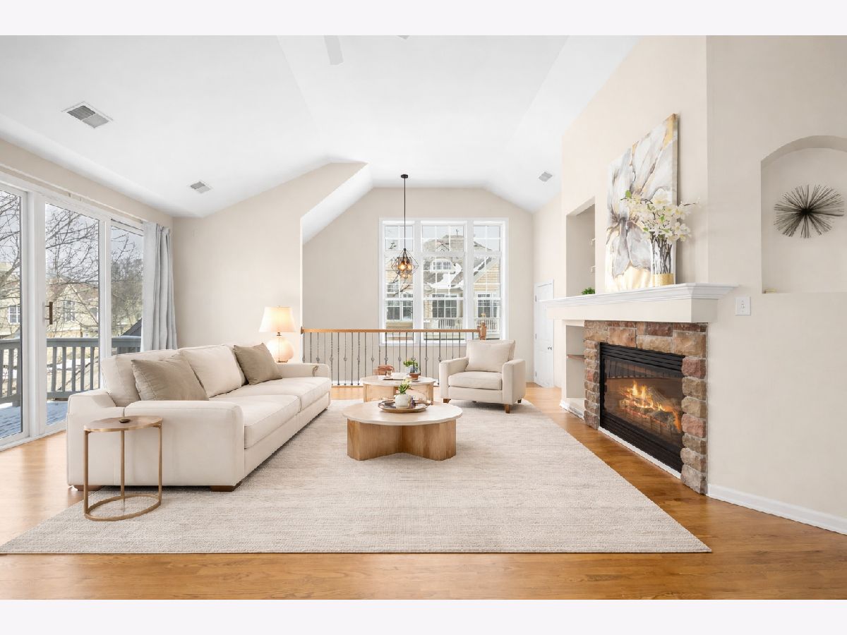 Welcome to this beautifully designed loft-style home in the sought-after lakefront community of Sunset Ridge, where comfort meets style and scenic views of Bangs Lake set the tone. This home offers the convenience of a direct-entry garage and an open, airy layout filled with natural light. The living room makes a striking impression with hardwood flooring, a vaulted ceiling, and elegant iron baluster railings. A gas log fireplace with a built-in media and art niche-plus a wine cooler-adds both warmth and function, creating the perfect space to relax or entertain. The open-concept design flows effortlessly into the kitchen and dining area. The kitchen features granite countertops, stainless steel appliances, a built-in dry bar with beverage refrigerator, and a comfortable dining space ideal for everyday living. Sliding doors from both the living room and dining area lead out to a spacious deck with new Trex decking (2024), offering the perfect spot to take in peaceful lake views. The primary suite is a true retreat, complete with a walk-in closet and an updated en-suite bath featuring dual vanities, a soaking tub, and a separate shower. A generously sized second bedroom, full hallway bath, in-unit laundry, and additional storage provide both flexibility and convenience. Major updates include a newer HVAC system (2022). Residents of Sunset Ridge enjoy access to private community amenities, including a beach, boat slips, and kayak storage available for lease through the association. Ideally located near Route 12 and Route 176, this home offers quick access to shopping, dining, and outdoor recreation.