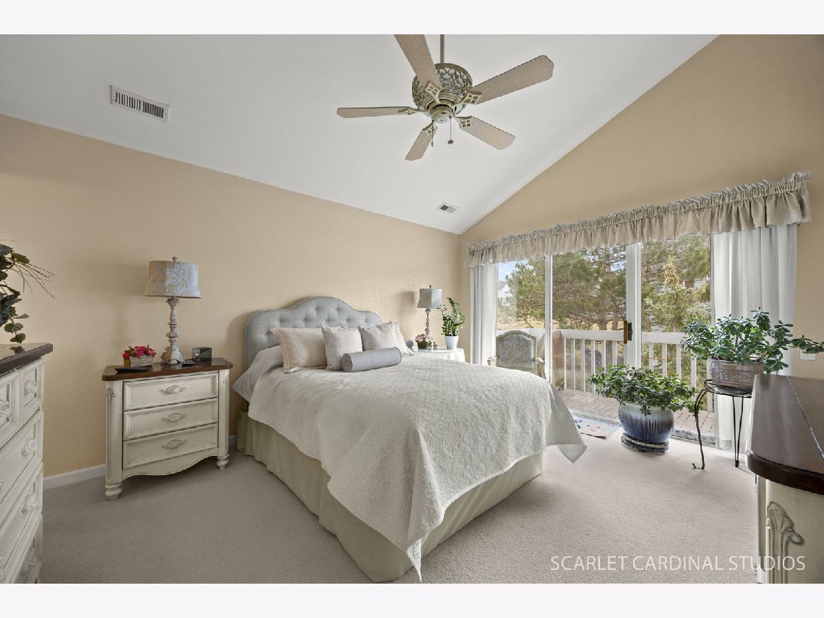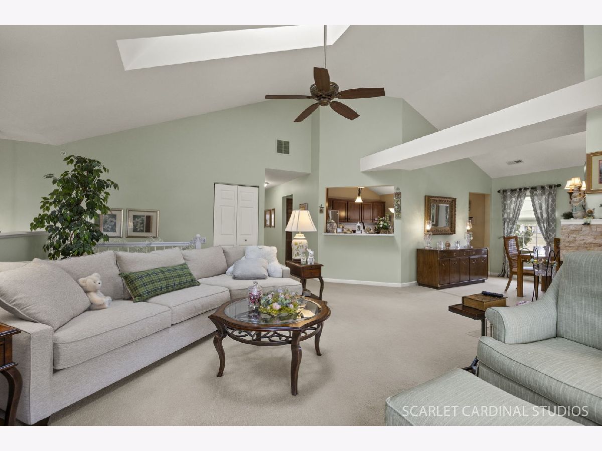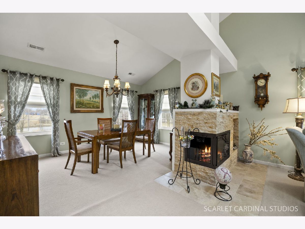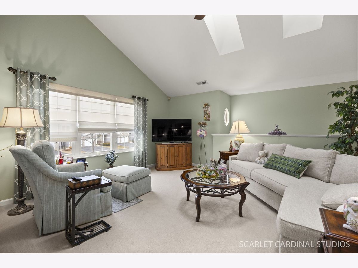 Beautiful end unit is updated throughout! Enjoy the prime location offering views of pond, fountain & gazebo. Stunning open floor plan boasts living room with vaulted ceiling and two skylites, refinished gas fireplace, and leads to separate dining room with neutral decor. Huge master bedroom features updated luxury bath (large vanity is actually plumbed for two sinks), walk-in closet, and balcony. Sunny eat-in kitchen has loads of cabinets, granite counters, and opens to living room. Convenient laundry room offers full size washer and dryer plus additional storage.Two car attached garage has ramp into home, and stairway from foyer has chair lift. Updates include new windows (2021), fireplace(2024), dishwasher(2022), master bath(2019), kitchen counters(2019), roof and skylights(2014), furnace(2014). Located close to 355 and I88, shopping and restaurants, this home has it all! Balcony to be replaced this spring with special assessment paid at closing.