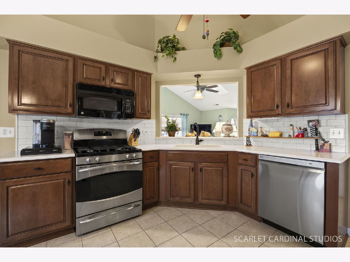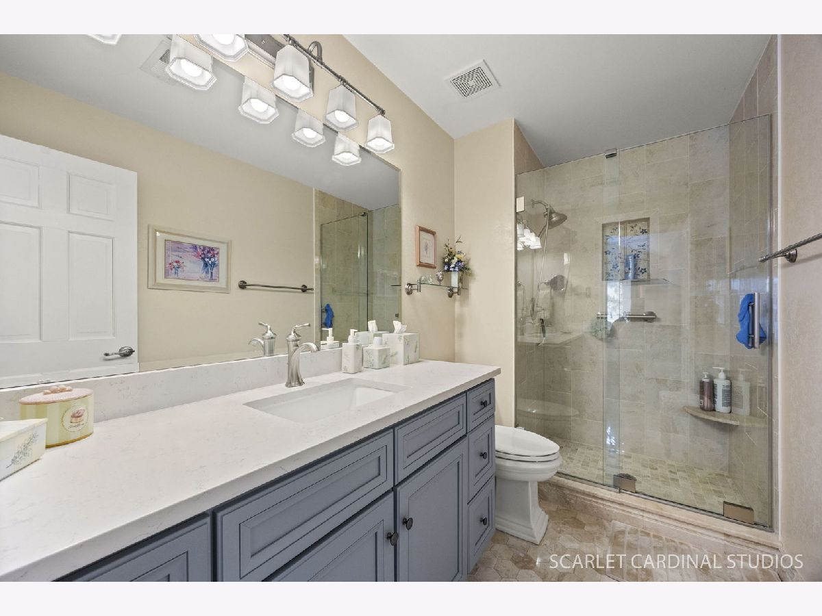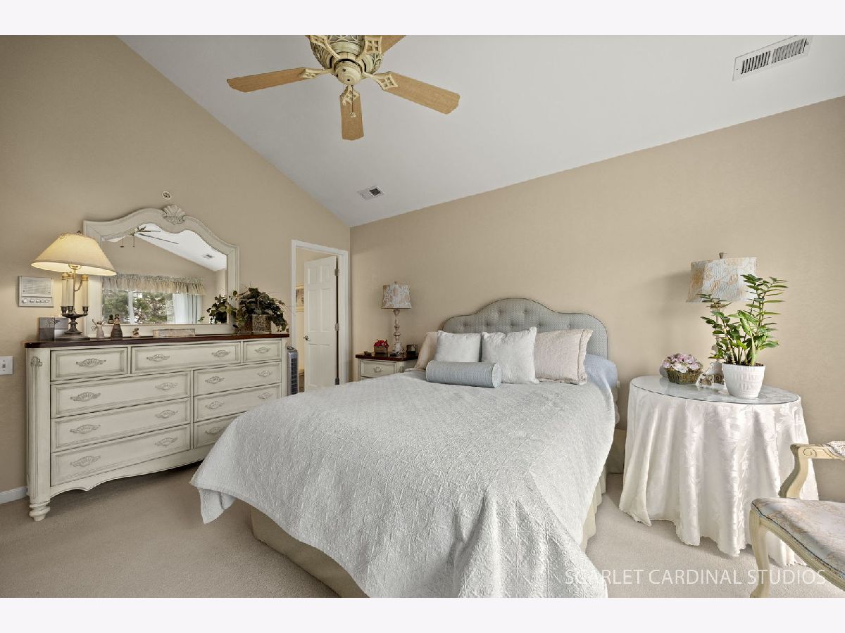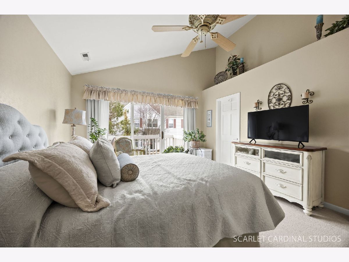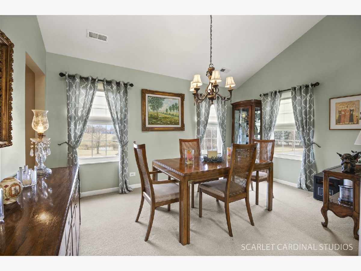 Beautiful end unit is updated throughout! Enjoy the prime location offering views of pond, fountain & gazebo. Stunning open floor plan boasts living room with vaulted ceiling and two skylites, refinished gas fireplace, and leads to separate dining room with neutral decor. Huge master bedroom features updated luxury bath (large vanity is actually plumbed for two sinks), walk-in closet, and balcony. Sunny eat-in kitchen has loads of cabinets, granite counters, and opens to living room. Convenient laundry room offers full size washer and dryer plus additional storage.Two car attached garage has ramp into home, and stairway from foyer has chair lift. Updates include new windows (2021), fireplace(2024), dishwasher(2022), master bath(2019), kitchen counters(2019), roof and skylights(2014), furnace(2014). Located close to 355 and I88, shopping and restaurants, this home has it all! Balcony to be replaced this spring with special assessment paid at closing.