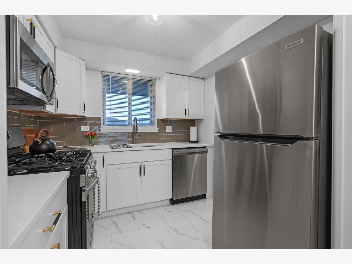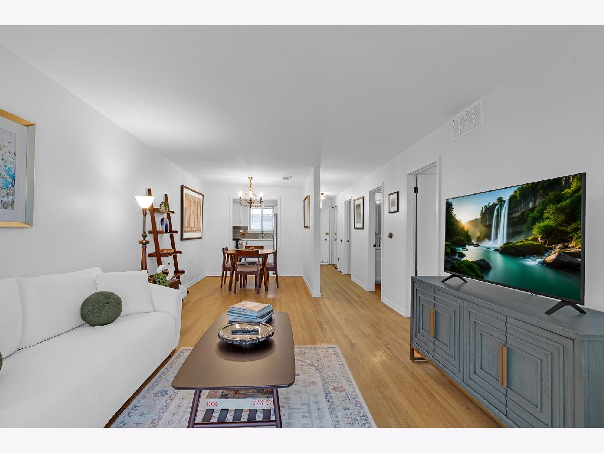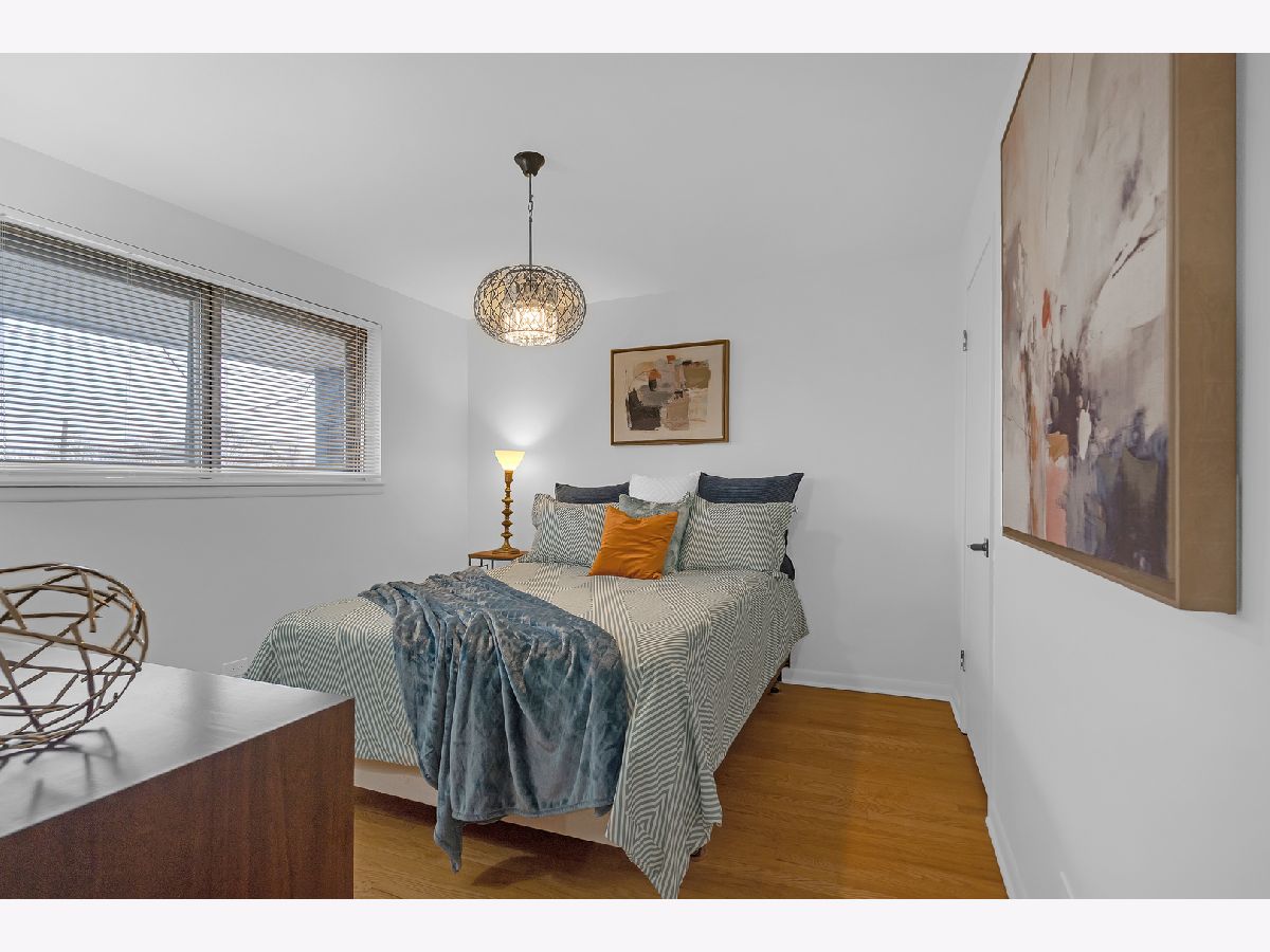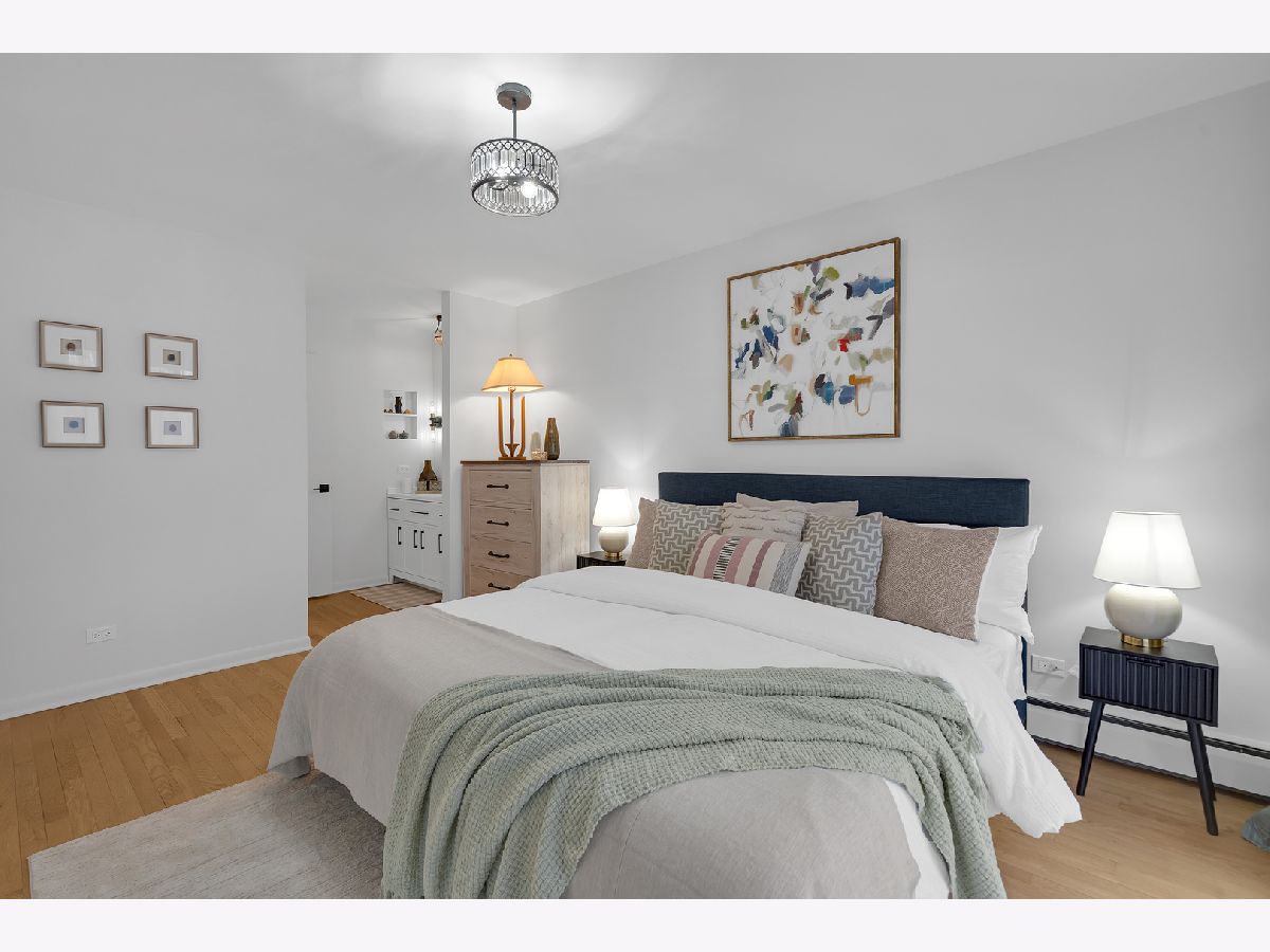 Top floor, sunny, freshly updated two bedroom in booming Portage Park. Open floor plan includes a separate dining area off a new, modern kitchen with white shaker cabinets, sharp backsplash, quartz counters, and Frigidaire stainless steel appliances. Stylish bath with two separate vanities. Hardwood floors have been refinished throughout, all lighting and plumbing fixtures are updated. Huge primary bedroom has abundant closet space and access to a balcony overlooking a private courtyard. Large second bedroom has a spacious walk in closet. Well run 24 unit building with laundry room on premises, large storage locker and a parking space(#7) included. Heat, hot water and cooking gas included in a very reasonable assessment(no People's Gas bill). This spacious home is like new and move in ready, you will love it!