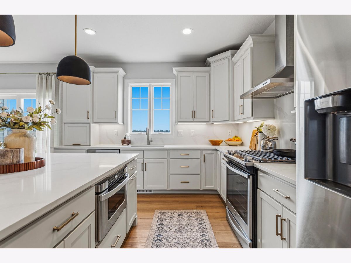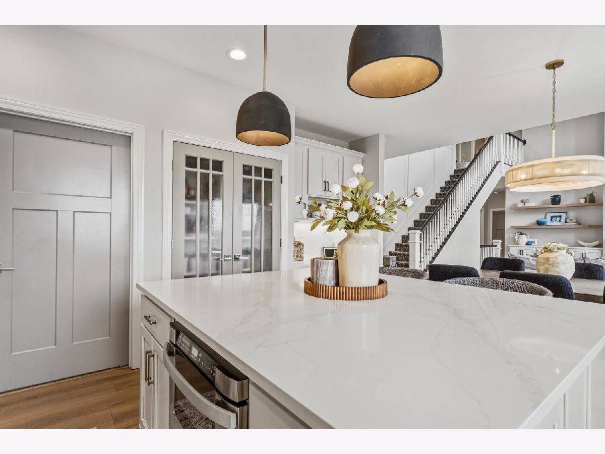 Located in Liberty on the Lake and built by Timber Creek, this stunning home stands out for its quality construction, thoughtful updates, and generous space throughout. The two-story living room makes an immediate impression with soaring ceilings, abundant windows, and a dramatic floor-to-ceiling fireplace with a Roman clay finish, along with built-in cabinetry and open shelving for both function and display. The kitchen has been beautifully updated with matching quartz countertops and backsplash, a large oversized island with new pendant lighting, and a convenient built-in desk workspace with additional cabinetry. Brand new hardwood flooring extends across the main level, and plantation shutters add a timeless touch throughout the home. A formal dining room with tray ceiling and board and batten detailing provides an elegant space for gatherings, and the laundry and mudroom drop zone just off the garage entry includes a sink for added everyday convenience. The first-floor primary suite is a true retreat with a large walk-in closet plus two additional closets, dual vanities, a walk-in shower, and a separate whirlpool tub. Upstairs, you'll find three generously sized bedrooms and a large bathroom with dual vanities, along with a landing that overlooks the living room below. The finished basement expands the living space even further with a bright rec room featuring daylight windows, two additional bedrooms, and a full bathroom. Outside, the fully fenced backyard includes a hot tub and backs to open fields for added privacy, while the front of the home faces Henry Michael Park with a playground, basketball court, and wide open green space. With large rooms throughout and no shortage of living space, this home is both impressive and comfortable in all the right ways.
