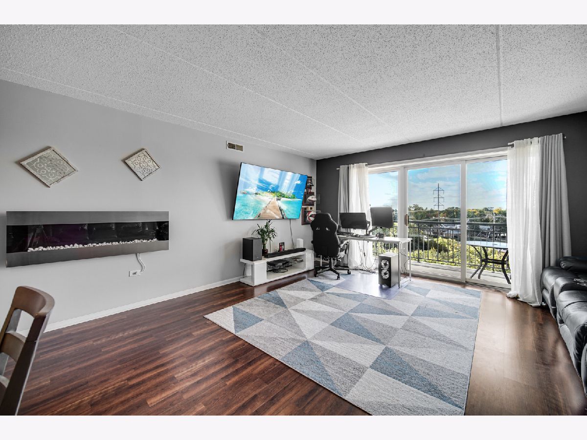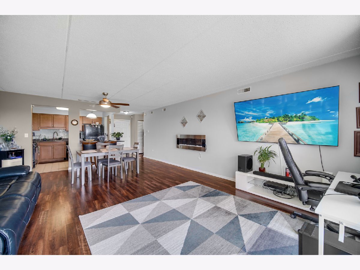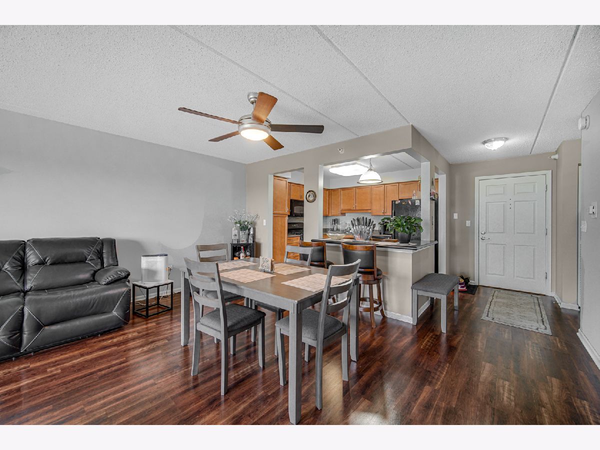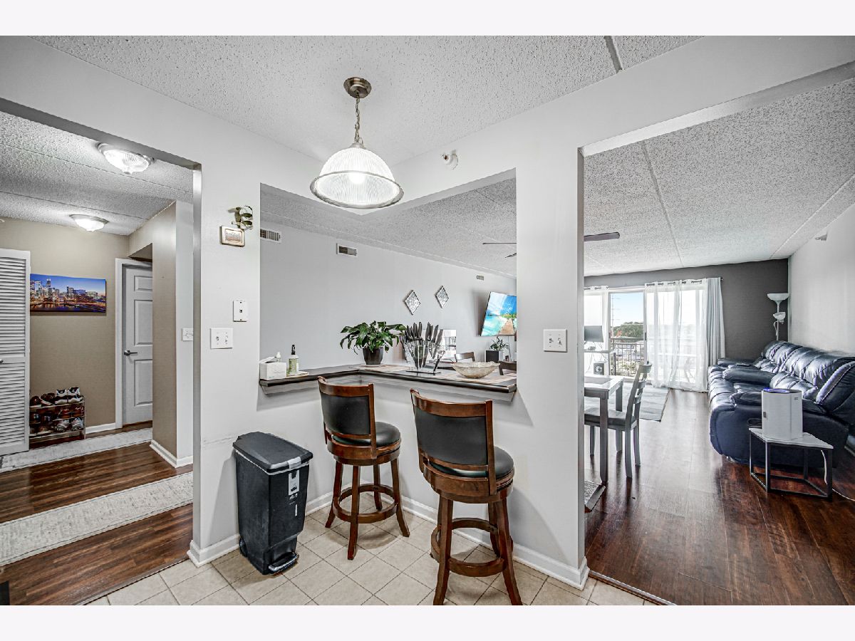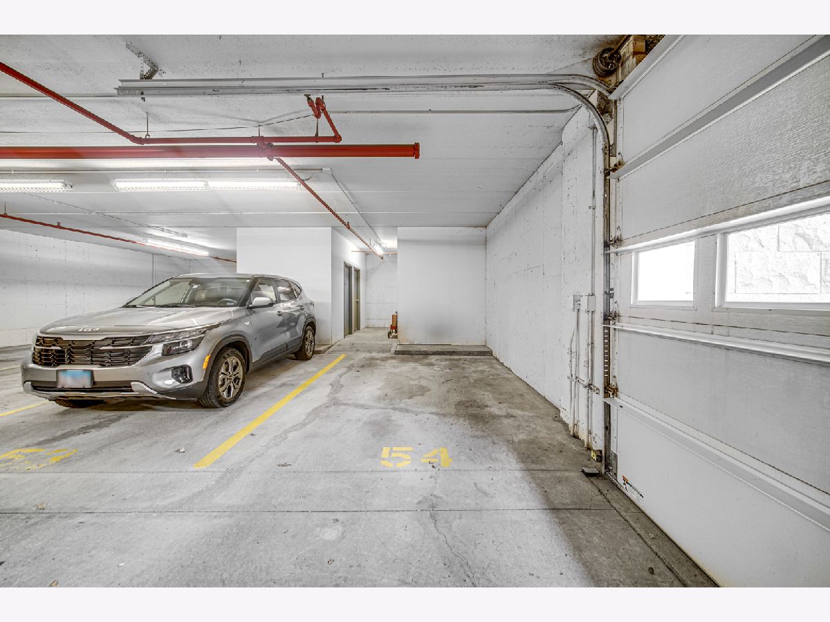 Rarely available spacious one bedroom 6th floor condo at the popular Stonegate subdivision; move in ready. Bedroom has walk in closet as well as additional closet space. In unit full size washer and dryer, plus storage space, central air conditioning and long sunny balcony with southwest views. Open floor plan with eat in kitchen. The heated end unit garage space (#54) is close to the garage entrance and next to a private, secured large and tall storage room. Additional outdoor parking space is also available. Lovely complex with gazebo park. Located in downtown Des Plaines, near library, theatre, city hall, grocery, and restaurants. Close To O'Hare airport, Rosemont Fashion Outlets, Metra, Close to city and surrounding suburbs. Pet friendly building, up to two pets. Owner occupied building. Assessments include cable and internet, and all utilities, except electric. Professionally managed building.